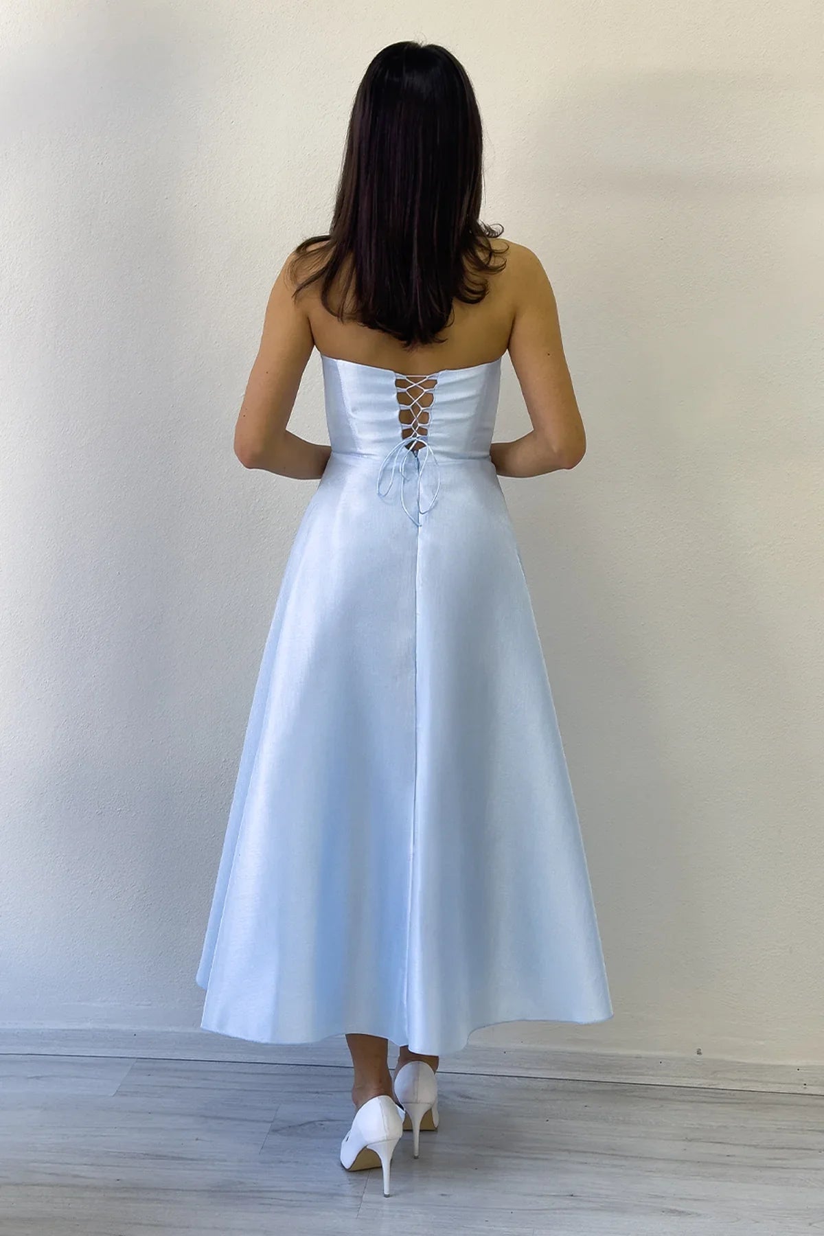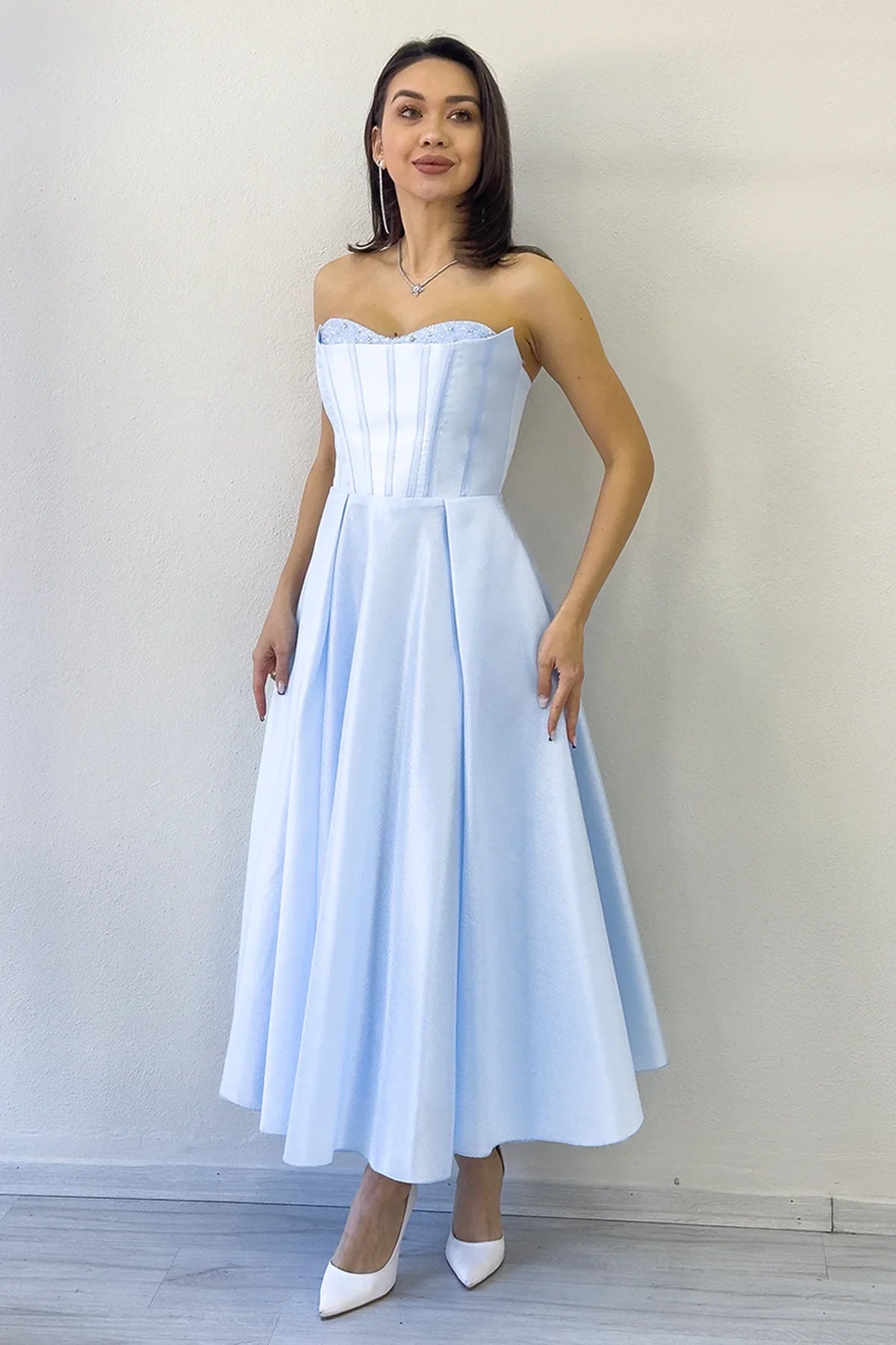 Bebe Mavi Boncuk İşlemeli Straplez Korse Görünümlü Midi Boy Prenses Abiye Elbise
