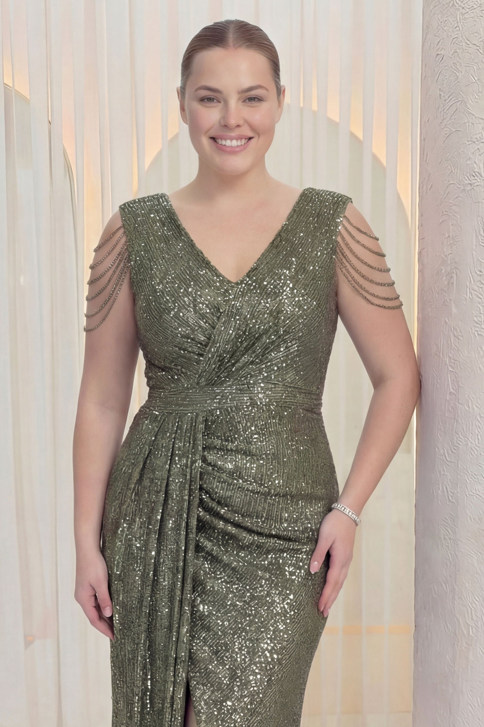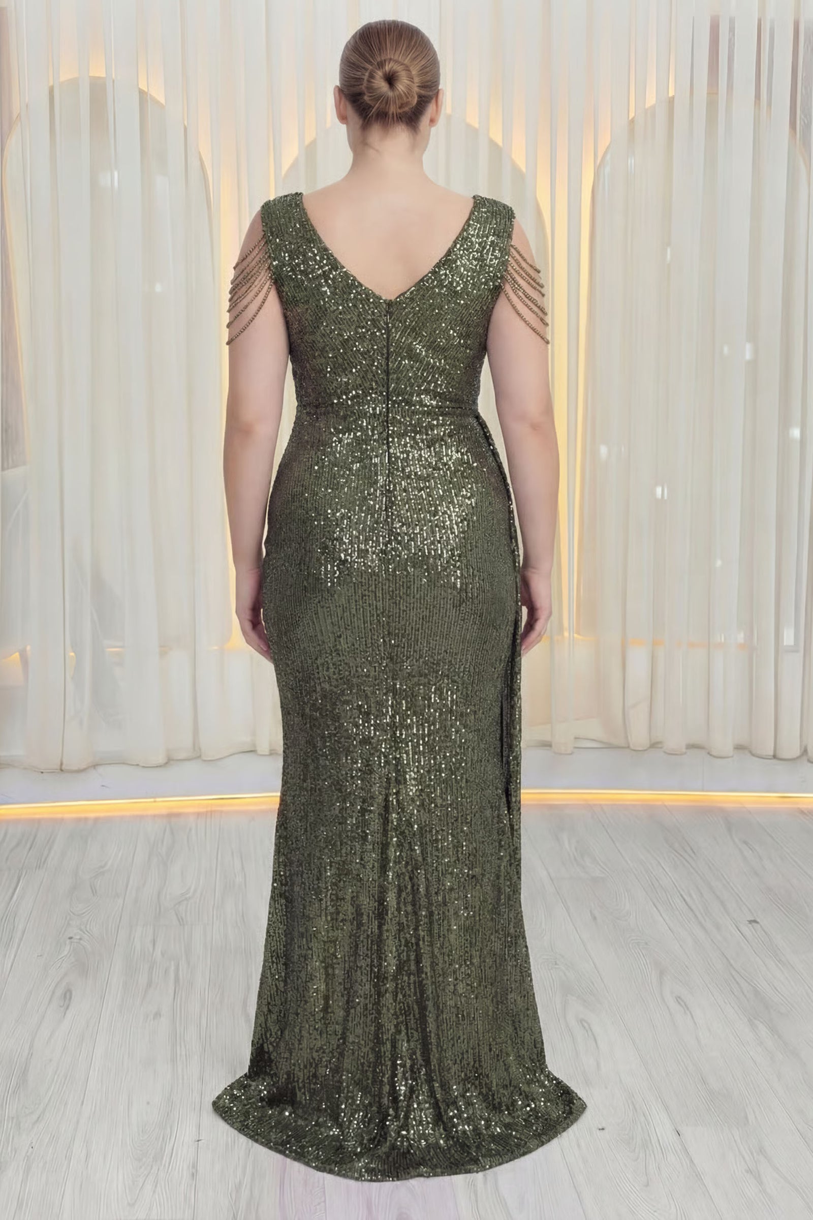 Haki Kruvaze Yaka Omuz Detay Pul Payet Büyük Beden Abiye Elbise