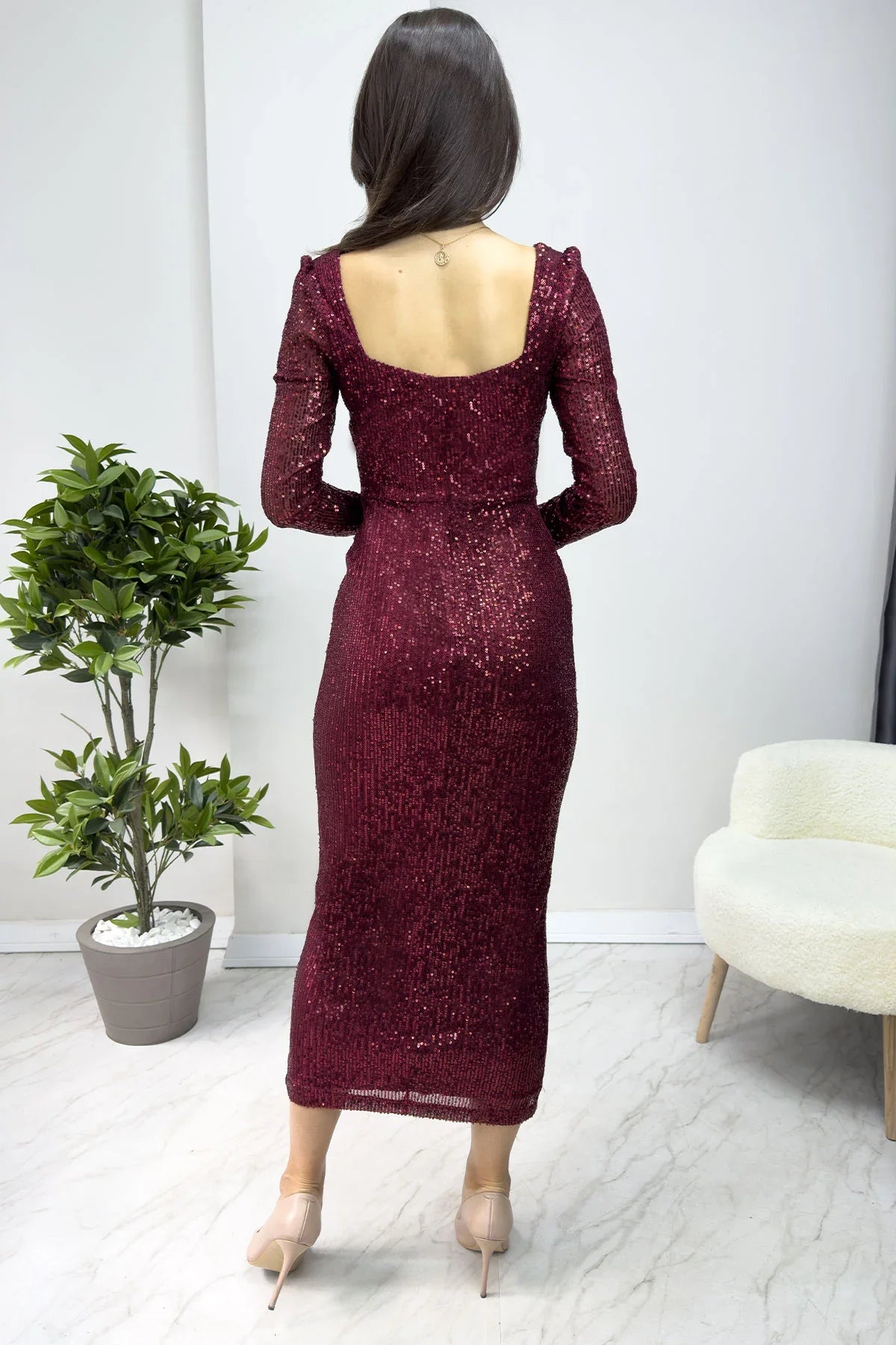 Bordo Kare Yaka Pul Payet Abiye Elbise