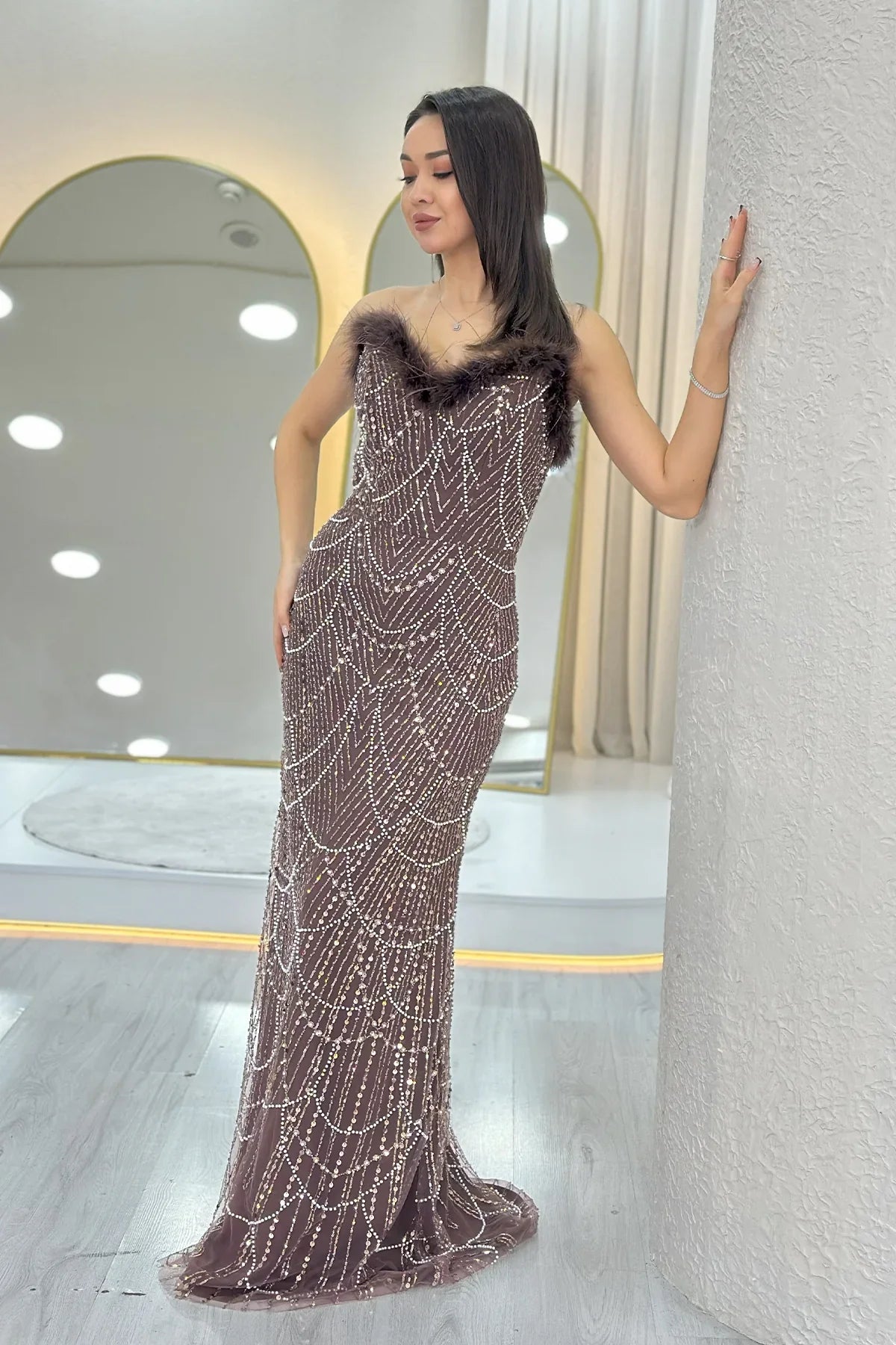Kadın Kahverengi Straplez İşlemeli Otriş Detaylı Abiye Elbise