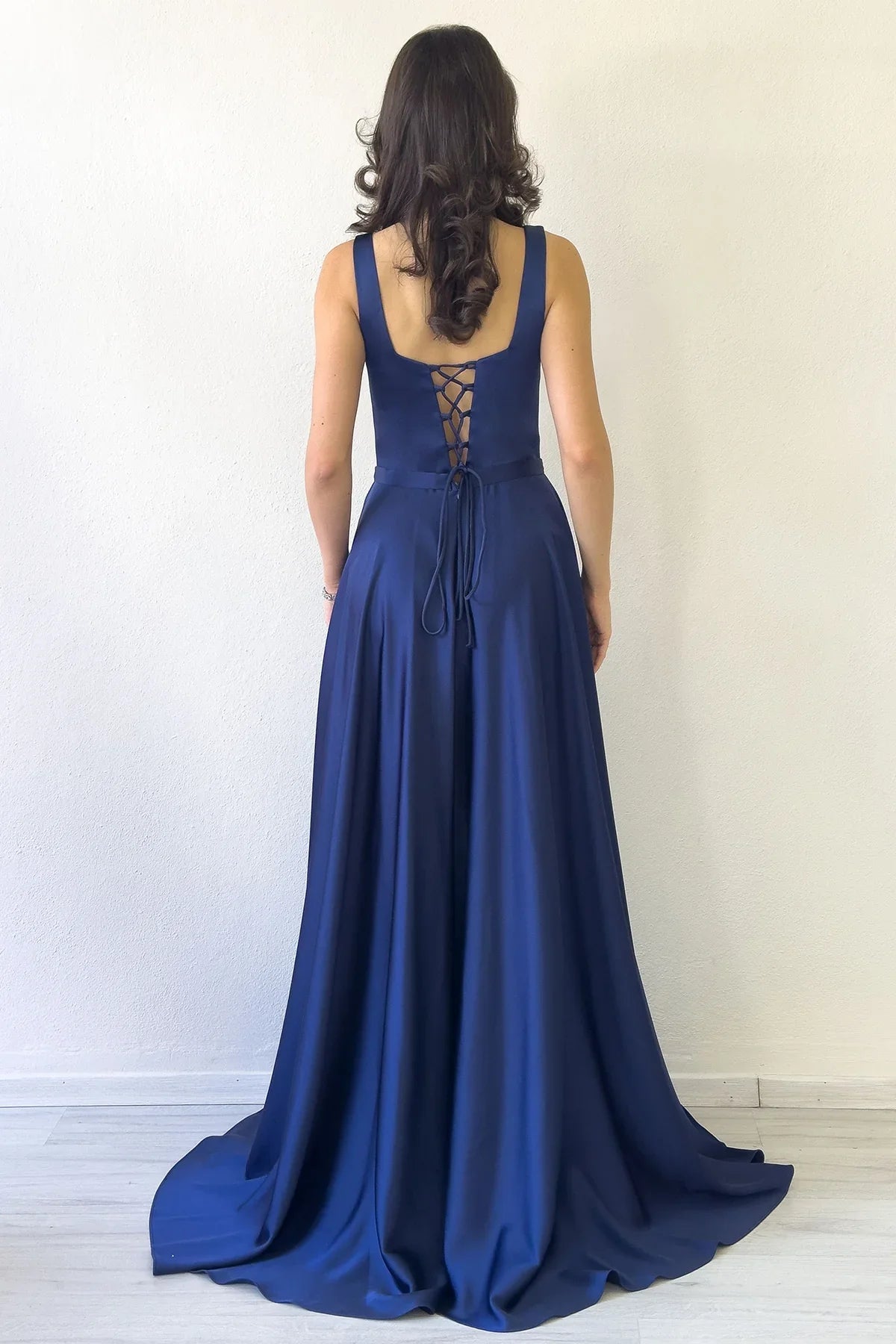 Lacivert Kare Yaka Sırt Bağlamalı Askılı Saten Abiye Elbise