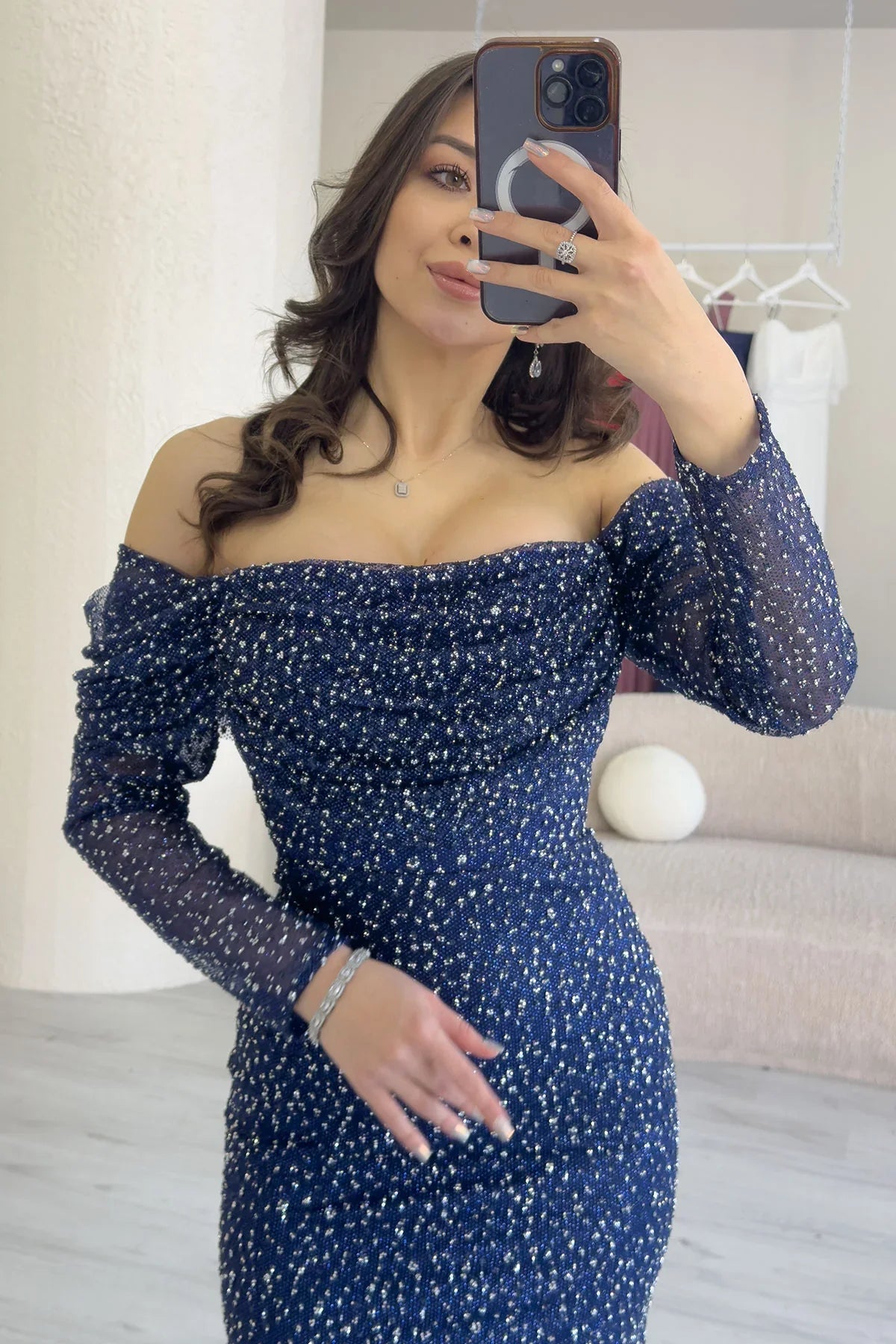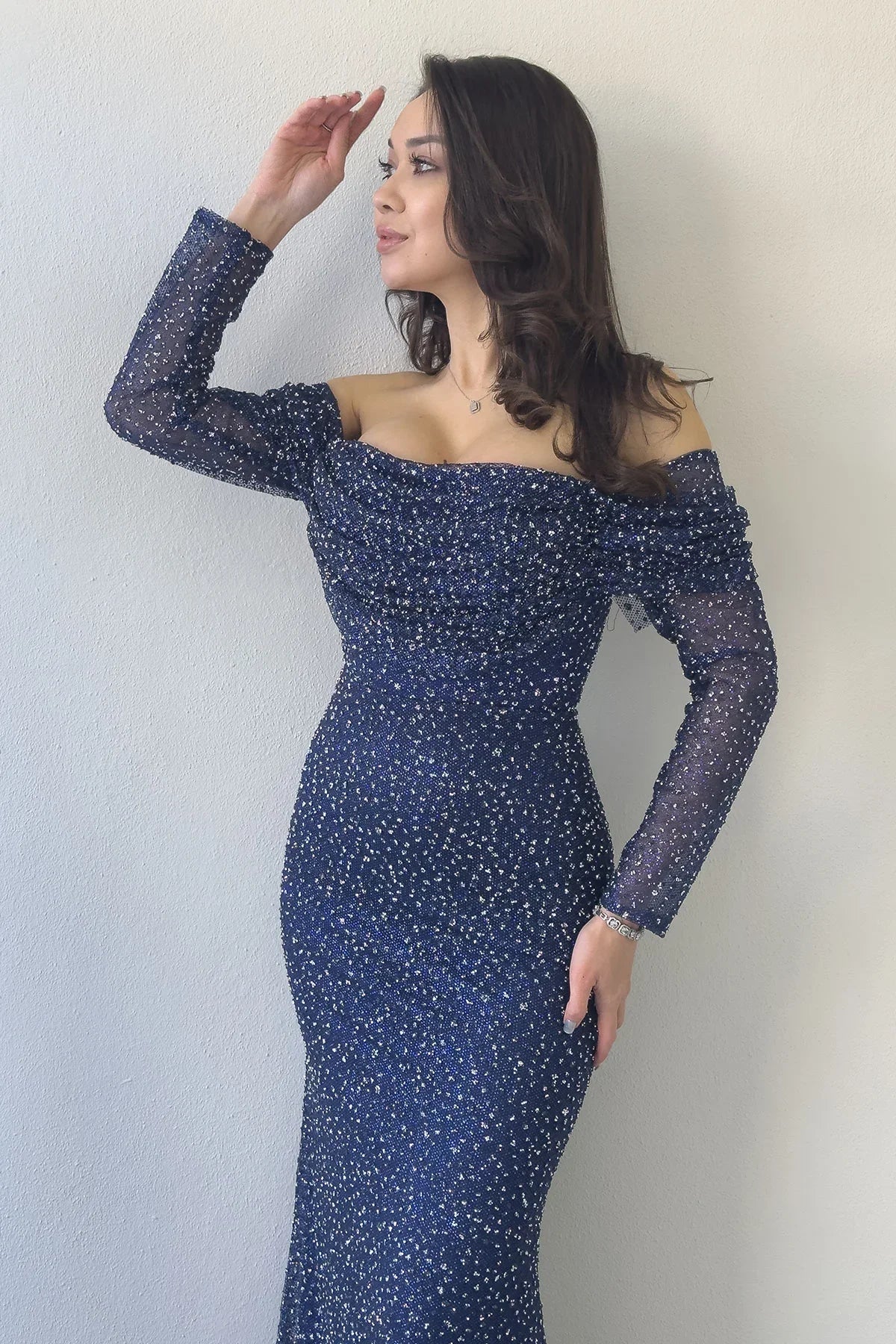 Lacivert Kayık Yaka Taş İşlemeli Uzun Kol Balık Abiye Elbise