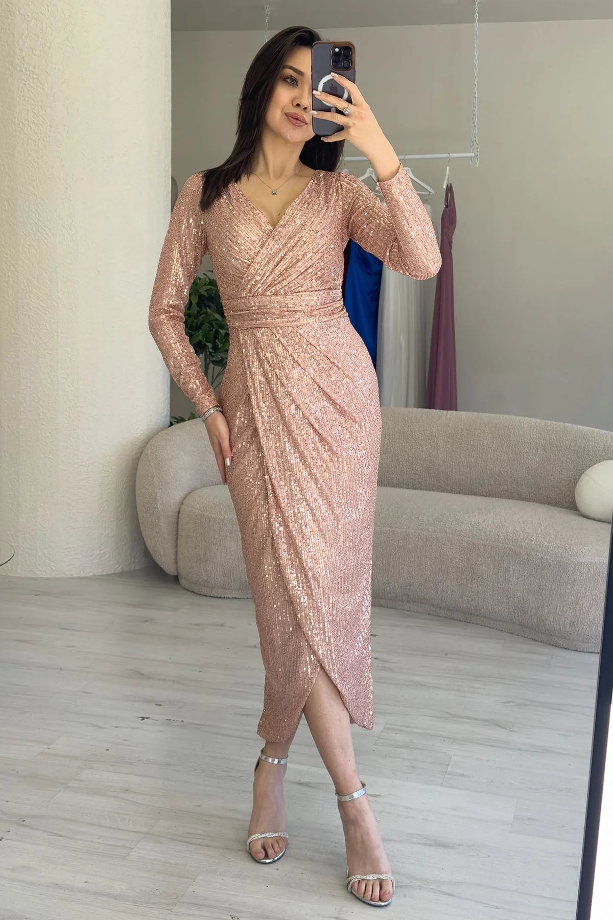 Pudra Kruvaze Yaka Payet Tasarım Uzun Kollu Abiye Elbise