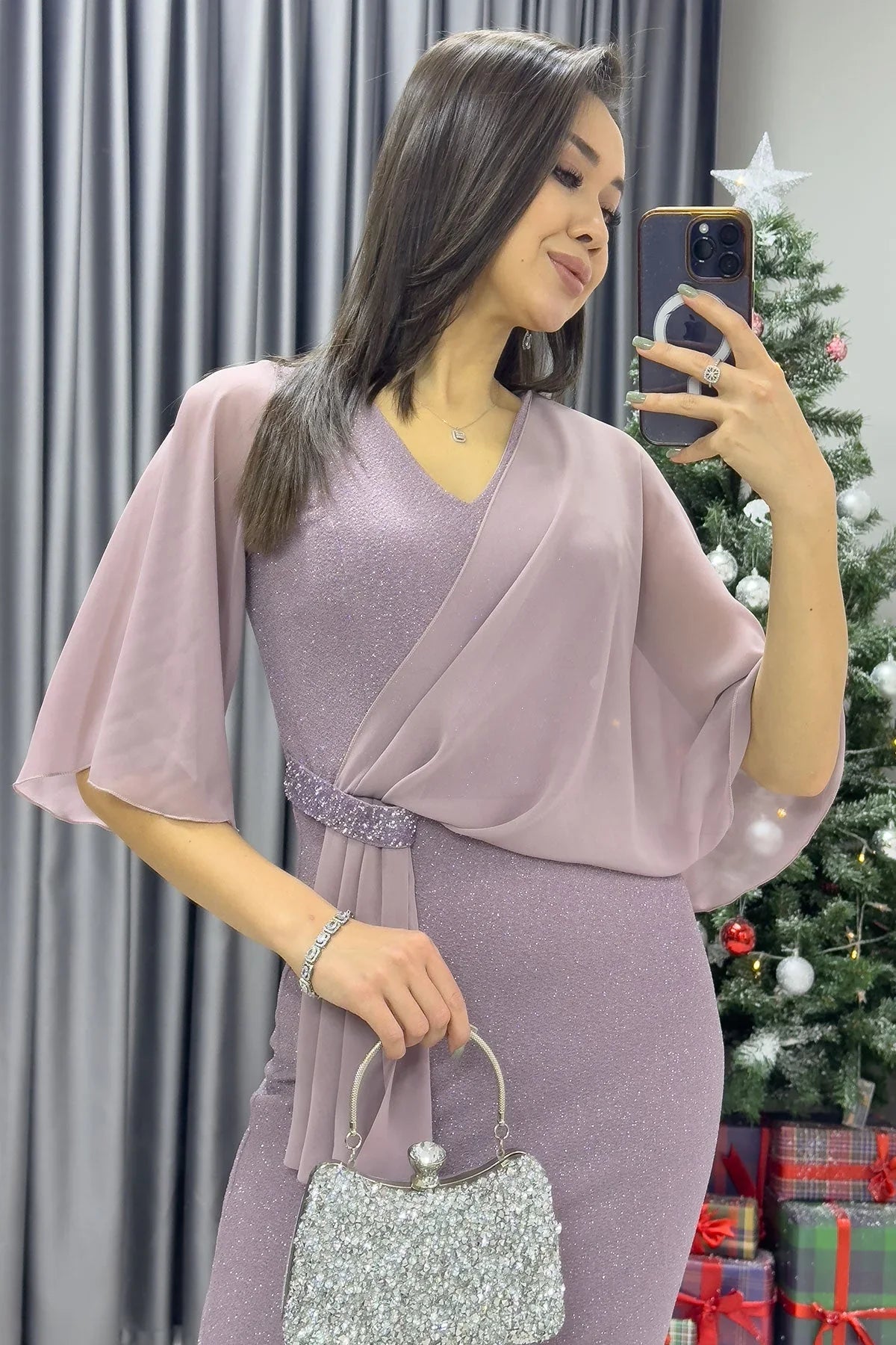 Pudra Taş Detaylı Volan Kol Simli Abiye Elbise