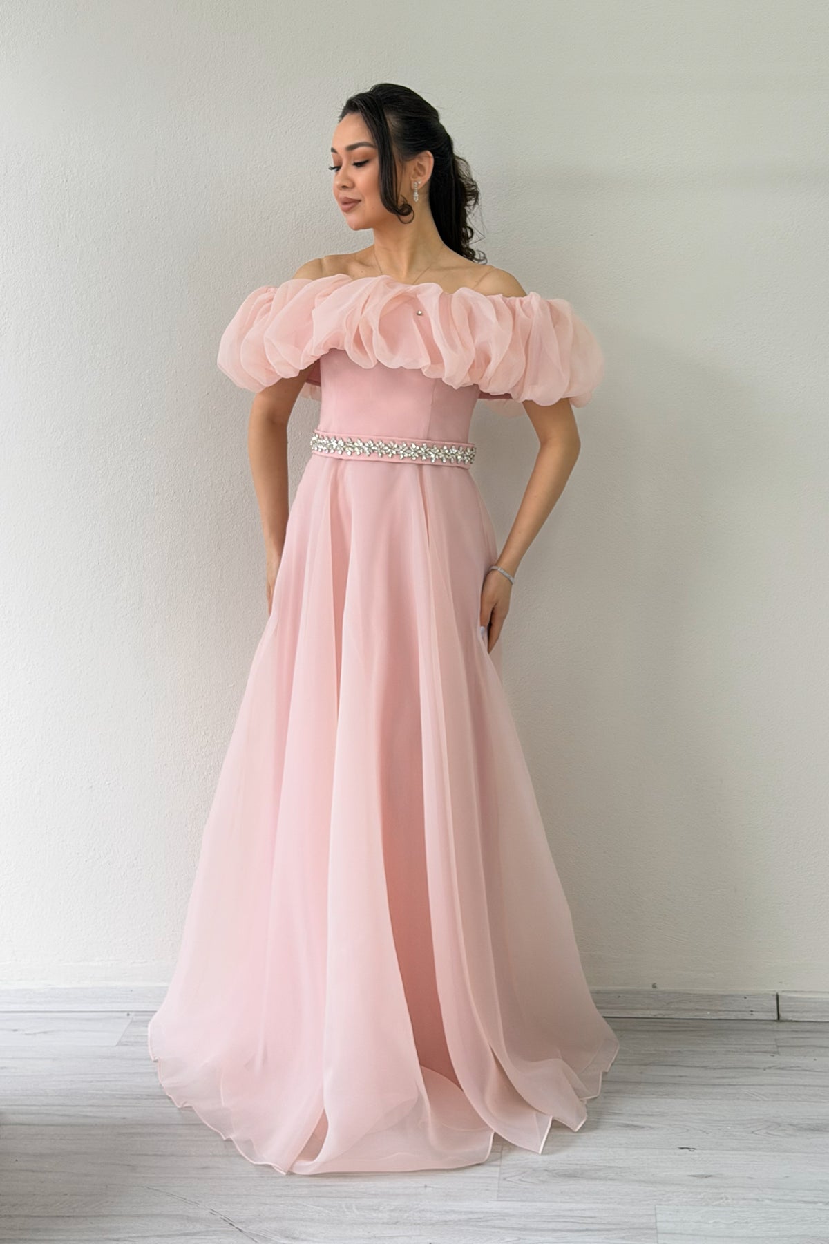 Pudra Volan Yaka Taş Kemer Detay Tül Prenses Abiye