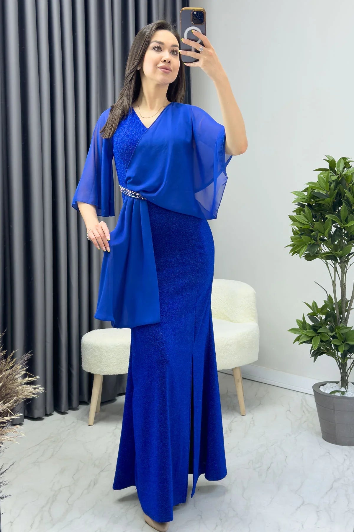 Saks Taş Detaylı Volan Kol Simli Abiye Elbise