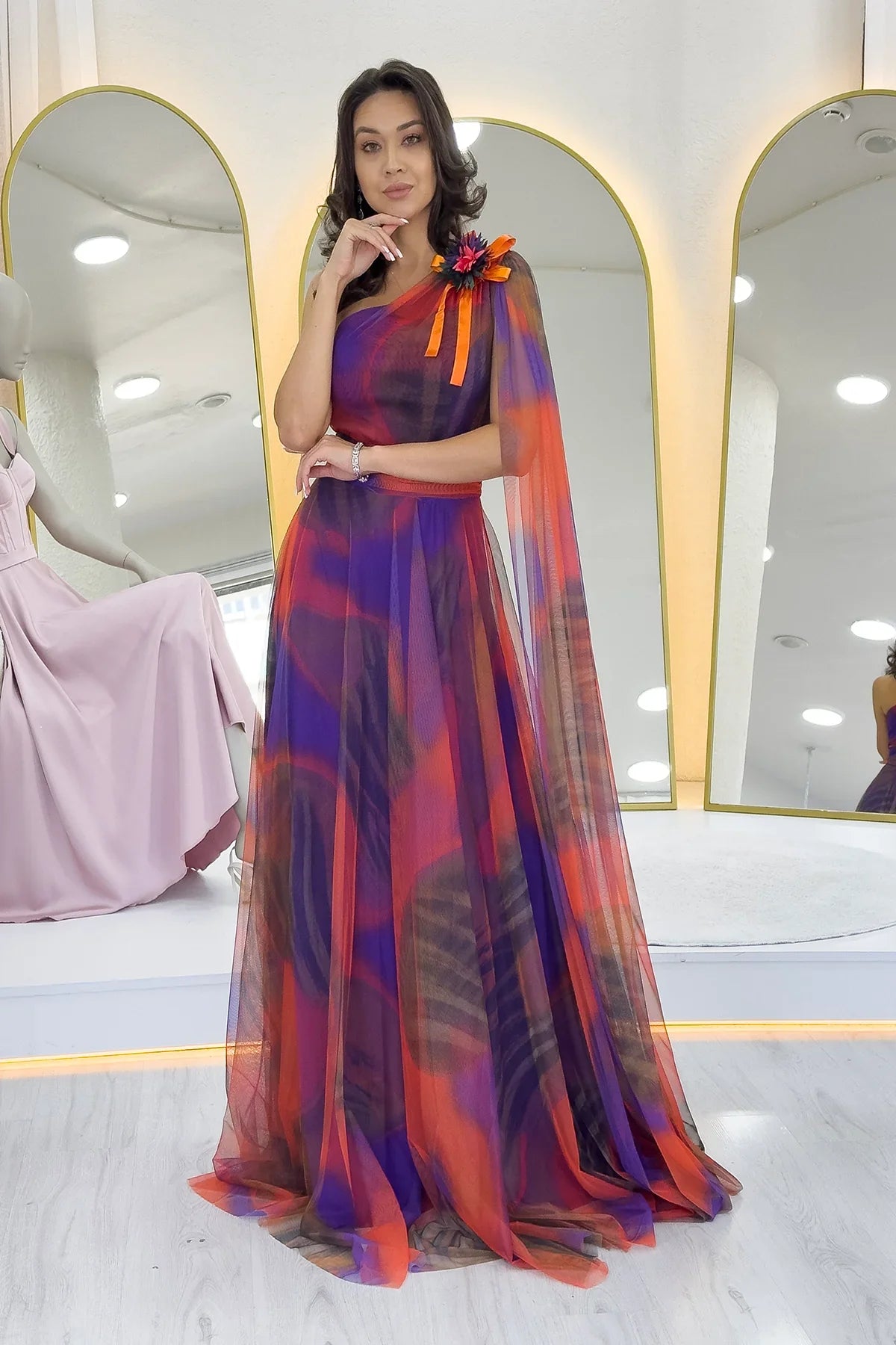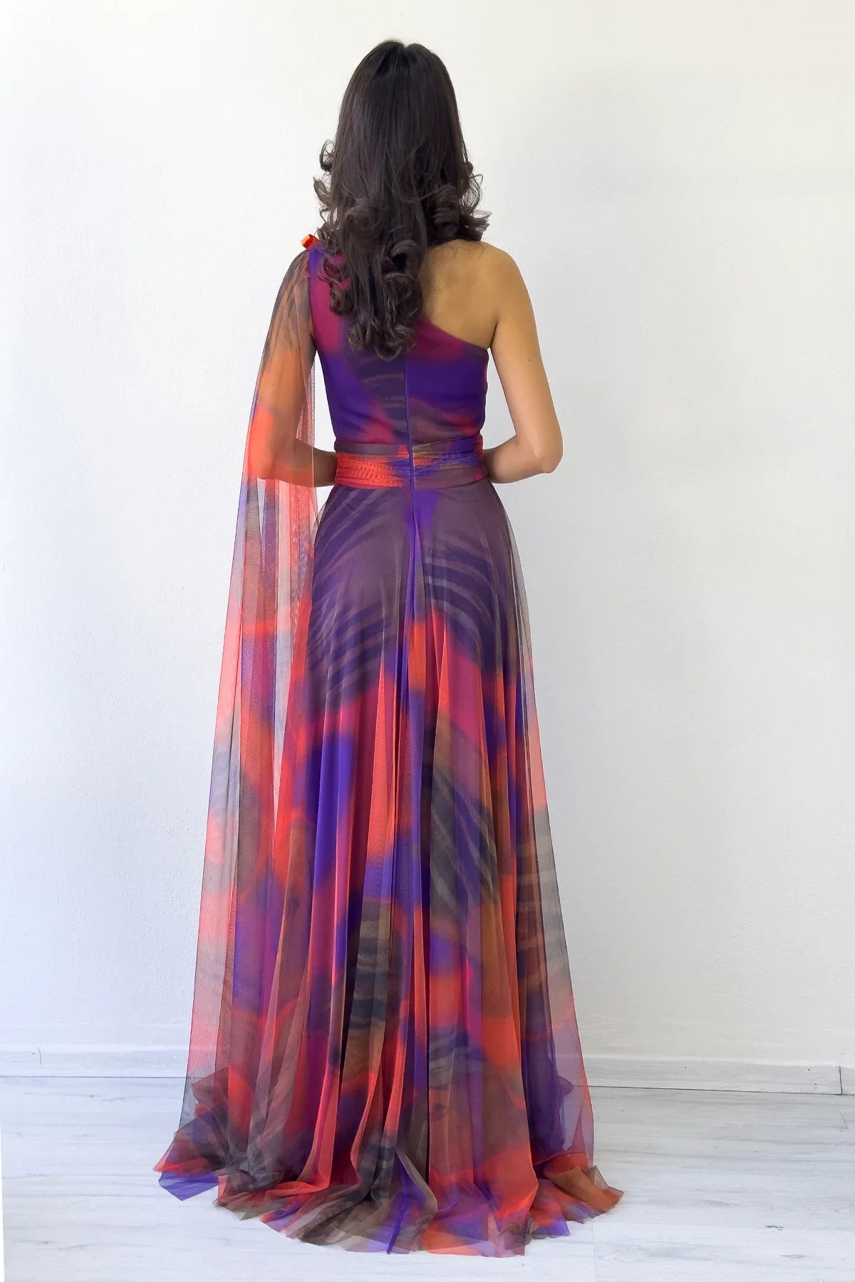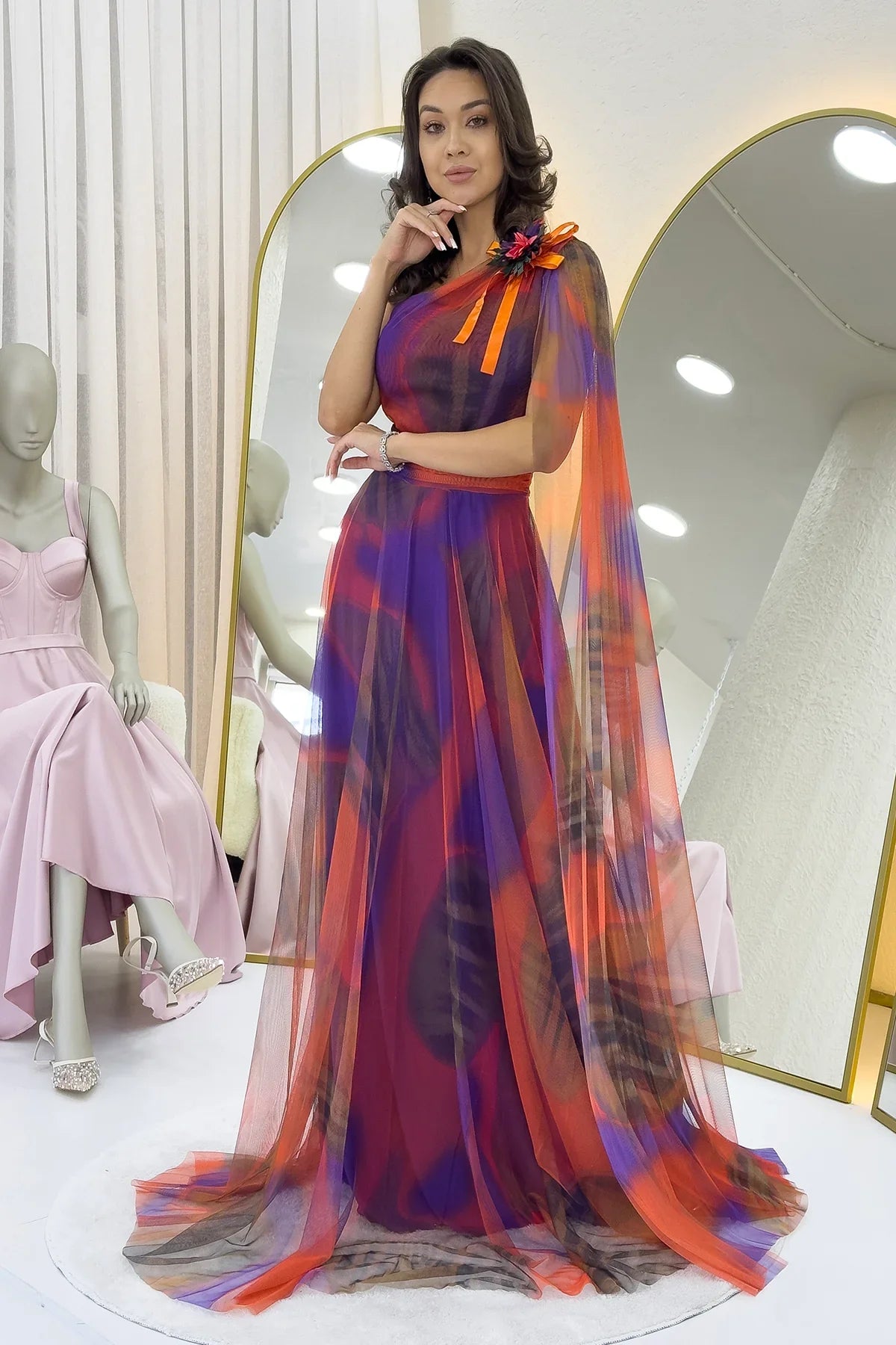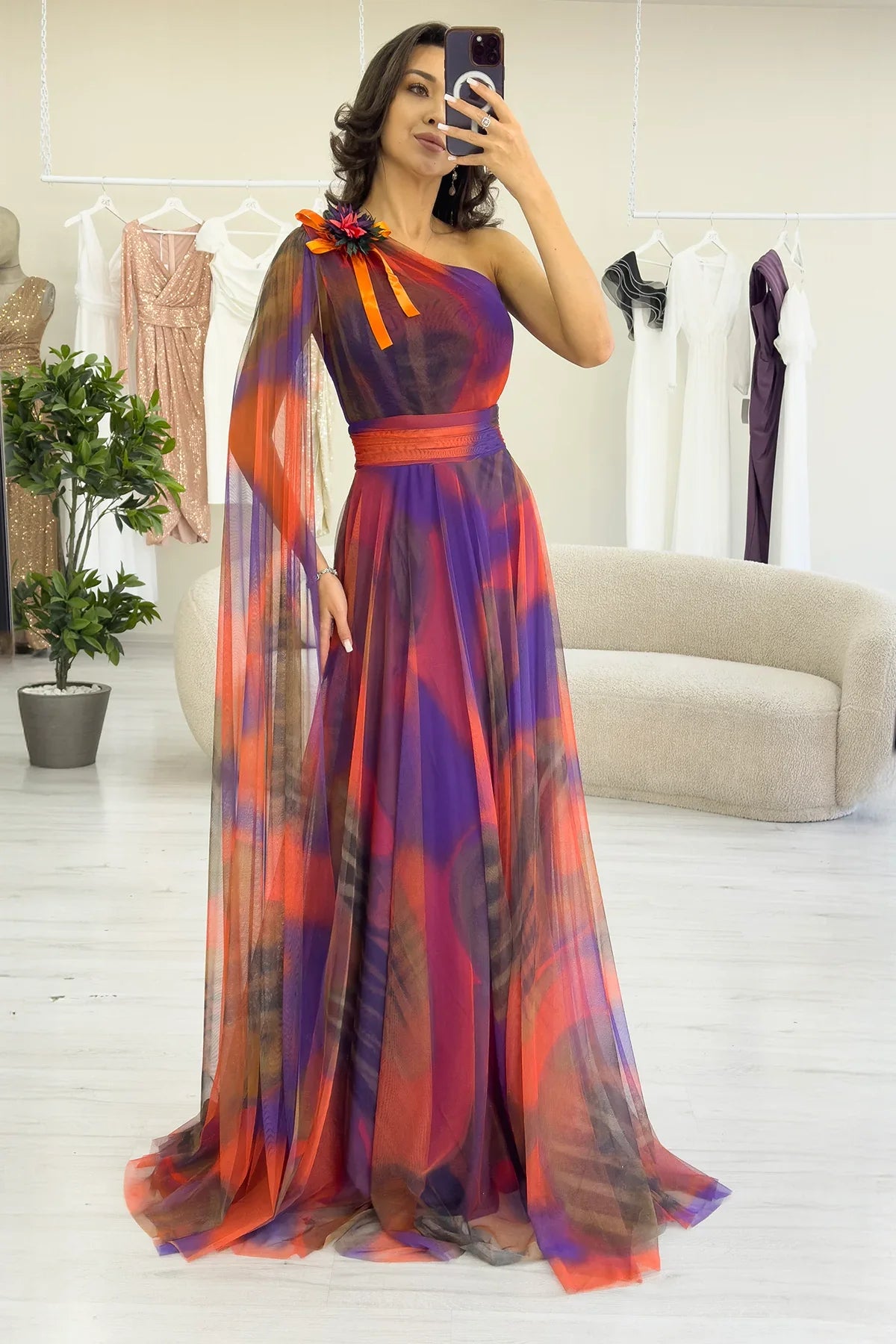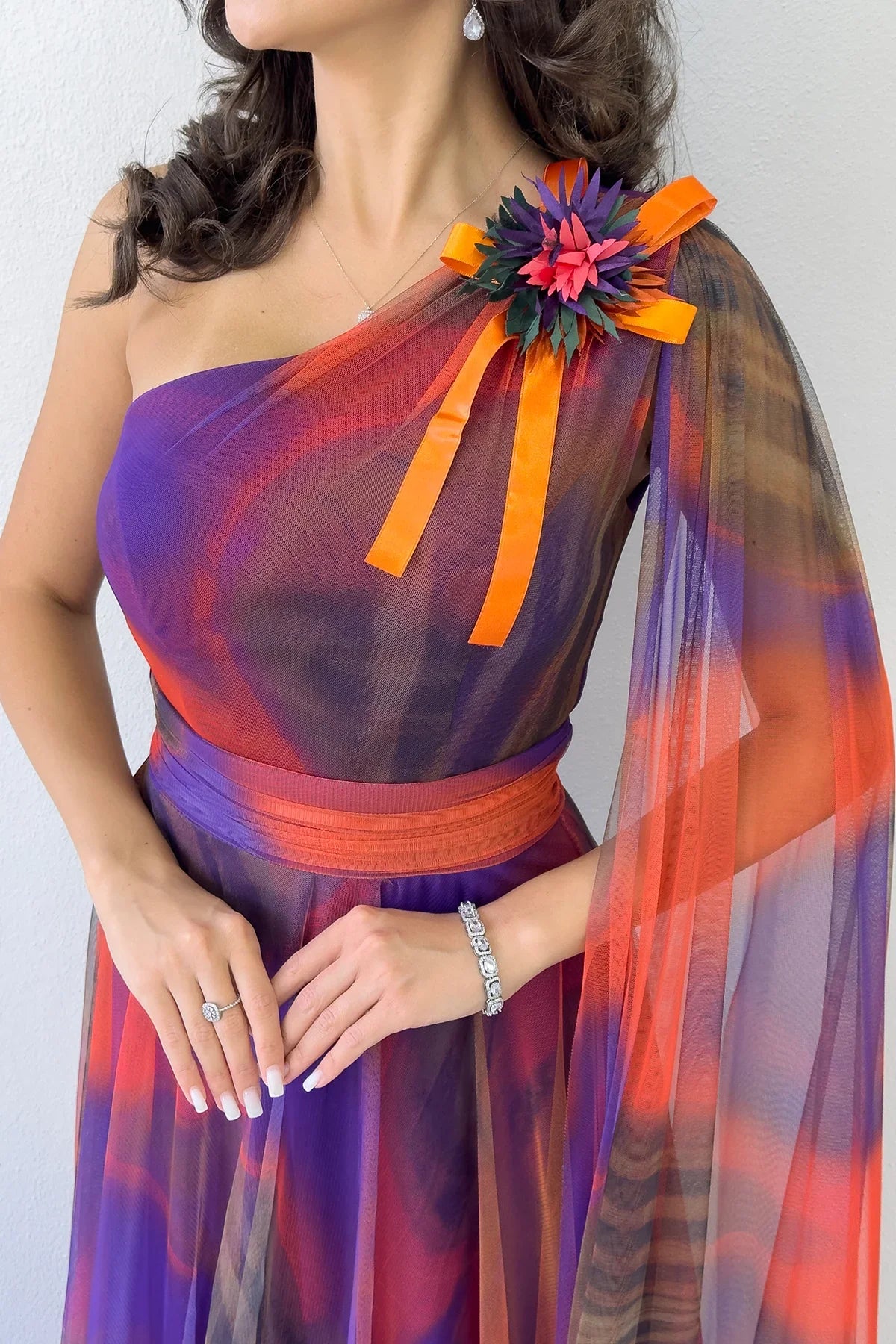 Turuncu Batik Desenli Tek Omuz Tül Detaylı Abiye Elbise