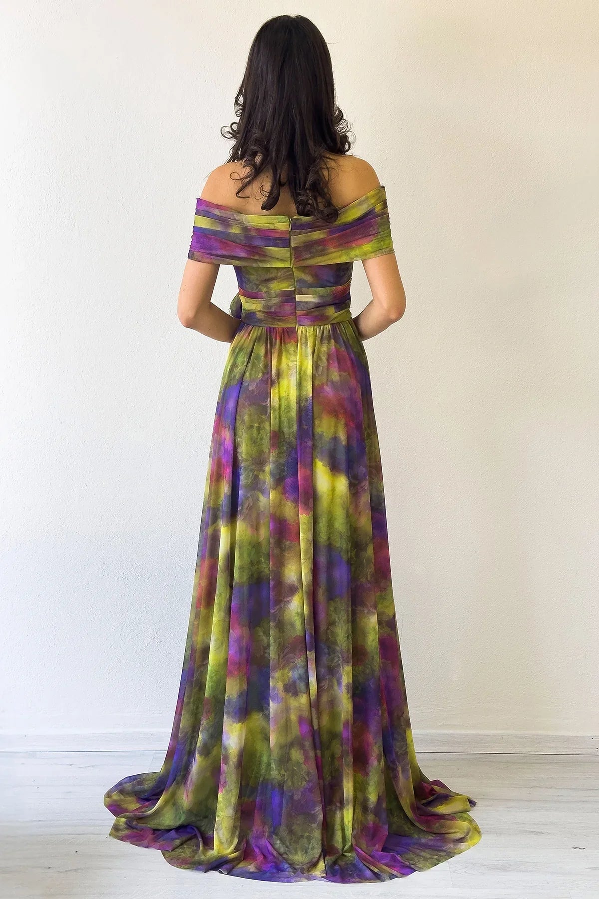 Yeşil Batik Desenli Madonna Yaka Desenli Tül Abiye Elbise