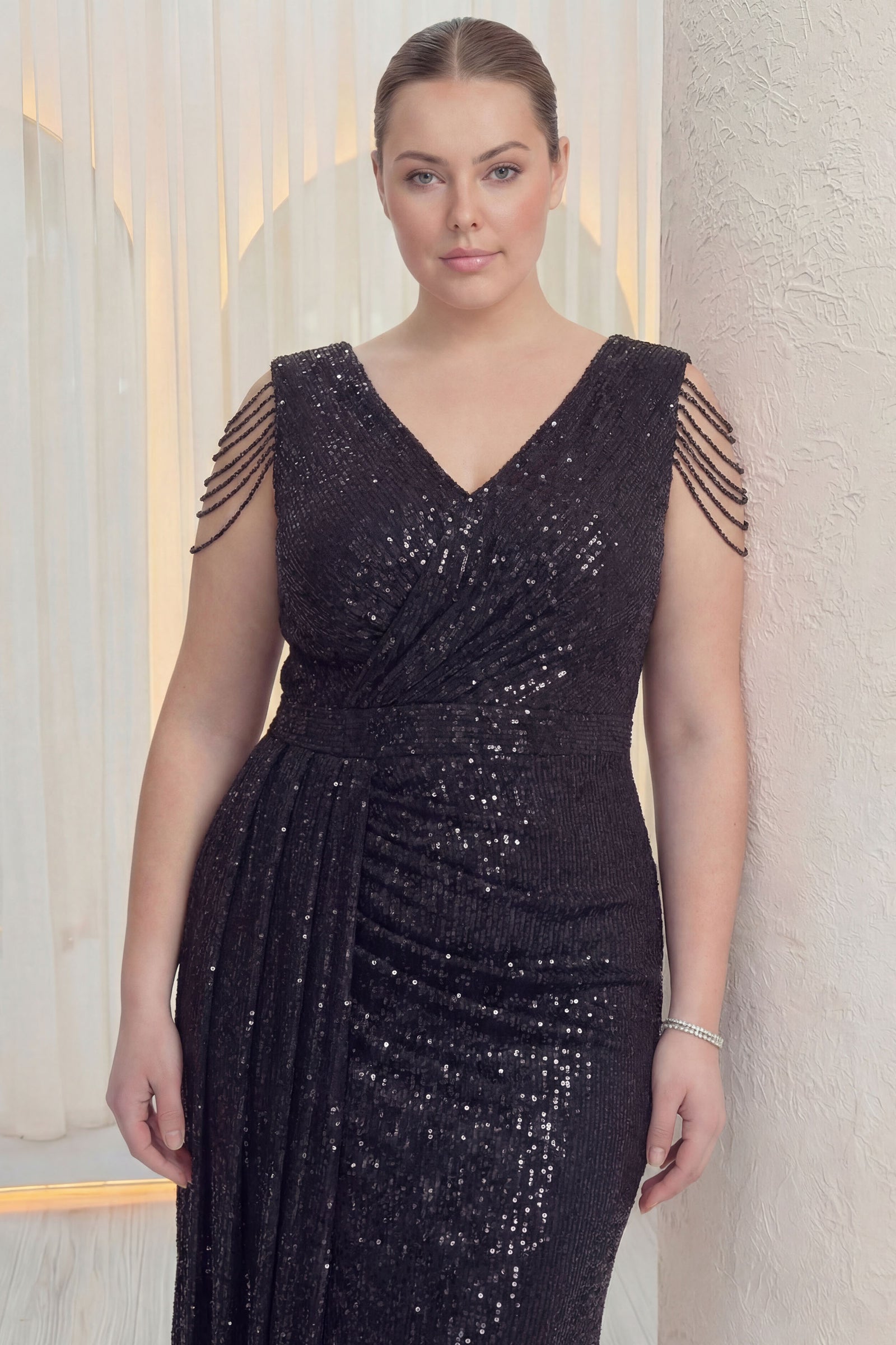 Siyah Kruvaze Yaka Omuz Detay Pul Payet Büyük Beden Abiye Elbise