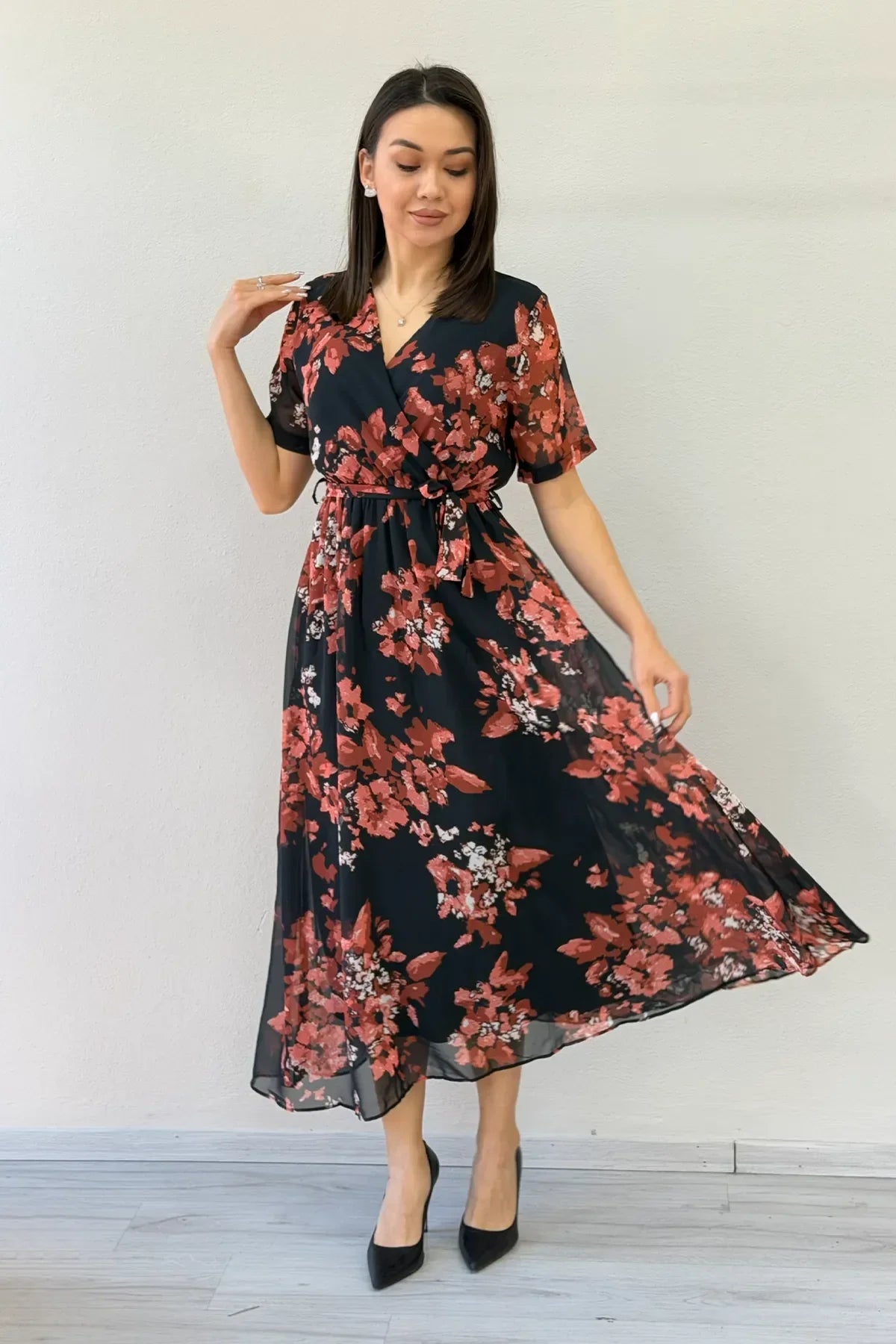 Nar Çiçekli Kısa Kol Kruvaze Yaka Büyük Beden Şifon Elbise
