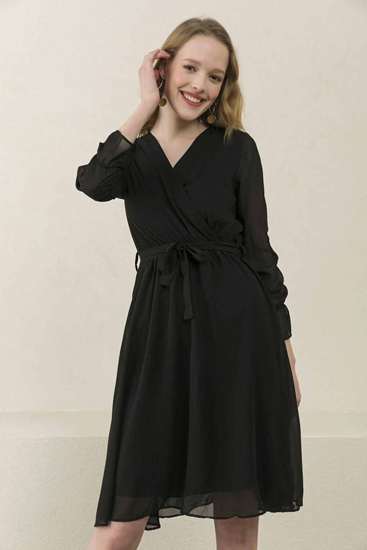 Siyah Kruvaze Yaka Şifon Büyük Beden Kısa Elbise