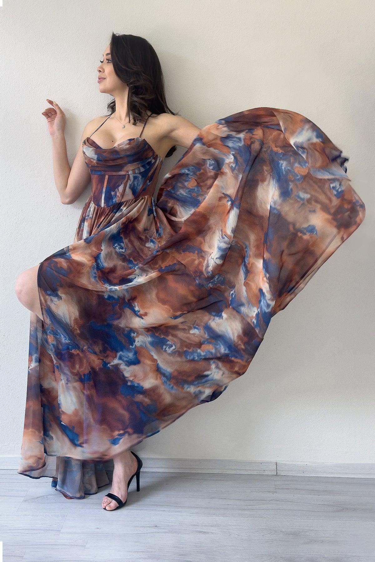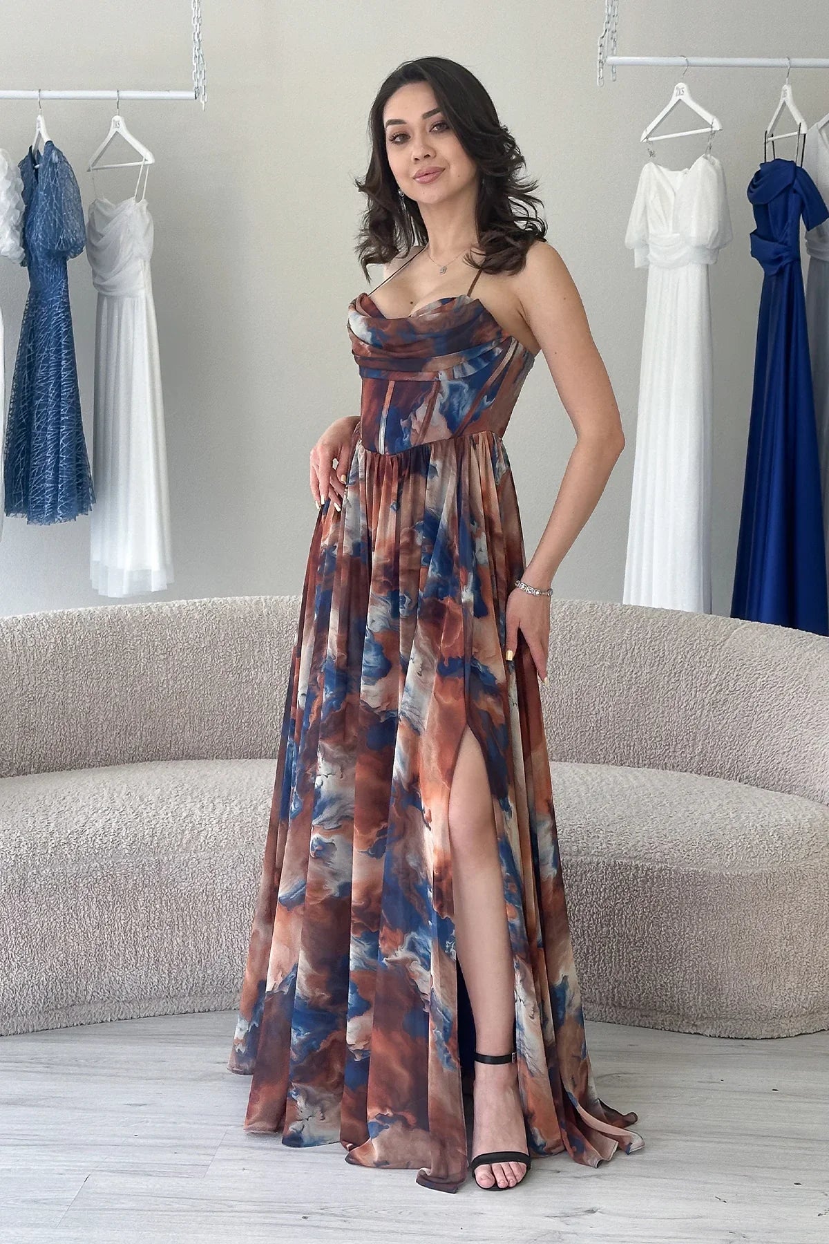 Kadın Kahverengi Batik Desenli Straplez Askılı Sırt Dekolteli Yırtmaçlı Abiye Elbise