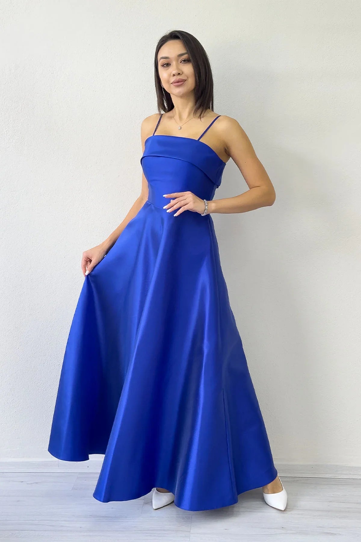 Saks Mavi İnce Askılı Cep Detaylı Abiye Elbise
