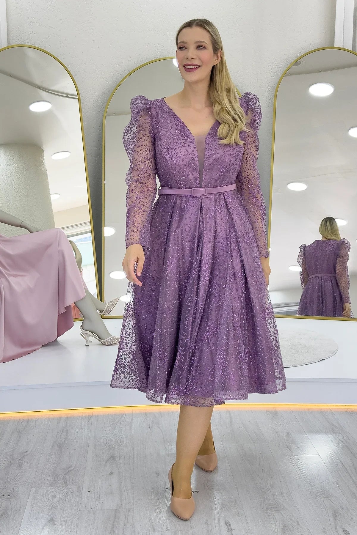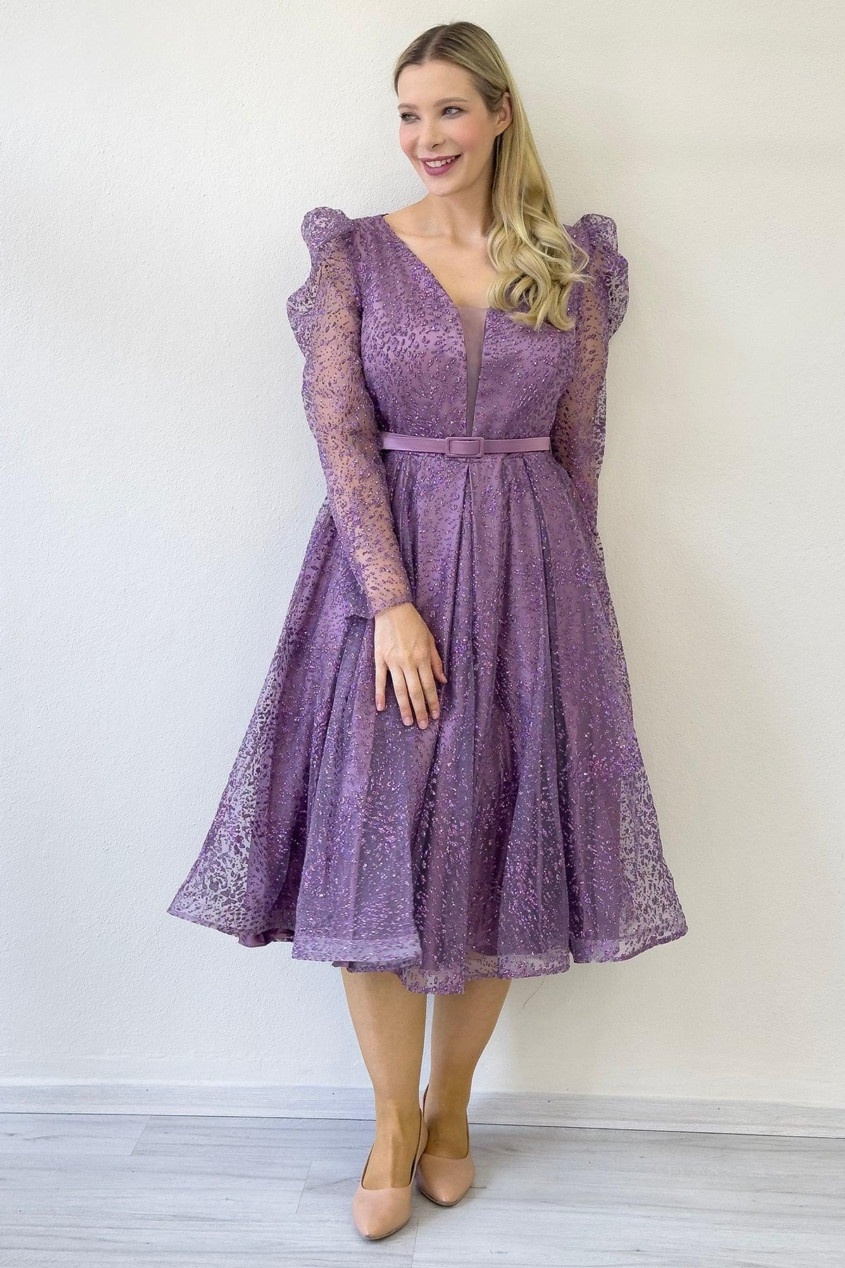 Lila Gloplu Kloş Kemerli Büyük Beden Abiye Elbise