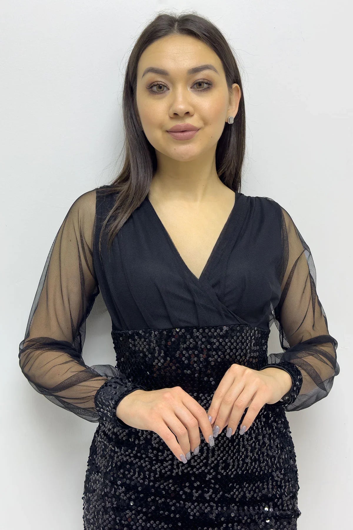 Siyah Kruvaze Yaka Payet Mini Abiye Elbise