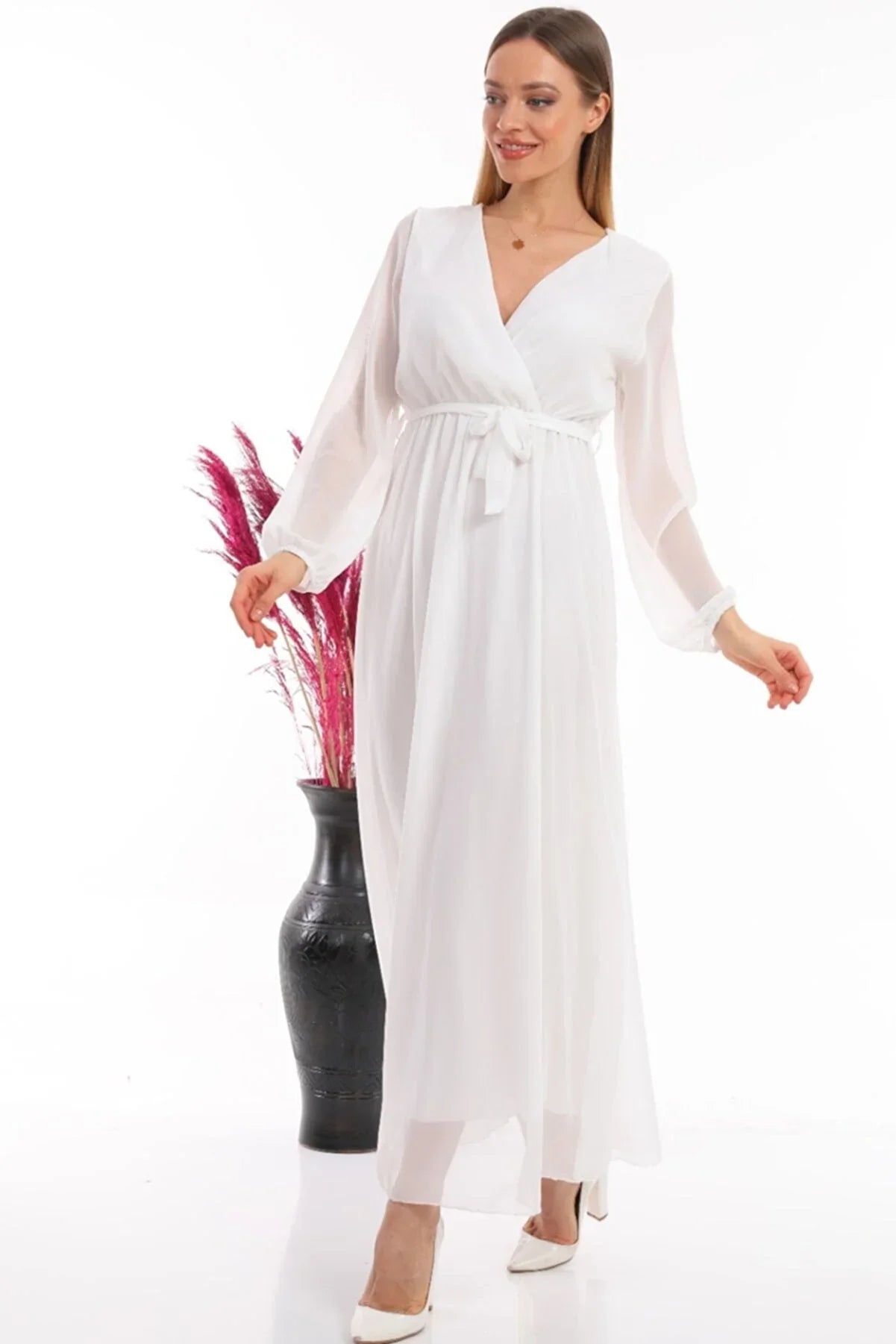 Beyaz Kruvaze Yaka Kuşaklı Büyük Beden Şifon Maxi Elbise