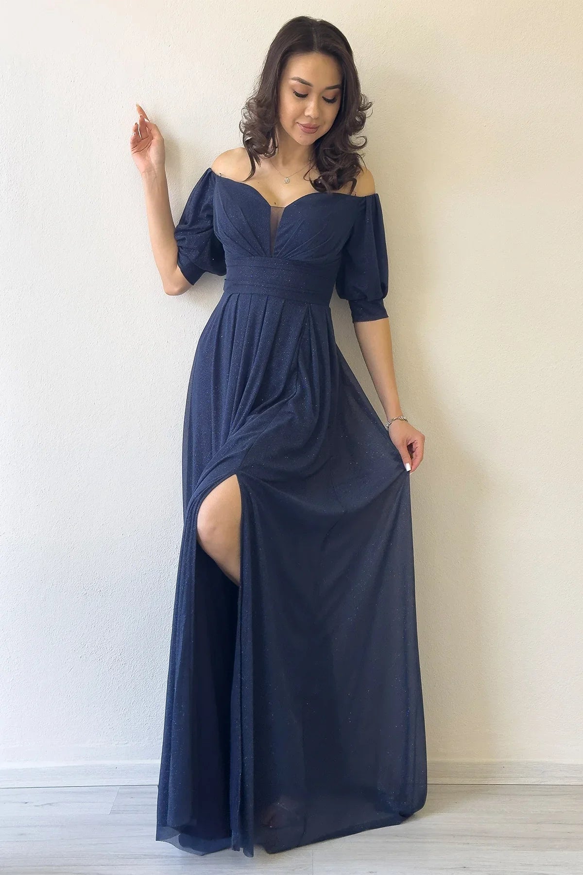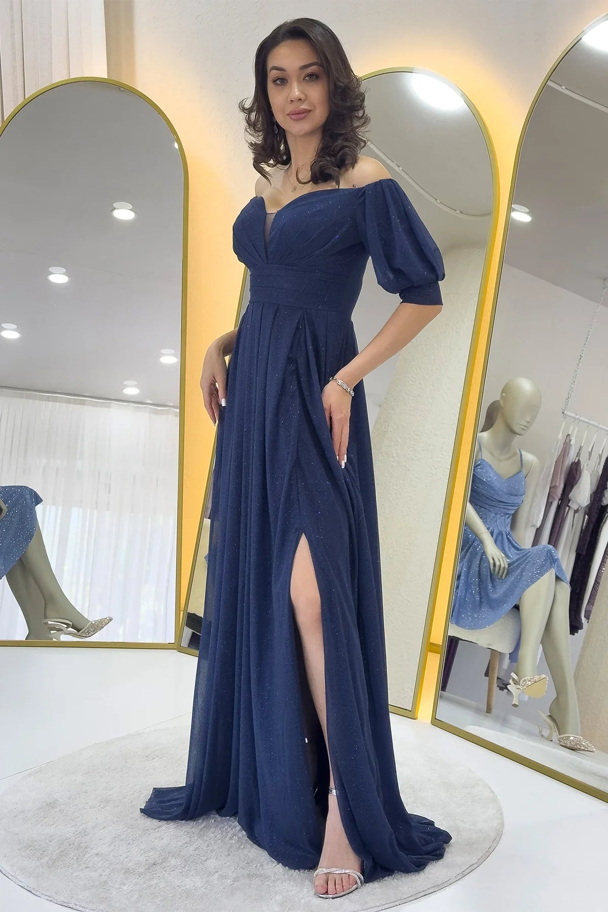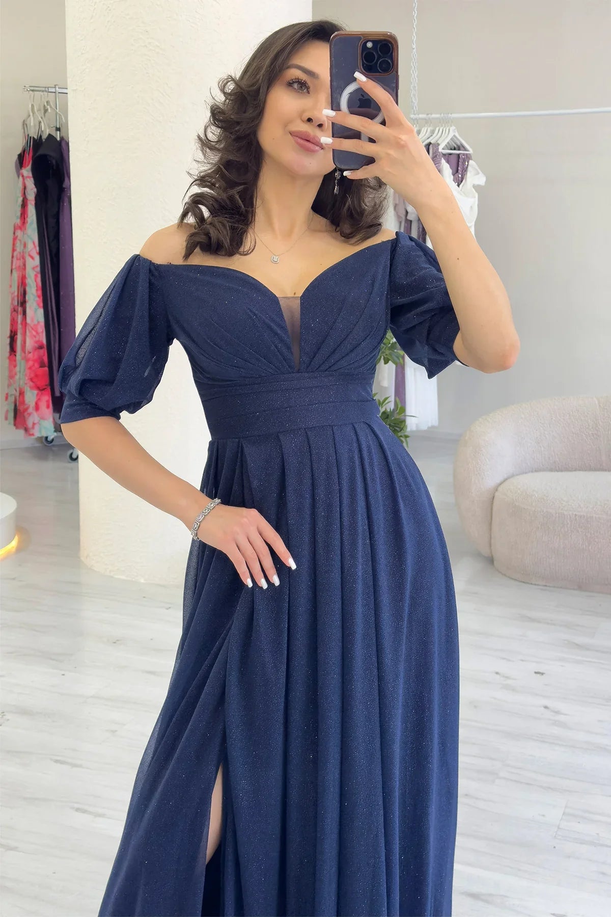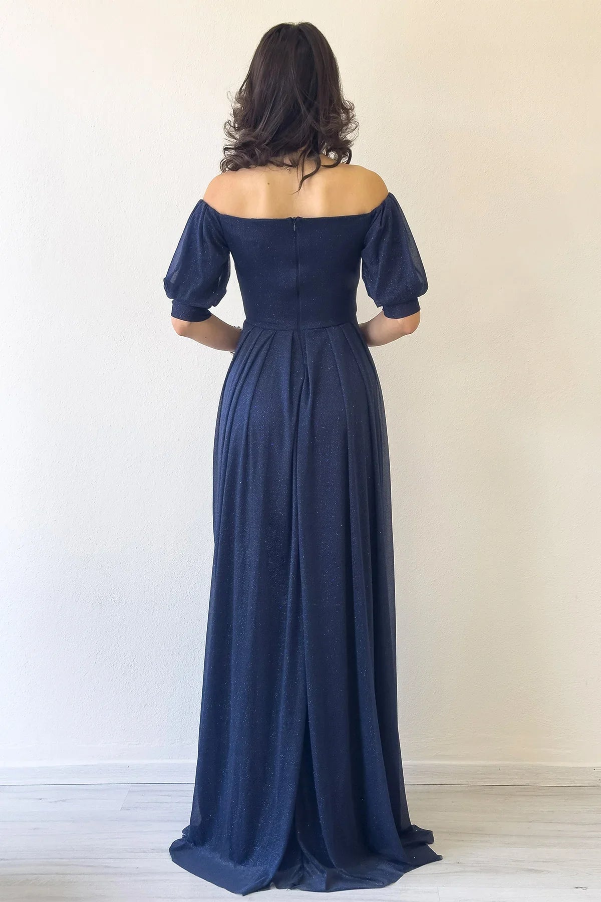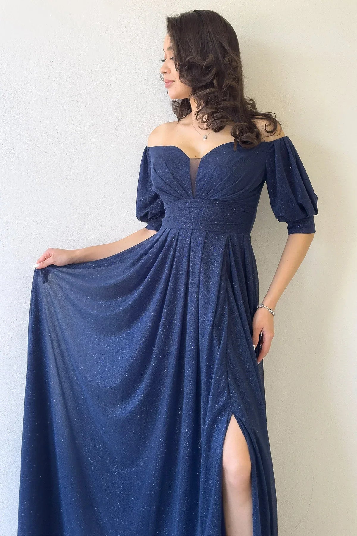 Kadın Lacivert Kısa Kol Drapeli Abiye Elbise