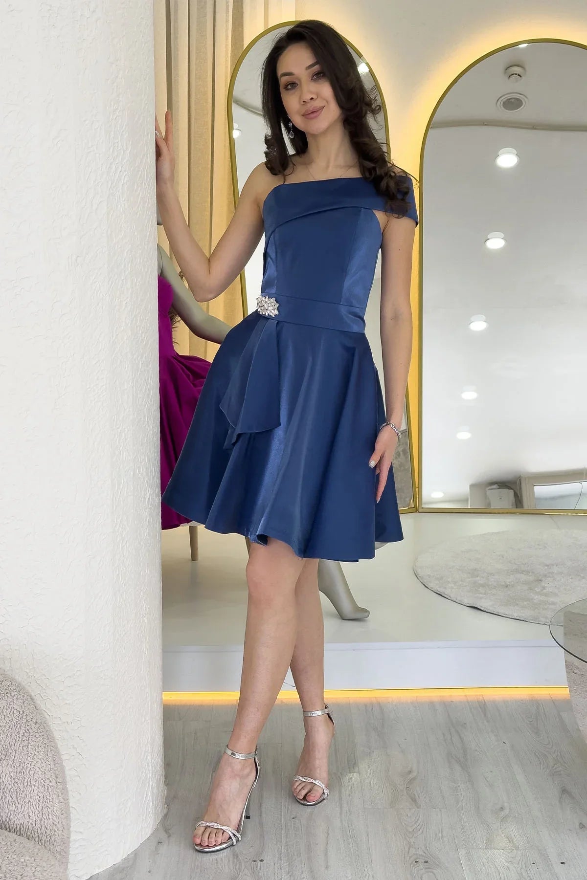 Lacivert Tek Omuz Taş Detay Mini Kloş Saten Abiye Elbise