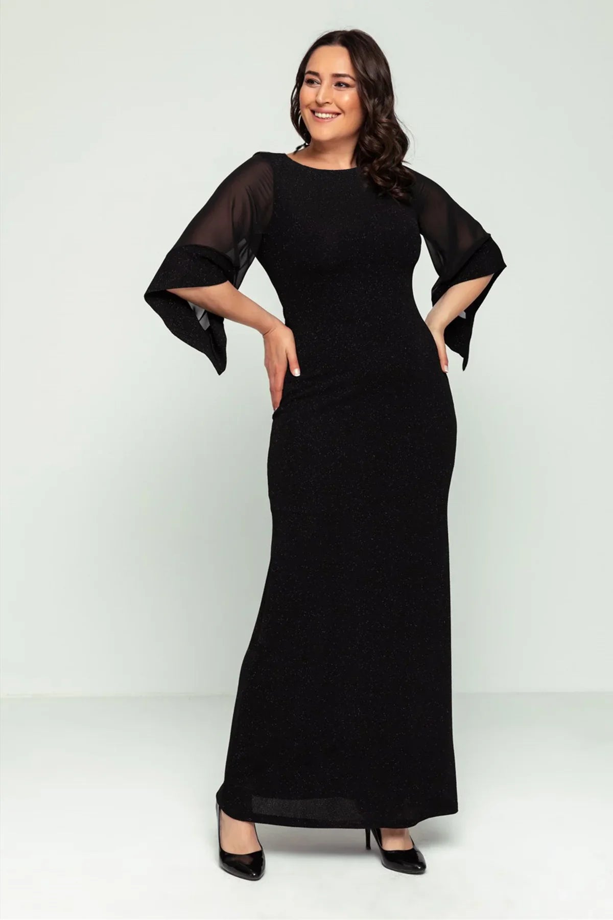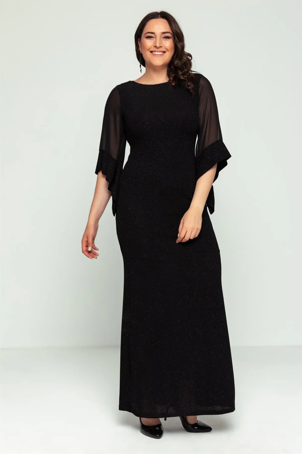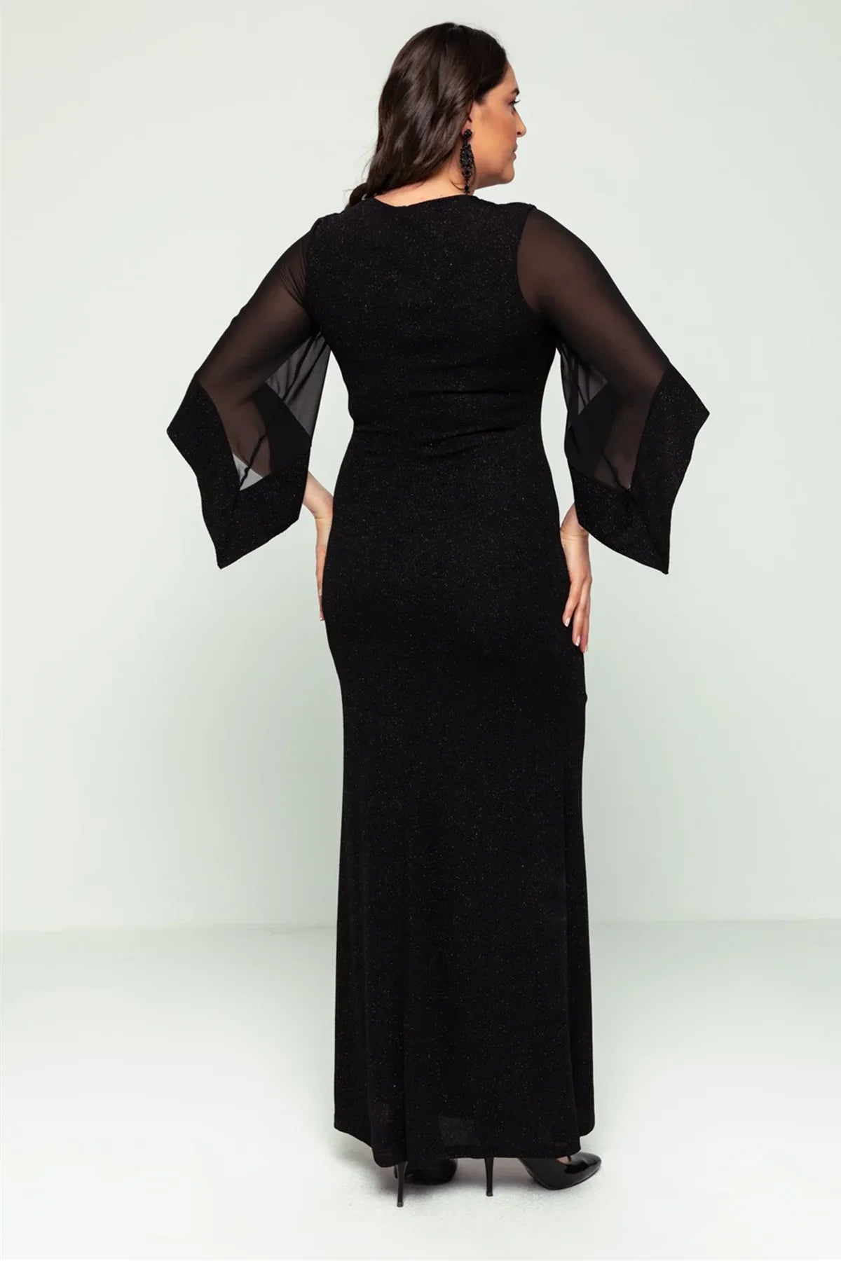 Siyah Kadın Büyük Beden Kolu Şifon Simli Abiye Elbise