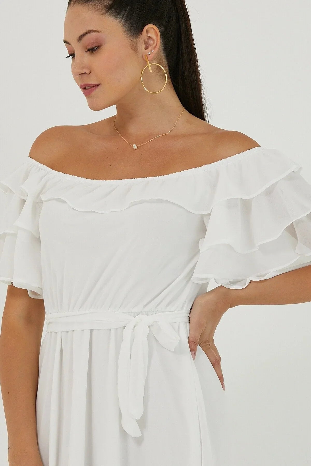 Beyaz Volanlı Madonna Yaka Büyük Beden Şifon Elbise