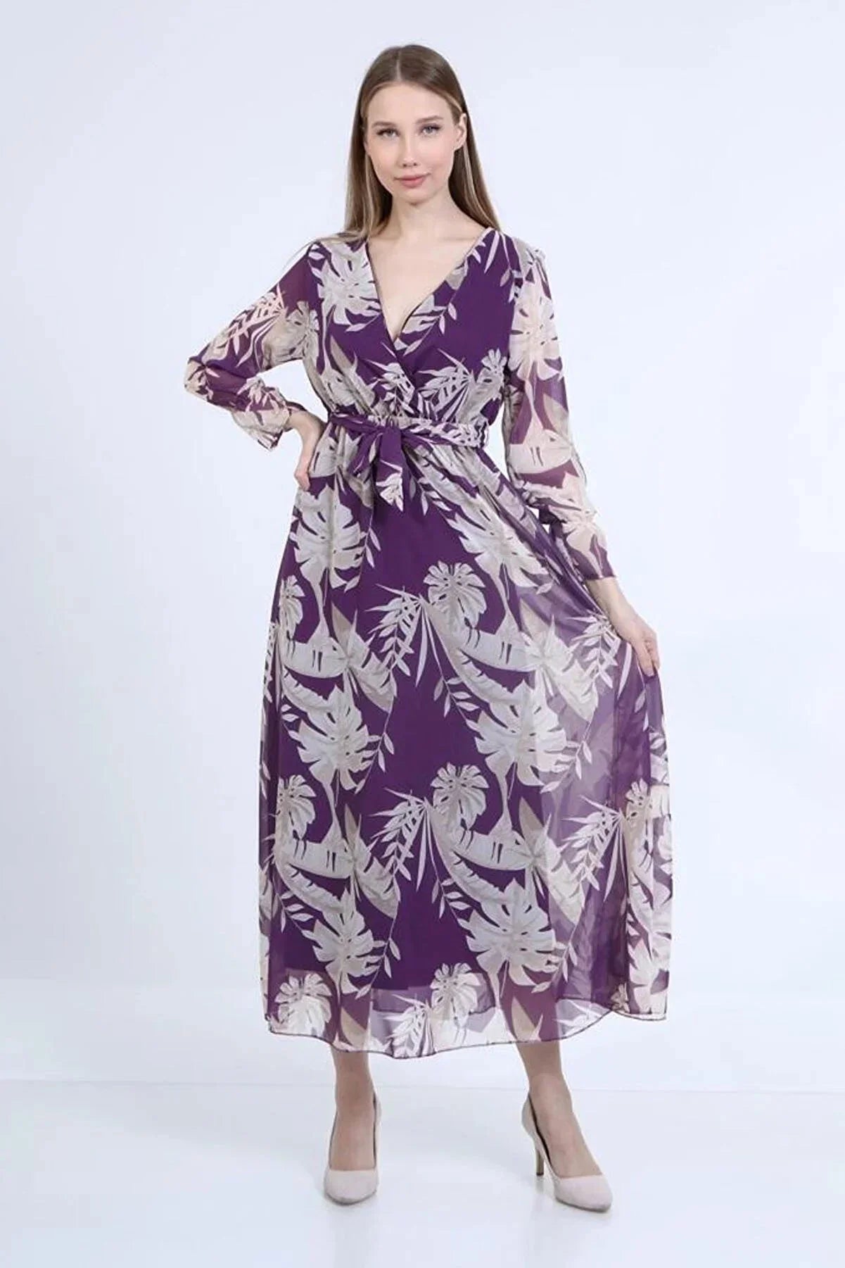 Kadın Mor Yaprak Kruvaze Yaka Şifon Elbise