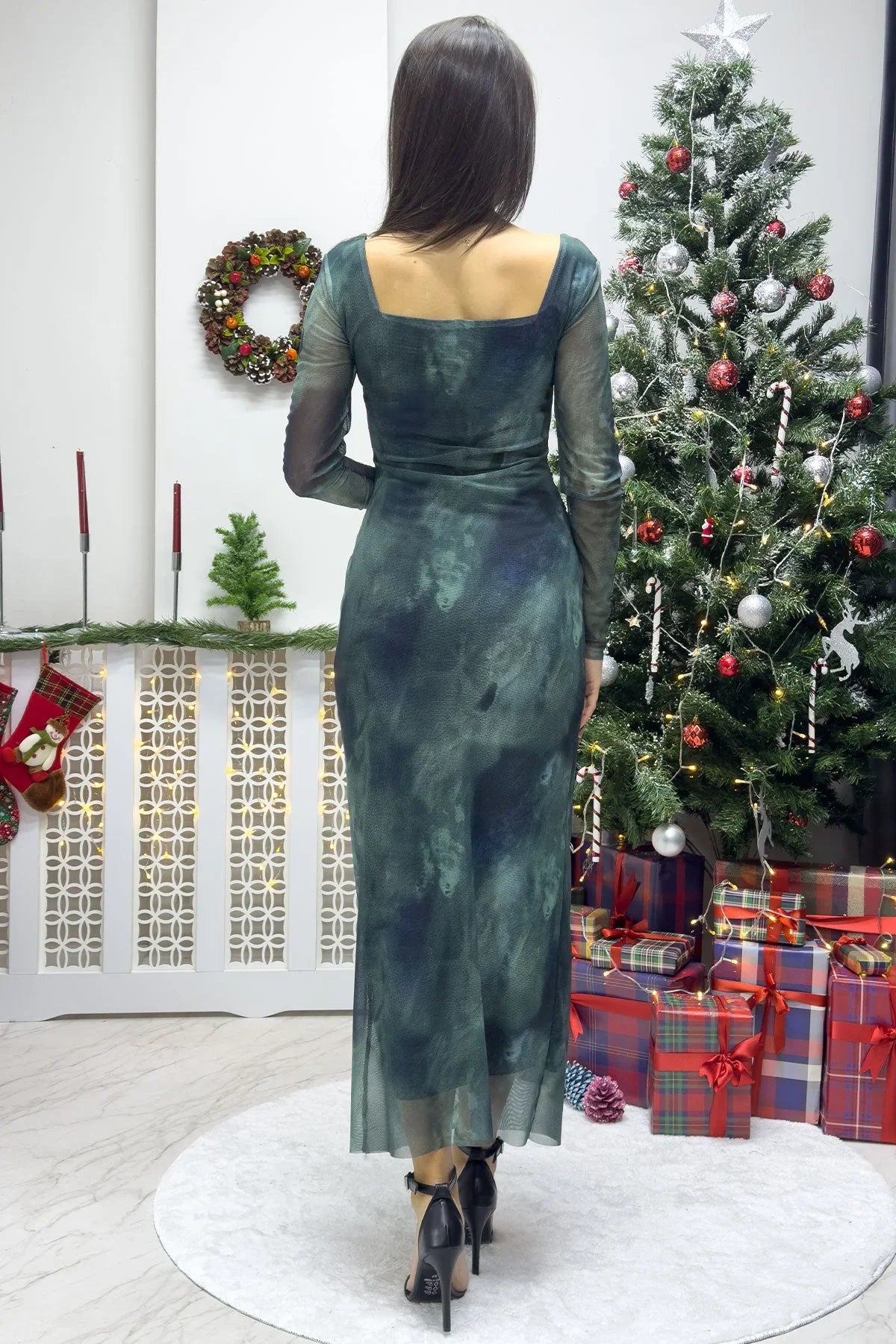 Turkuaz Kare Yaka Likralı Batik Desen Tül Elbise
