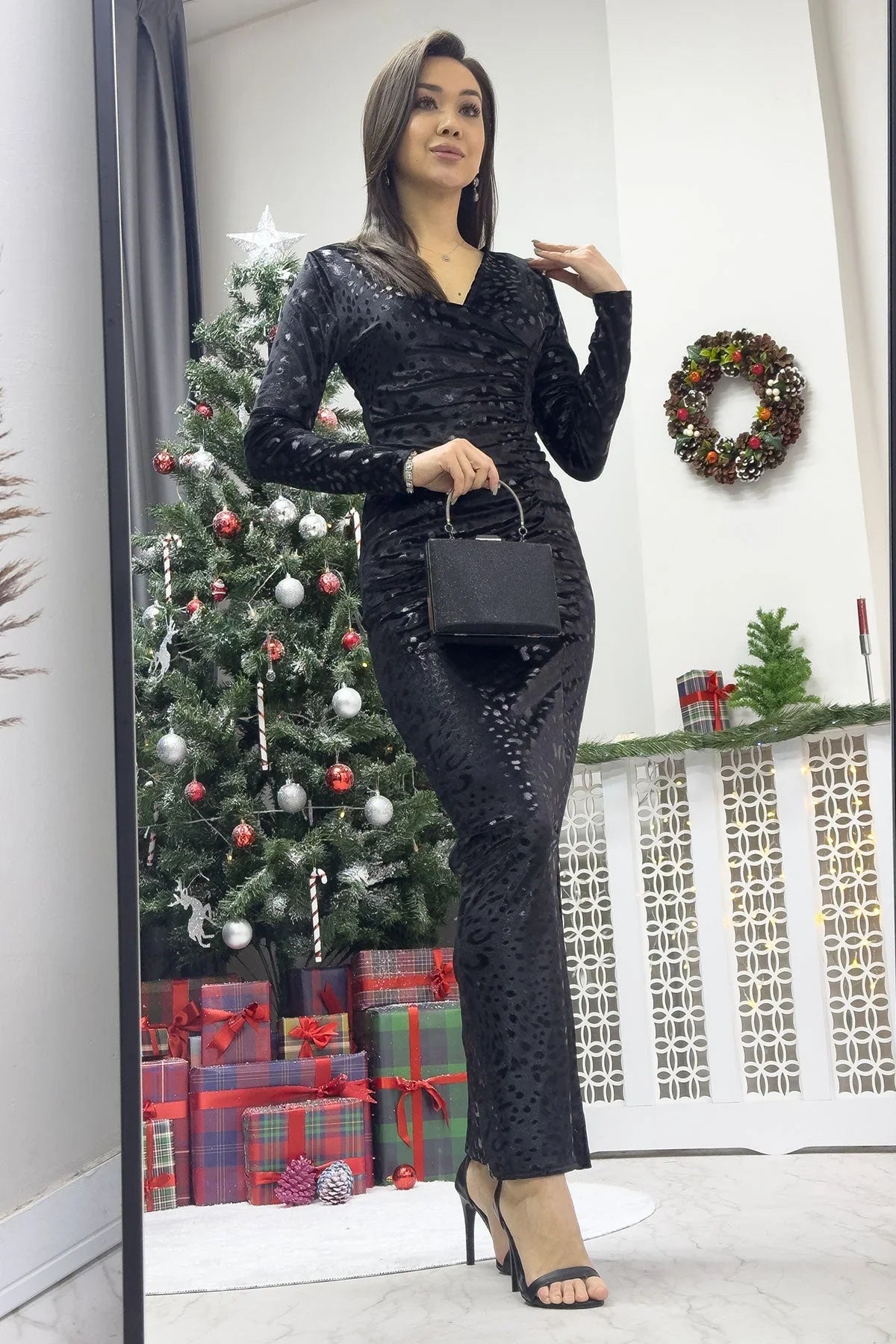 Kadın Siyah Drapeli Kadife Midi Boy Kalem Elbise