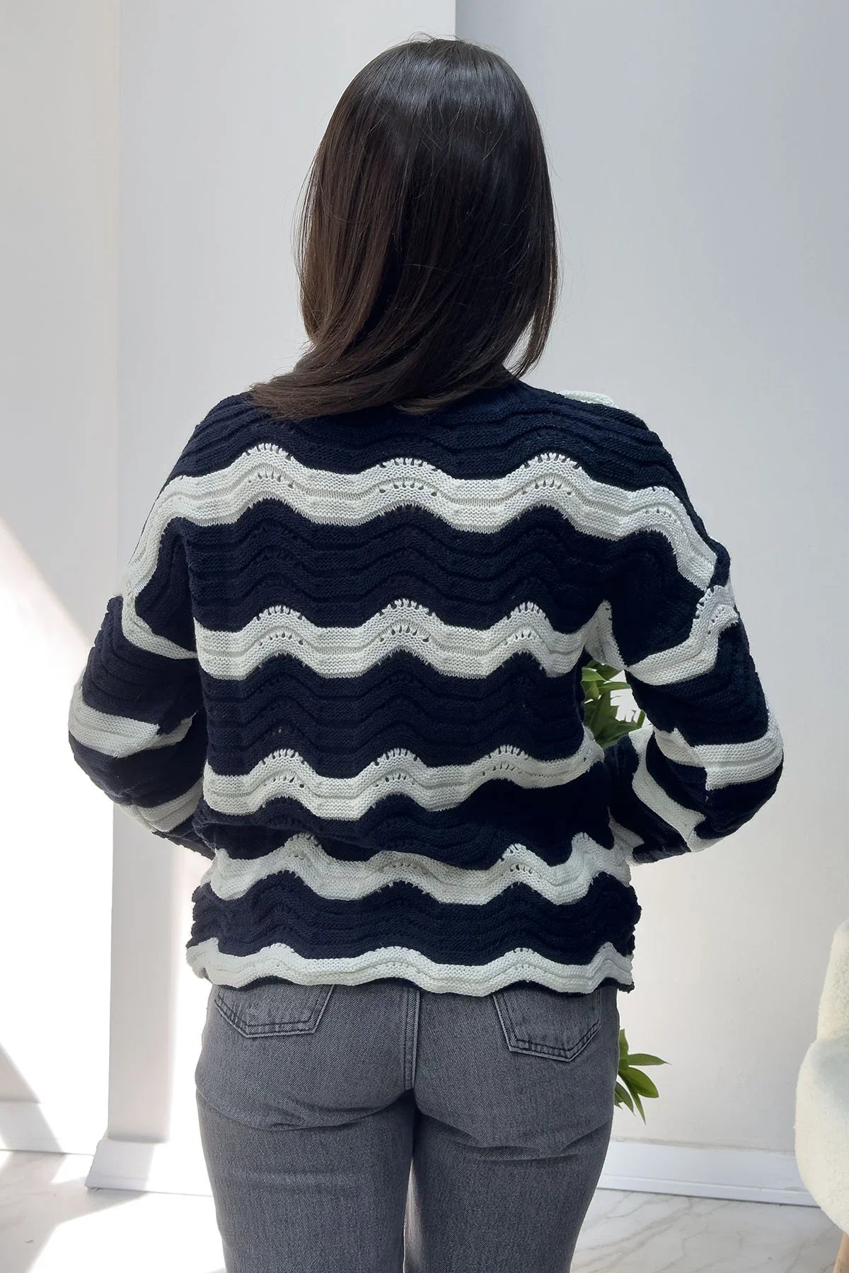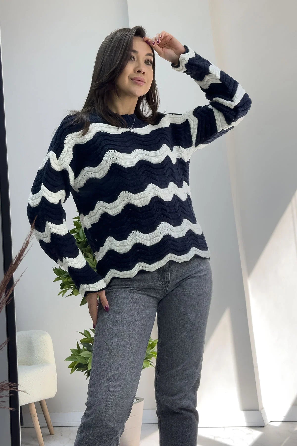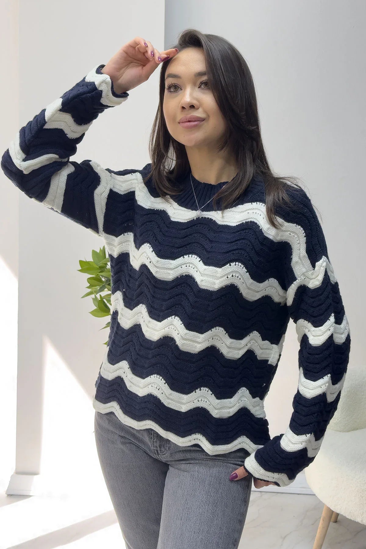 Kadın Lacivert Beyaz Dalga Desen Triko Kazak