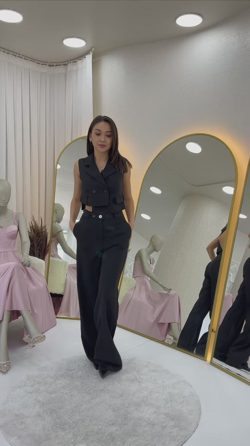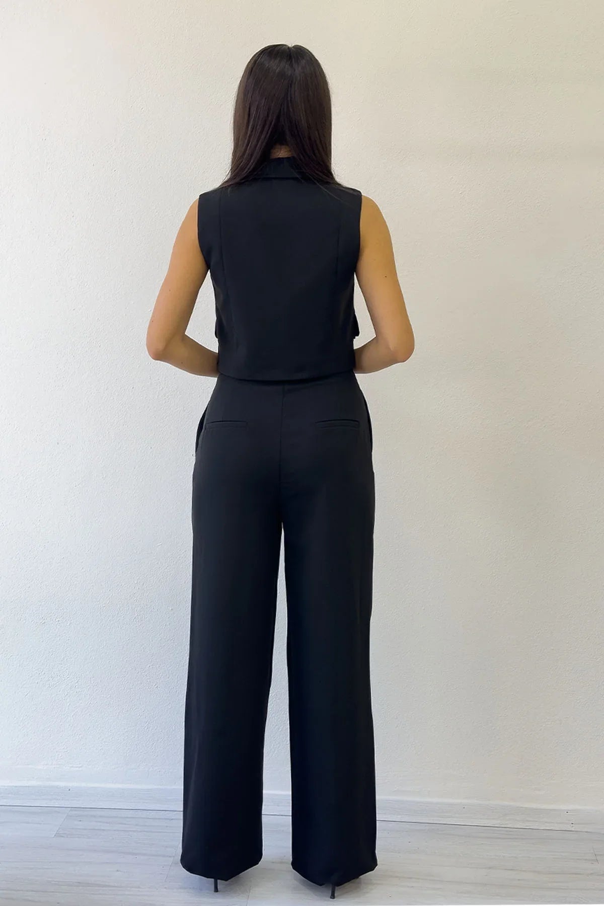 Kadın Siyah Asimetrik Yelek Pantolon İkili Alt Üst Takım