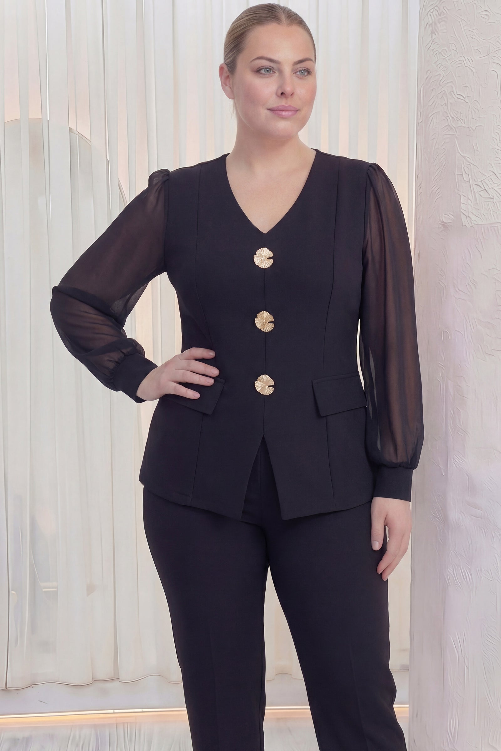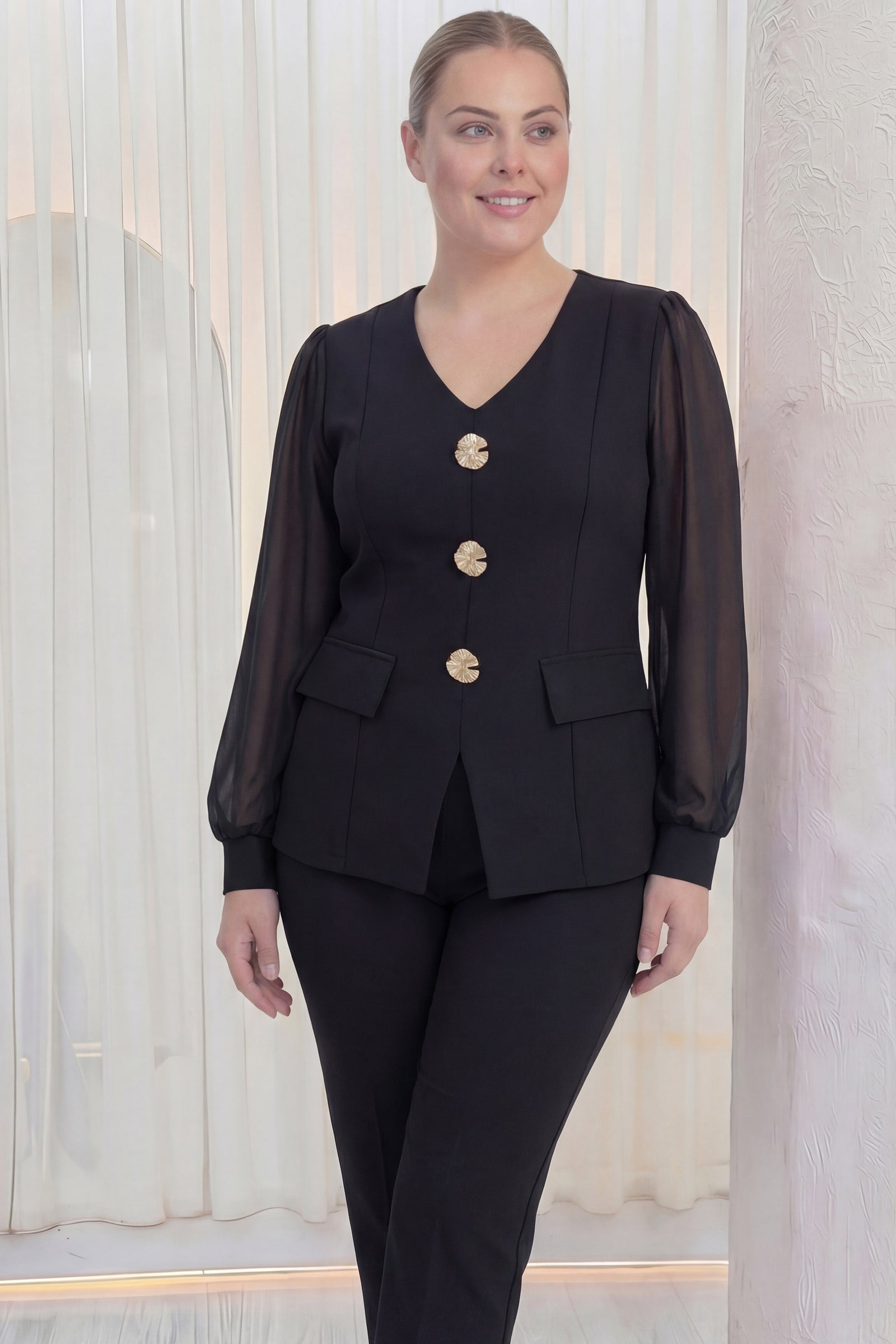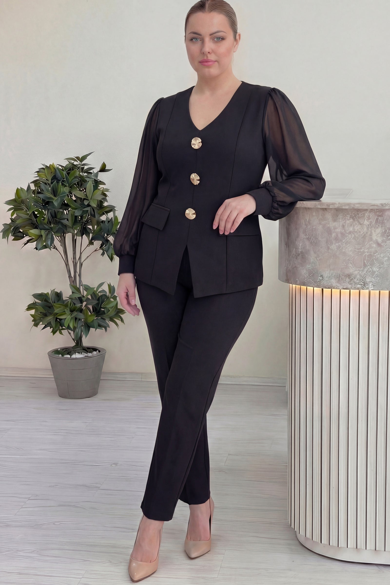 Siyah Gold Düğmeli Şifon Kol Büyük Beden İkili Takım