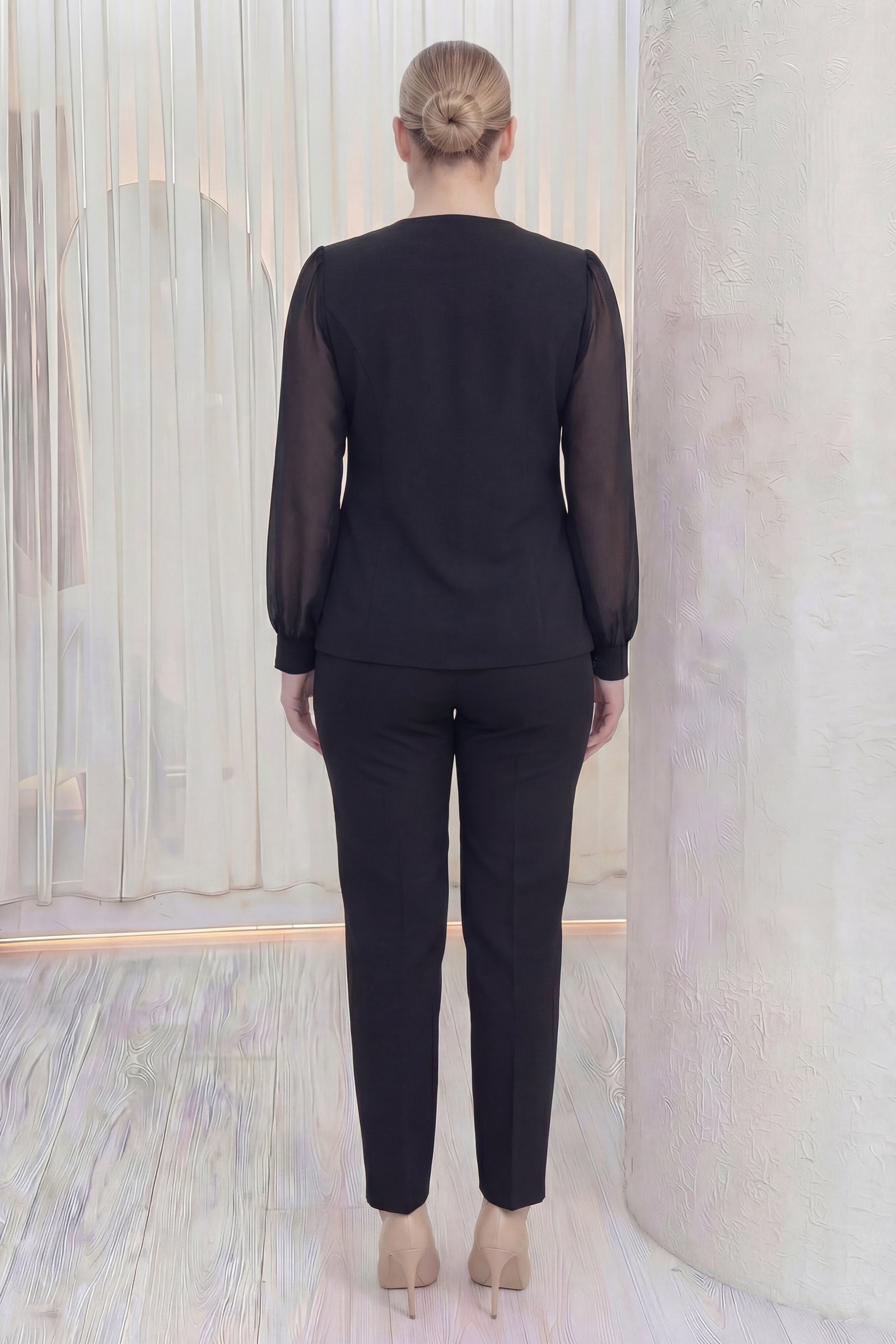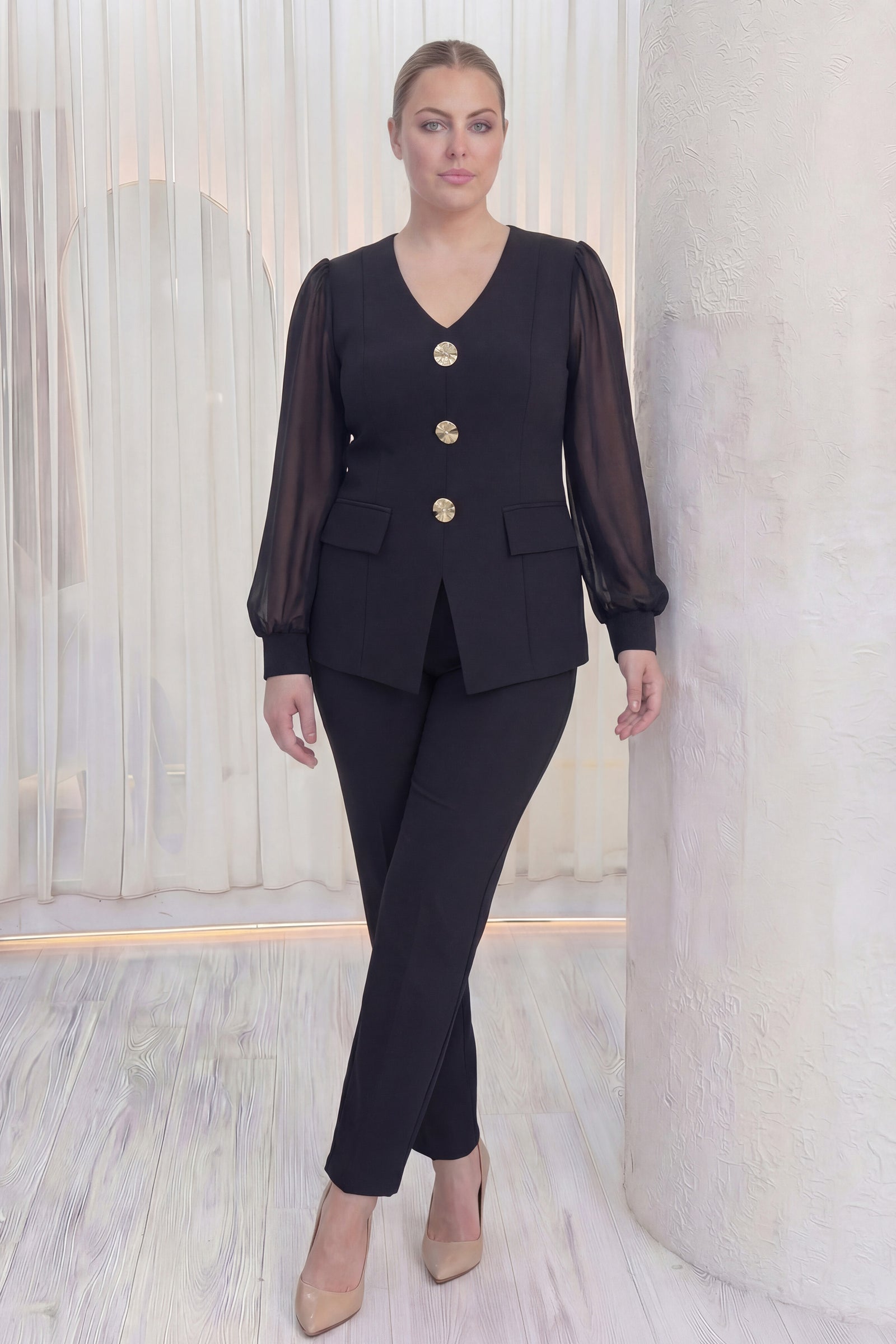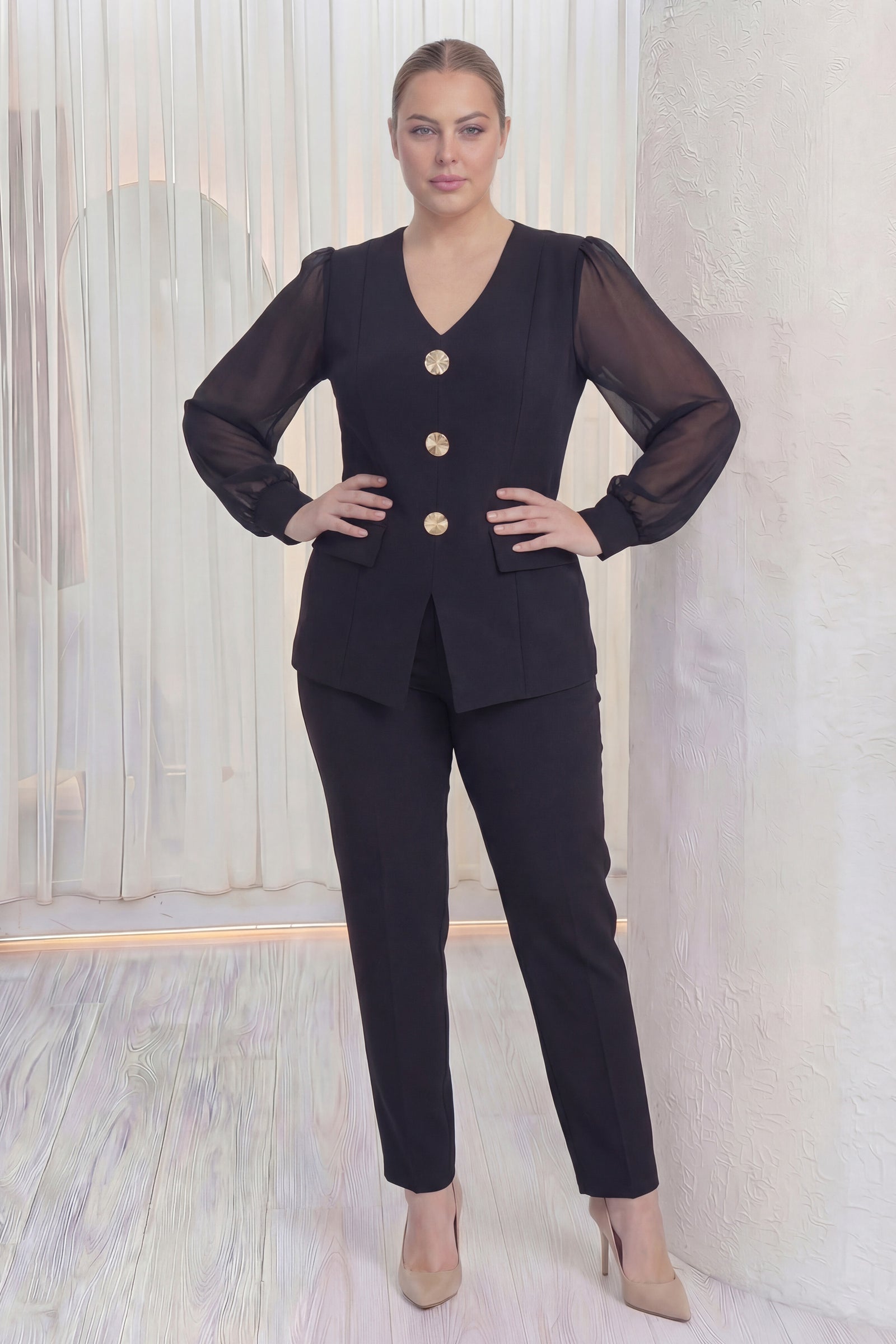 Siyah Gold Düğmeli Şifon Kol Büyük Beden İkili Takım