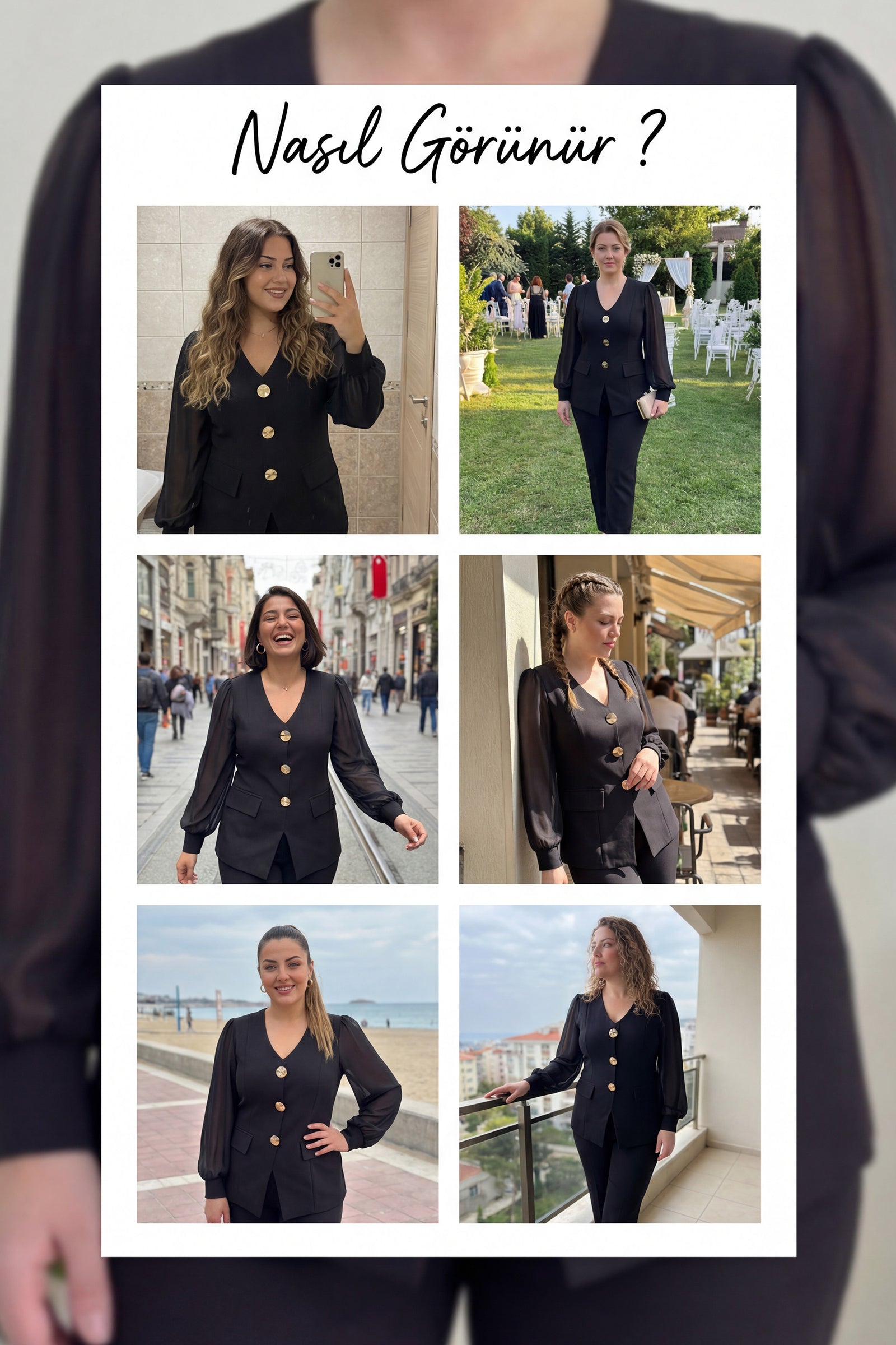Siyahın zamansız gücü ve gold düğme detayının zarif ışıltısı bir arada. Siyah gold düğmeli şifon kol büyük beden ikili takım, hem şık hem konforlu bir kombin arayanlar için tasarlandı. Dengeli kesimi ve akışkan yapısıyla vücut hatlarını nazikçe sarar, büyük beden siluete uyumlu bir görünüm sunar. Tasarım Detayları Üst parçada yer alan gold düğmeler, siyah zemin üzerinde dikkat çekici bir kontrast oluşturur. Bu detay takıma modern ve güçlü bir karakter kazandırır. Şifon kol tasarımı ise hafif ve dökümlü yapısıyla hareket özgürlüğü sağlar. Kol bölgesinde rahatlık sunarken aynı zamanda zarif bir hava oluşturur. Vücuda oturan ancak sıkmayan kalıp yapısı sayesinde hem feminen hem dengeli bir siluet elde edilir. İkili takım formu, kombin kolaylığı sağlar. Parçalar ayrı ayrı da kullanılabilir; bu yönüyle gardırobunuzda çok yönlü bir alternatif sunar. Kumaş ve Konfor Akışkan ve form tutan kumaşı sayesinde gün boyu konfor sağlar. İç göstermeyen yapısı ile güvenle tercih edilebilir. Şifon kol detayı hafiflik katar ve uzun süreli kullanımlarda rahatlık sunar. Hem özel günlerde hem de şık günlük kombinlerde rahatlıkla kullanılabilir. Nerelerde Giyilir? Nişan ve söz organizasyonları Akşam davetleri Bayram kombinleri Şık ofis etkinlikleri Özel kutlamalar Topuklu ayakkabı ve gold aksesuarlarla kombinlendiğinde etkileyici bir davet stili oluşturur. Daha sade bir görünüm için minimal takılar tercih edilebilir. Büyük Beden Uyumlu Kalıp Büyük beden kullanıcılar için özel tasarlanan kesimi sayesinde bel ve kalça hattını dengeli şekilde sarar. Şifon kol yapısı rahat hareket imkanı sunar. Tam kalıptır, kendi bedeninizi tercih edebilirsiniz. Neden Bu Takım? Siyah büyük beden şık takım arayanlar için zamansız tasarım Gold düğme detayı ile modern görünüm Şifon kol sayesinde hafif ve konforlu kullanım Hem özel gün hem günlük şık kombin imkanı Parçaları ayrı ayrı kombinlenebilir yapı Siyahın güçlü ve asil duruşunu gold detayın zarif ışıltısı ile tamamlayan bu büyük beden ikili takım, hem şıklık hem rahatlık arayanlar için ideal bir seçim.