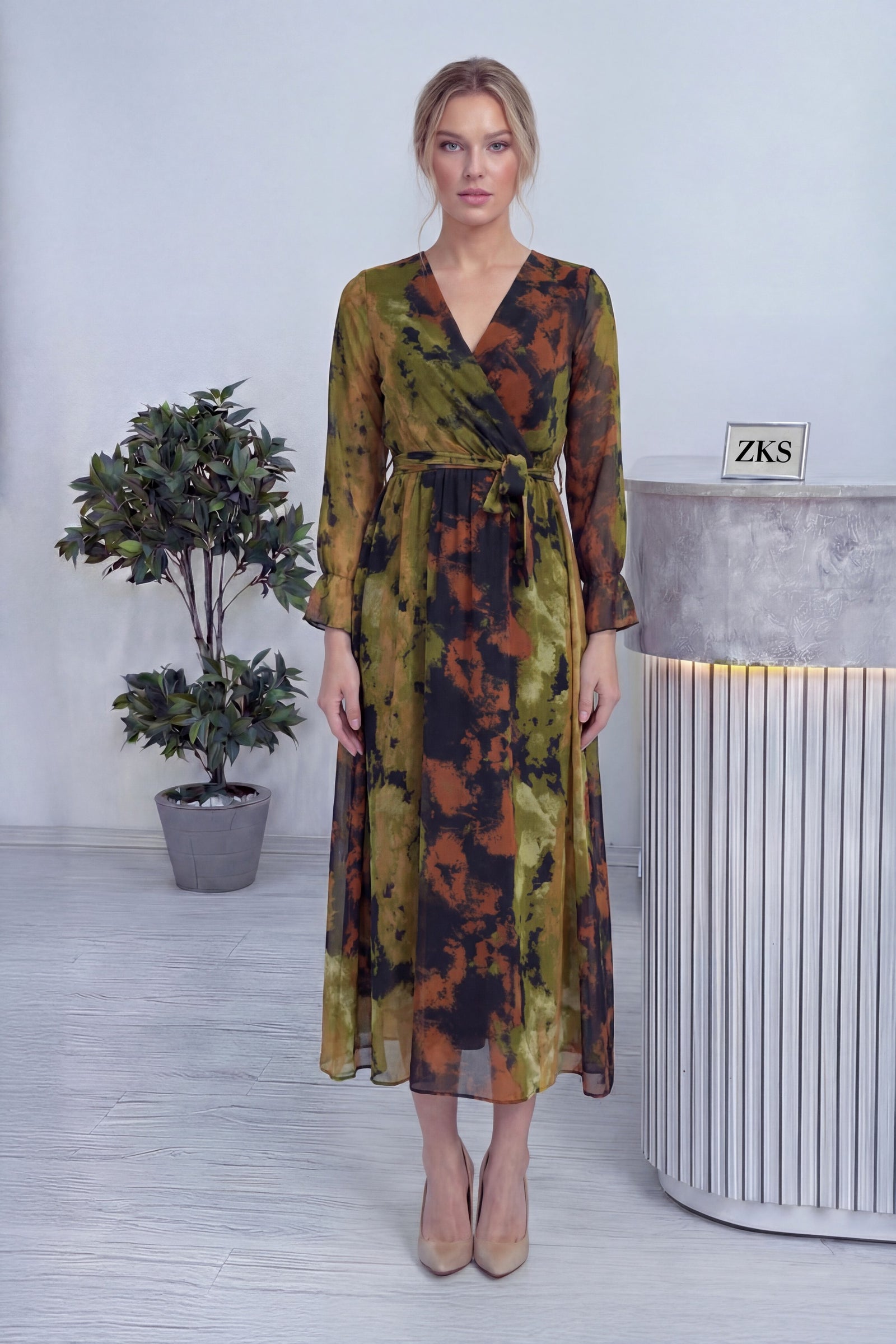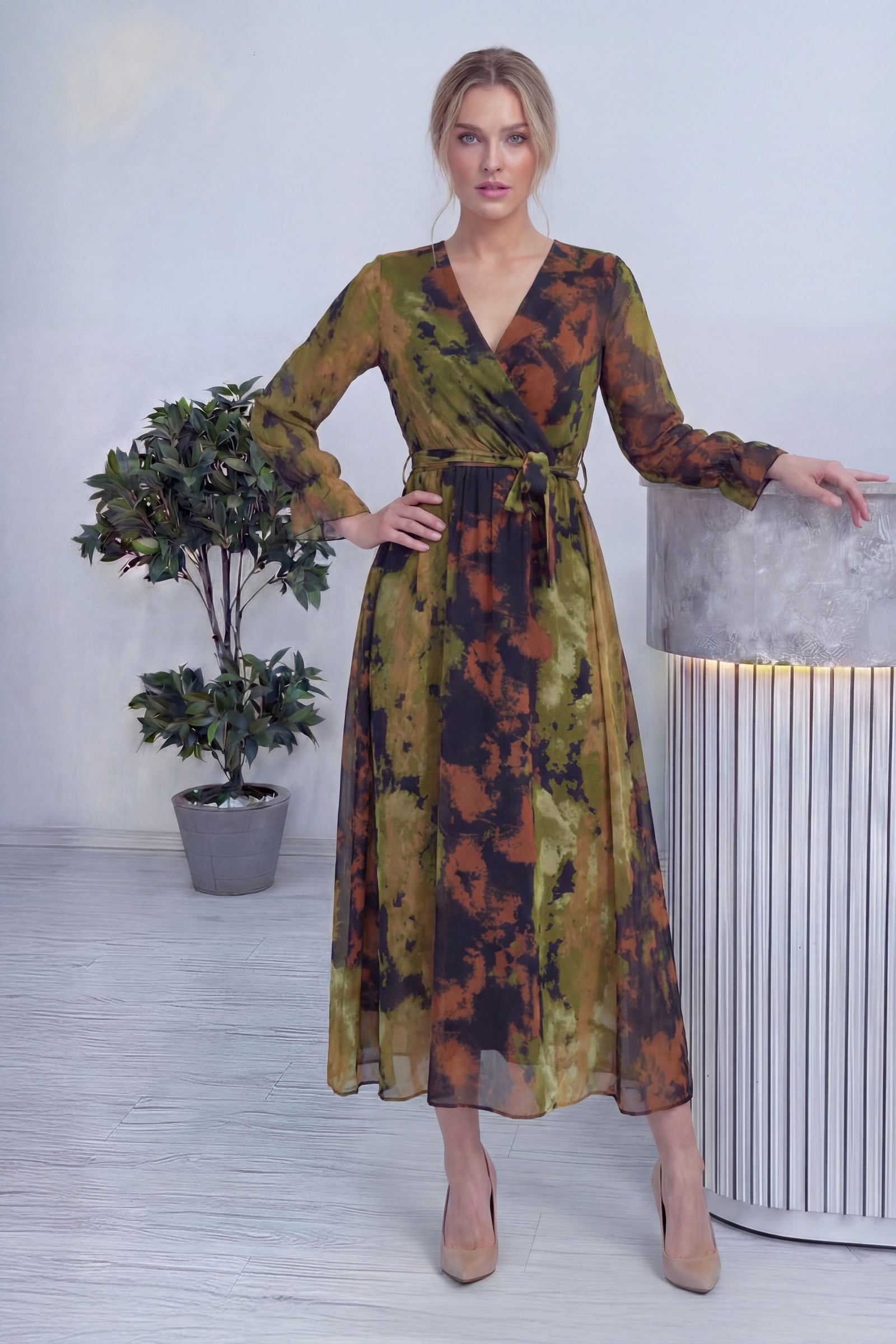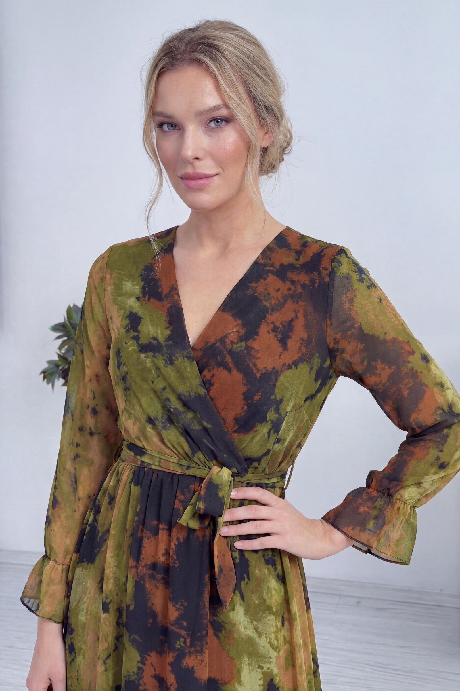 Batik Desen Kruvaze Yaka Şifon Büyük Beden Elbise