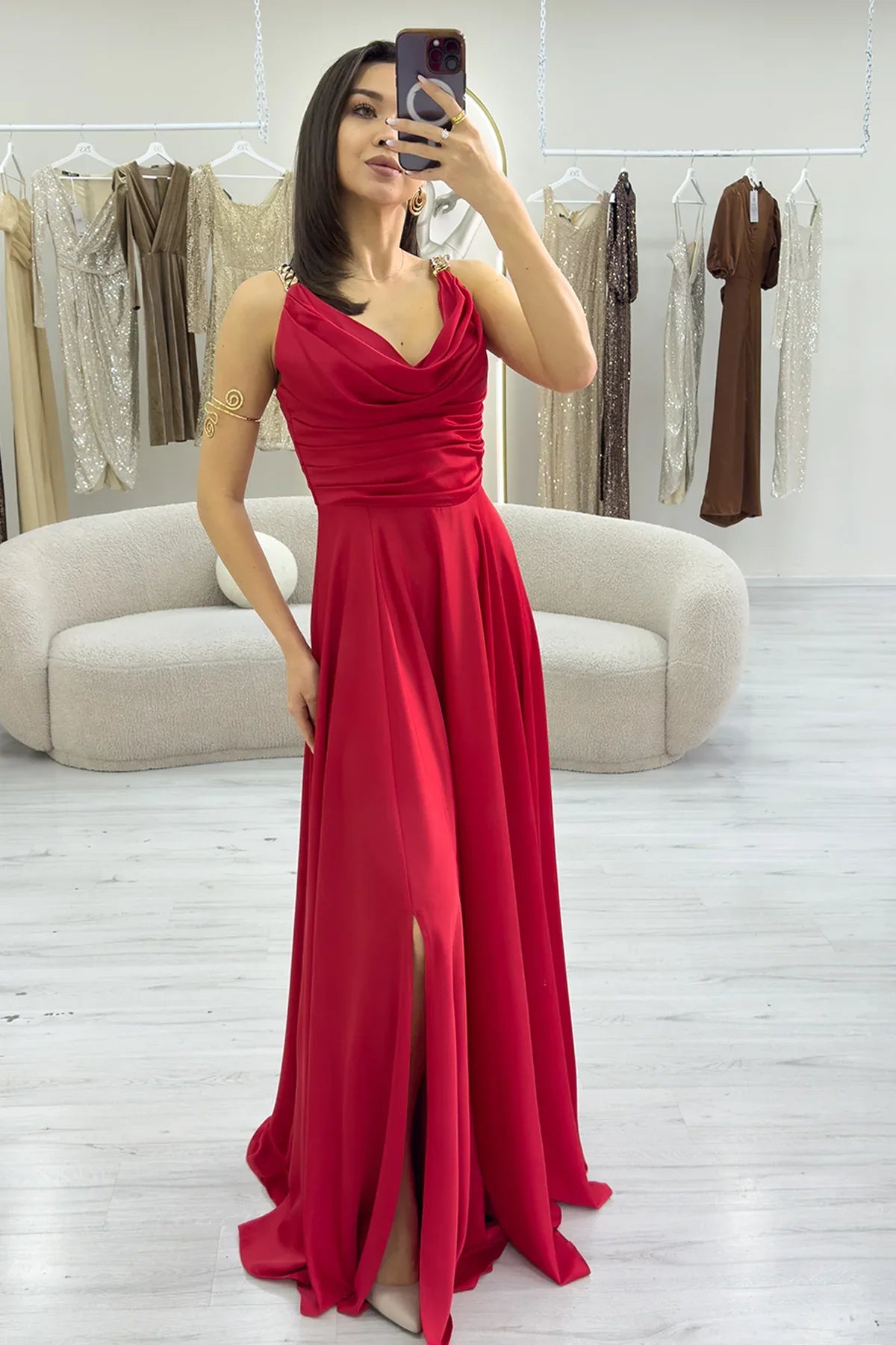 Kırmızı Gold Askılı Ön Drapeli Saten Yırtmaçlı Abiye Elbise