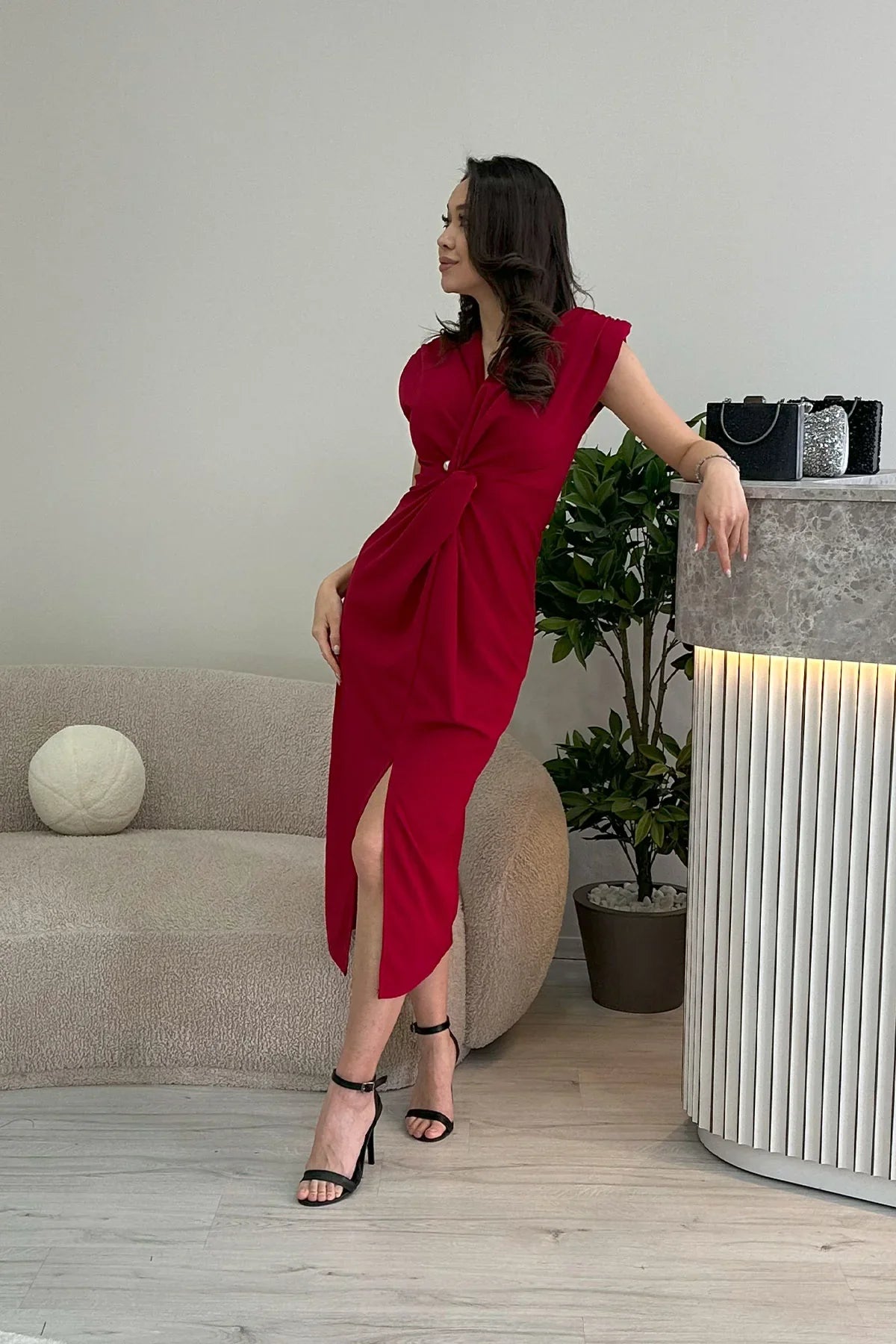 Kadın Kırmızı Kruvaze Yaka İnci Detay Büzgülü Midi Boy Elbise