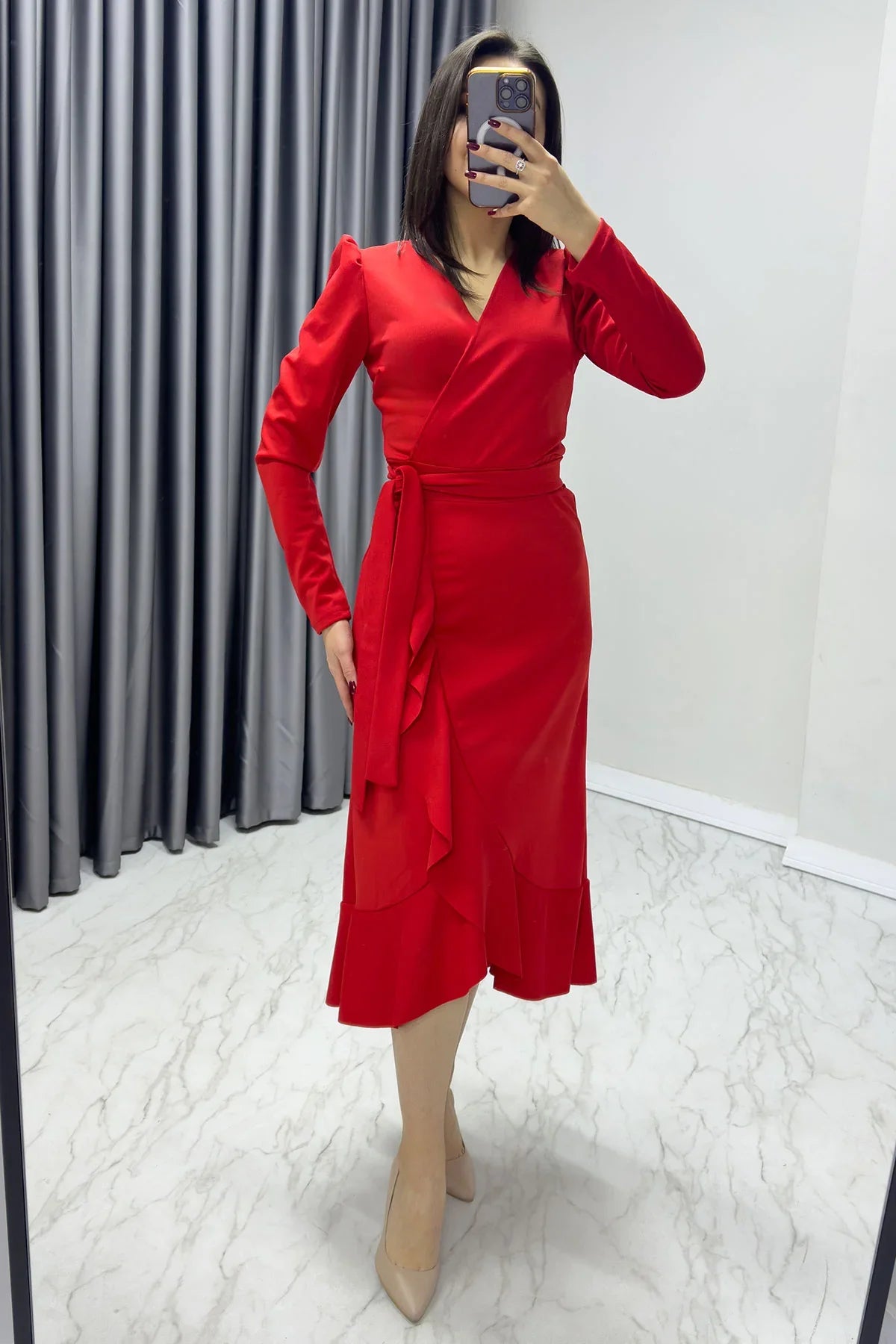 Kırmızı Krep Volanlı Kruvaze Büyük Beden Elbise