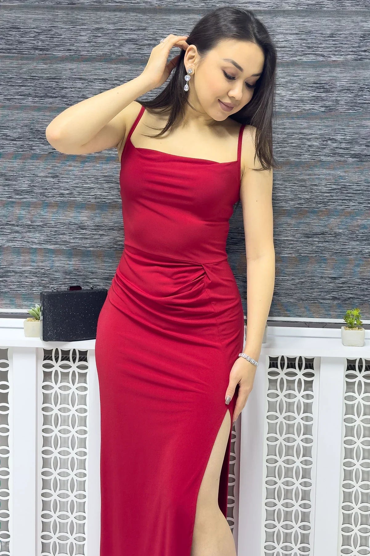 Kırmızı Scuba Yırtmaçlı Askılı Elbise