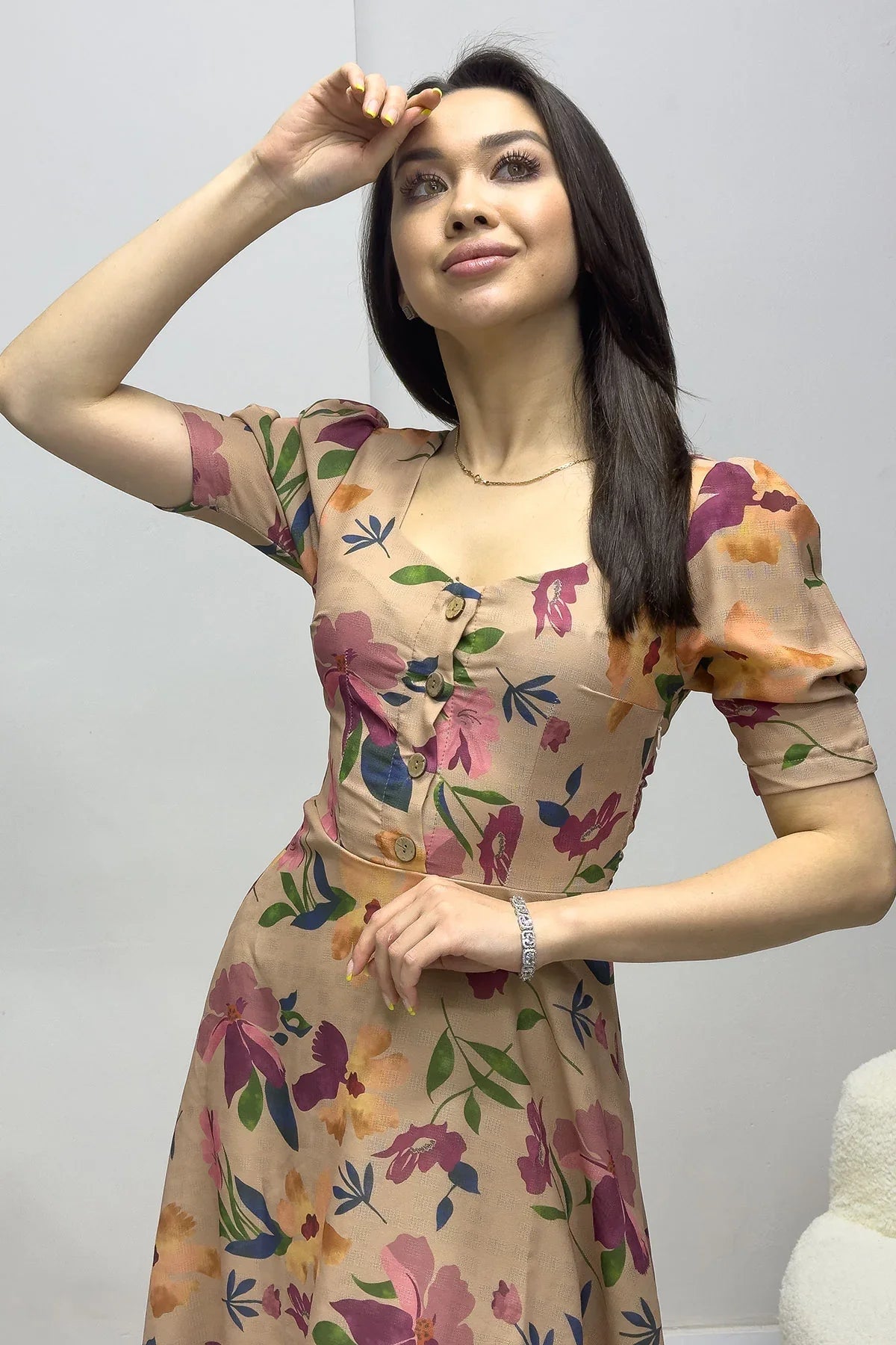 Bej Kısa Kol Yazlık Çiçek Desenli Elbise