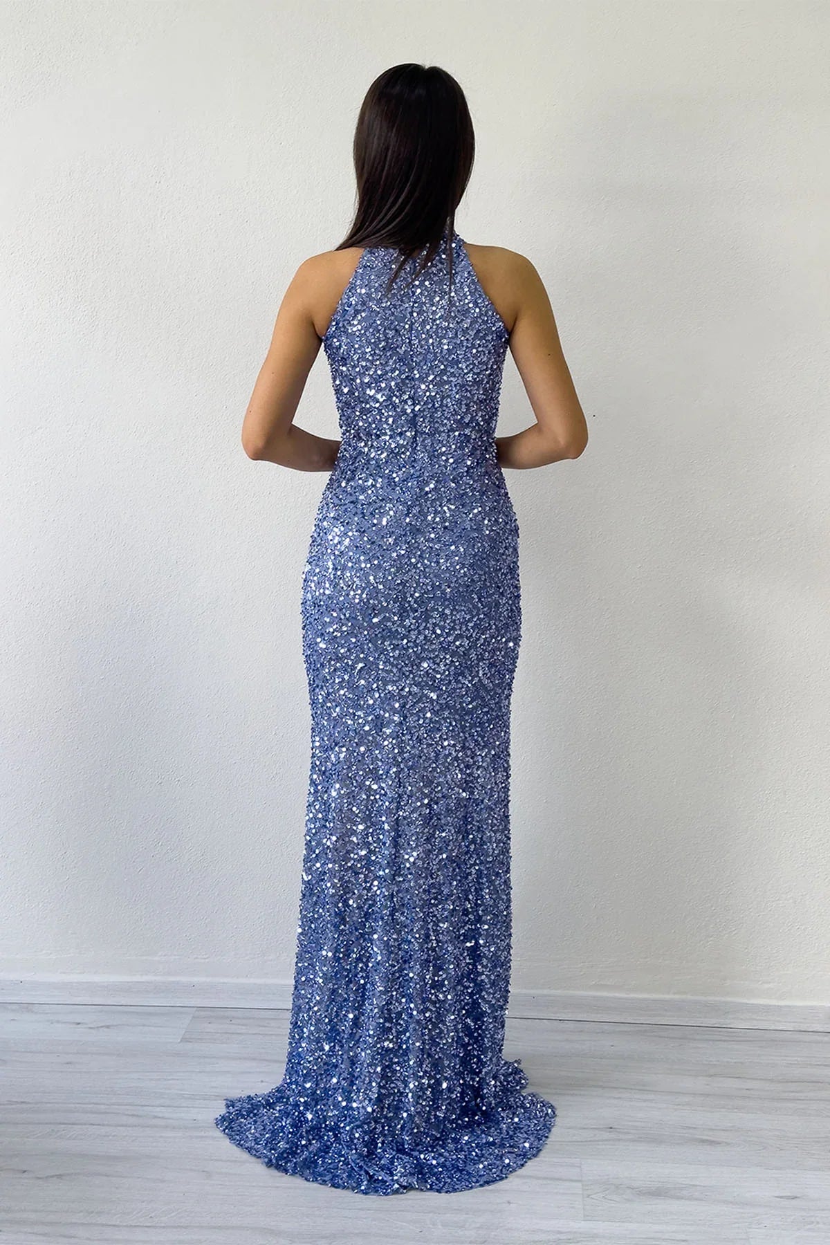 Bebe Mavi Halter Yaka Pul Payet Kuyruklu Abiye Elbise