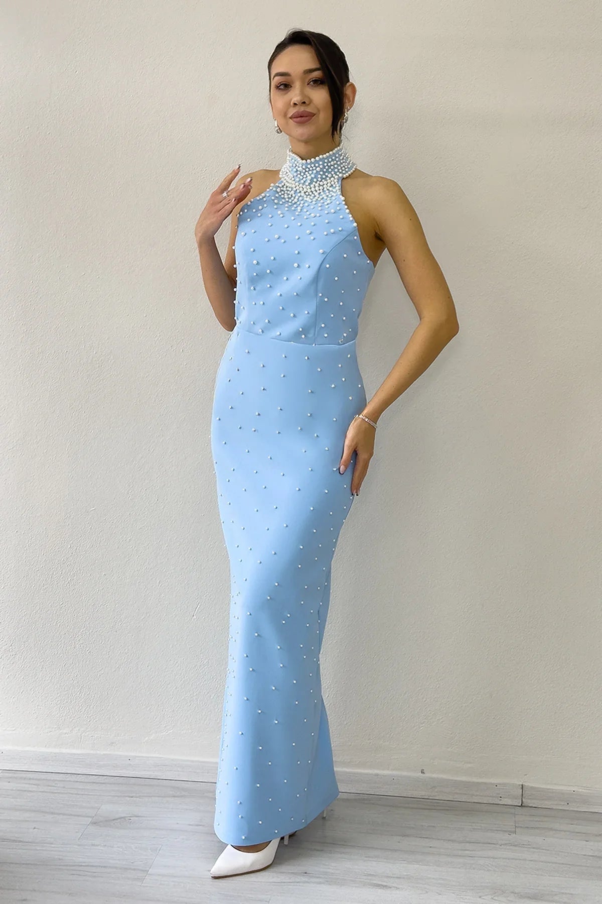 Kadın Bebe Mavi İncili Halter Yaka Abiye Elbise