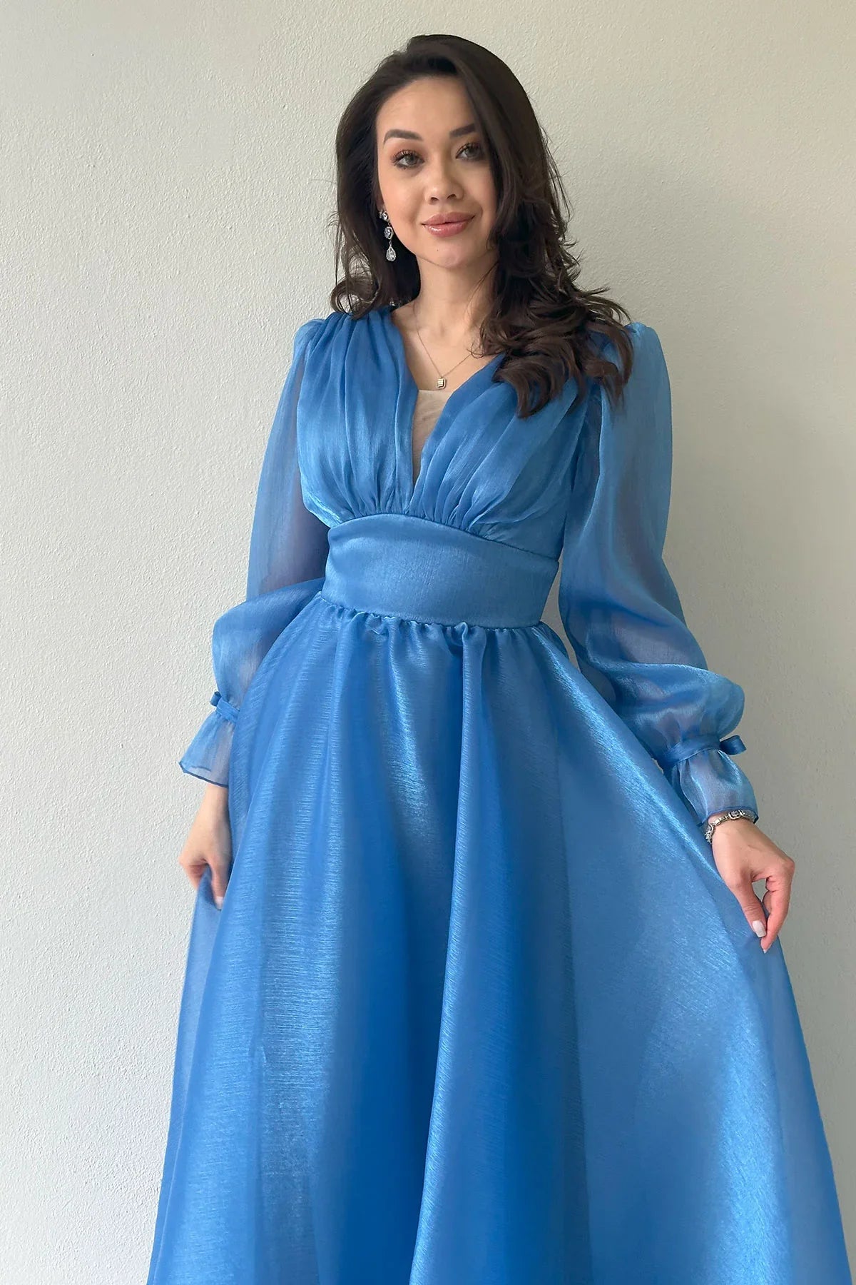 Asimetrik Etek İndigo Karpuz Kol Prenses V Yaka Abiye Elbise