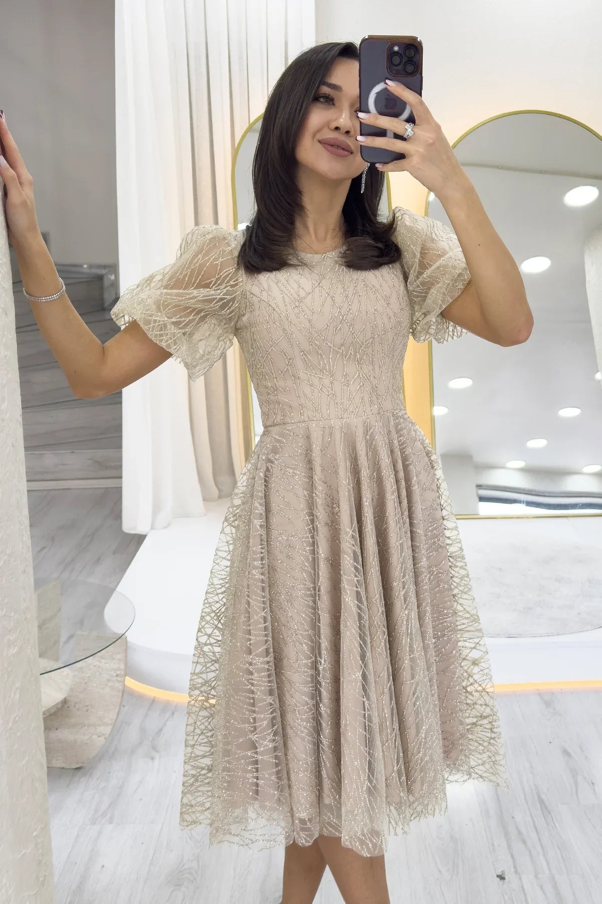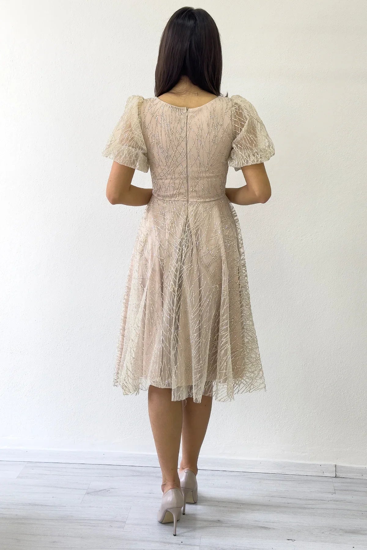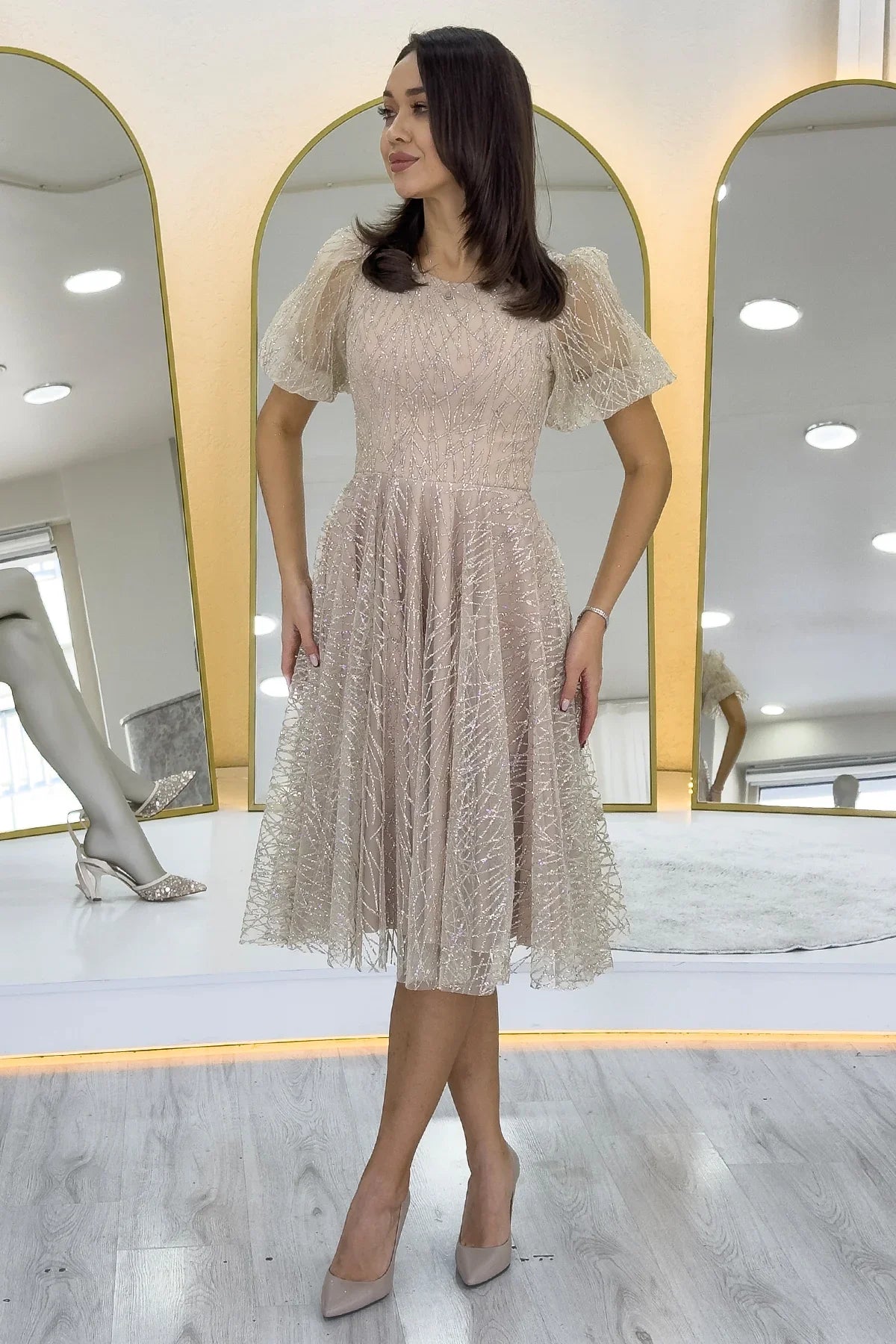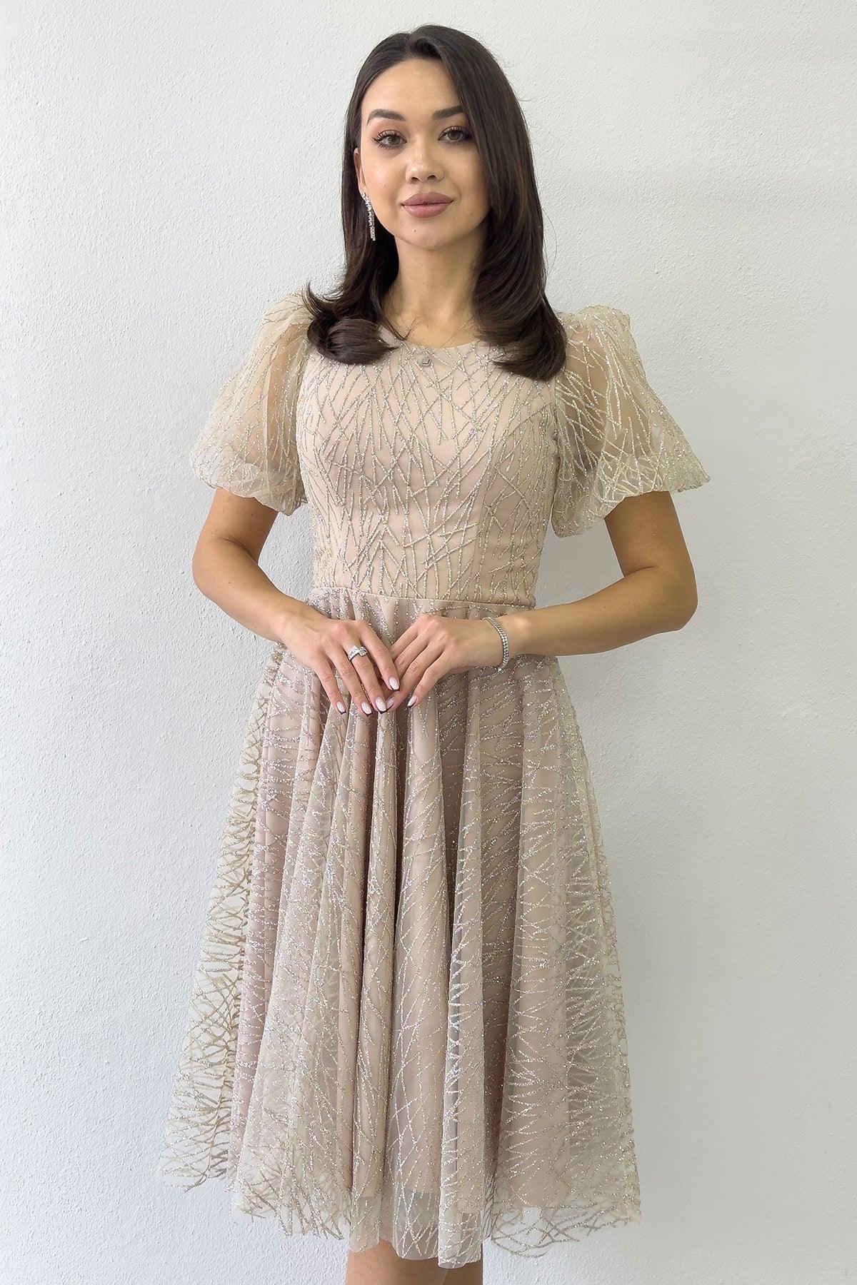 Gold Balon Kol Simli Kloş Midi Boy Abiye Elbise
