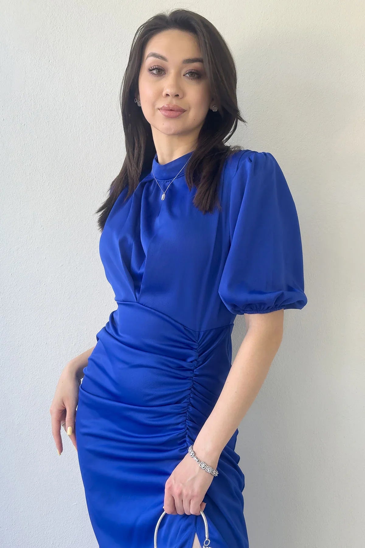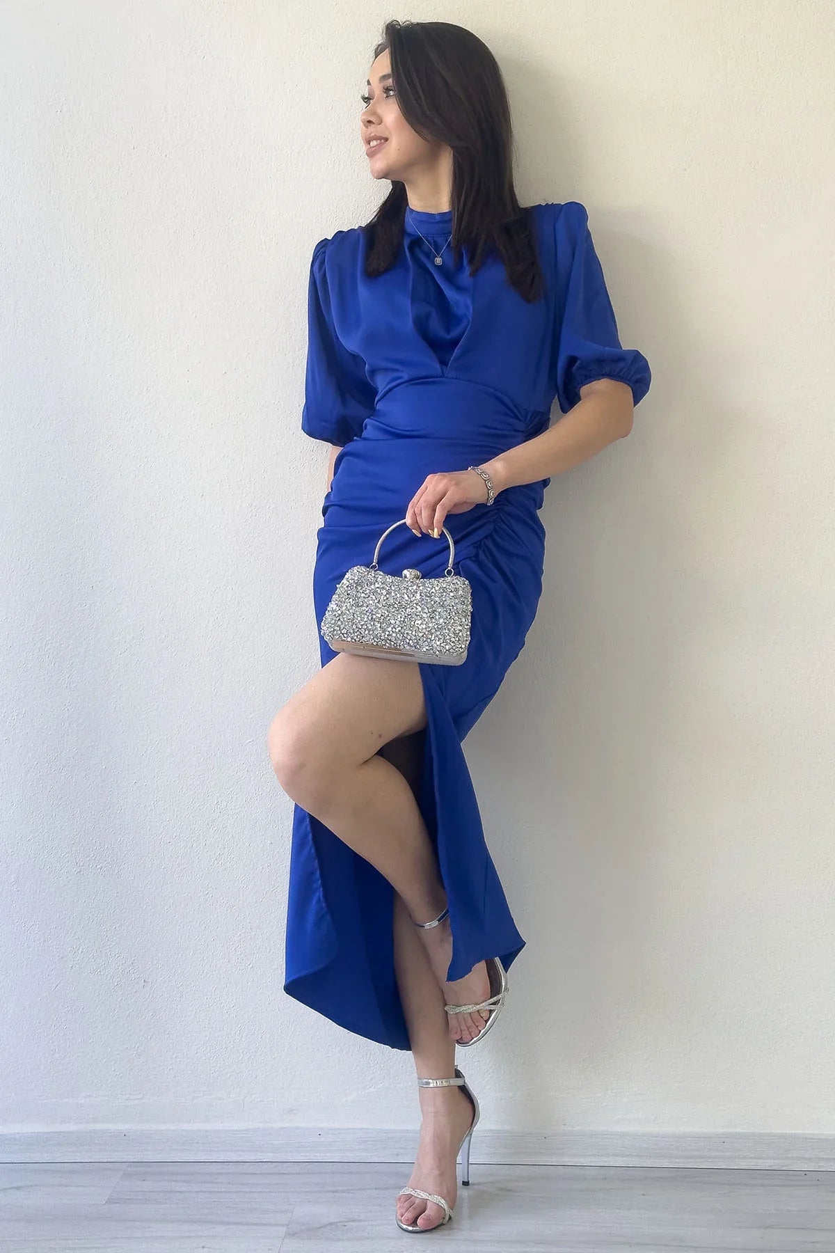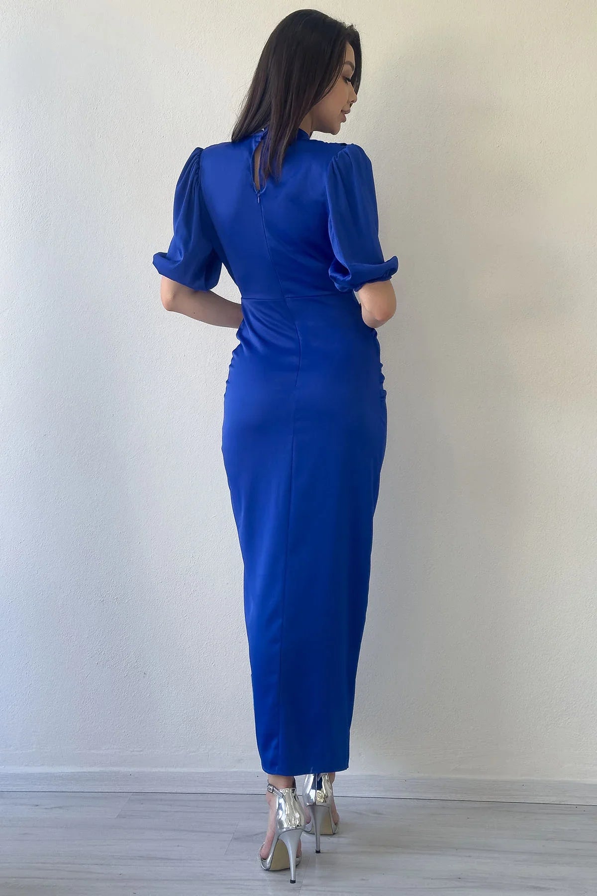 Kadın Saten Balon Kol Drapeli Yırtmaç Detaylı Abiye Elbise-Saks