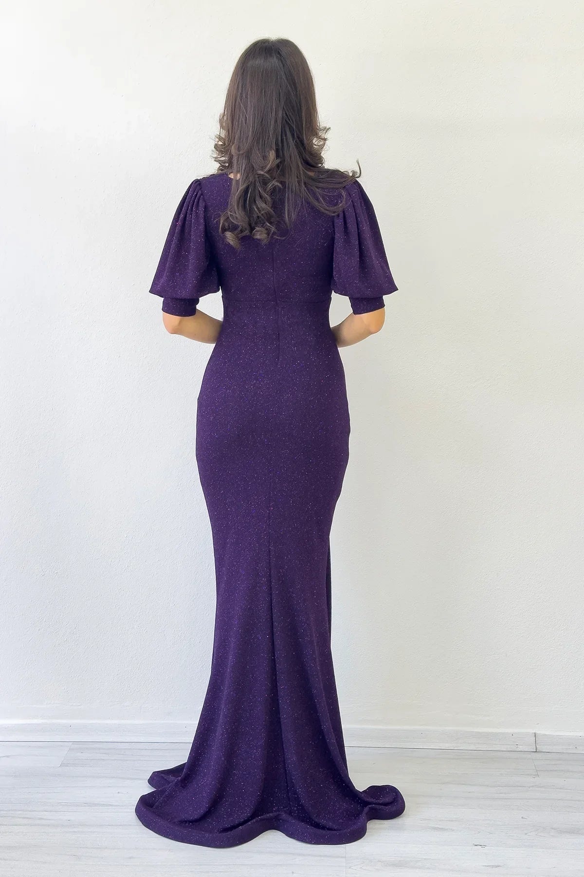 Mor Balon Kol Simli Drapeli Volan Detay Balık Abiye Elbise
