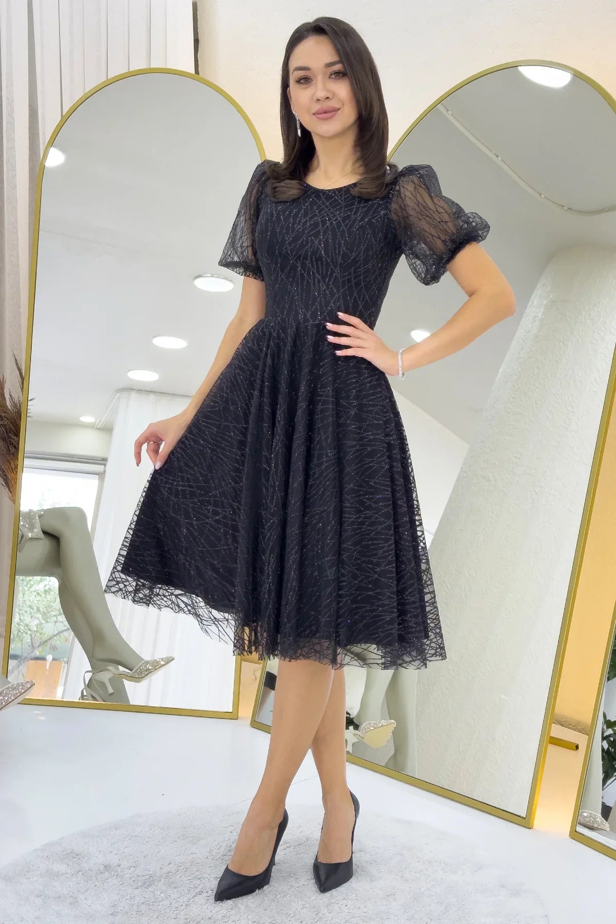 Siyah Balon Kol Simli Kloş Midi Boy Abiye Elbise
