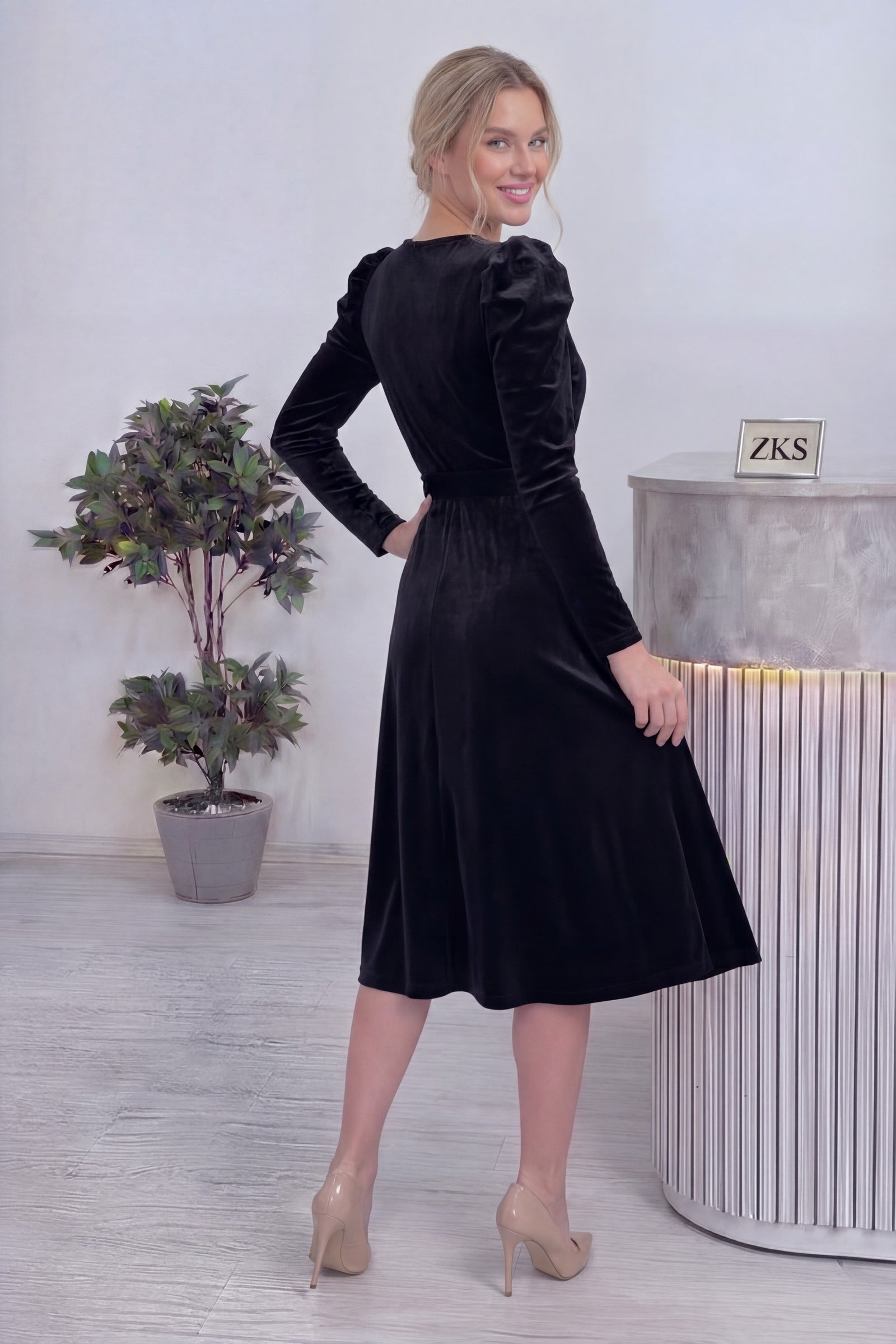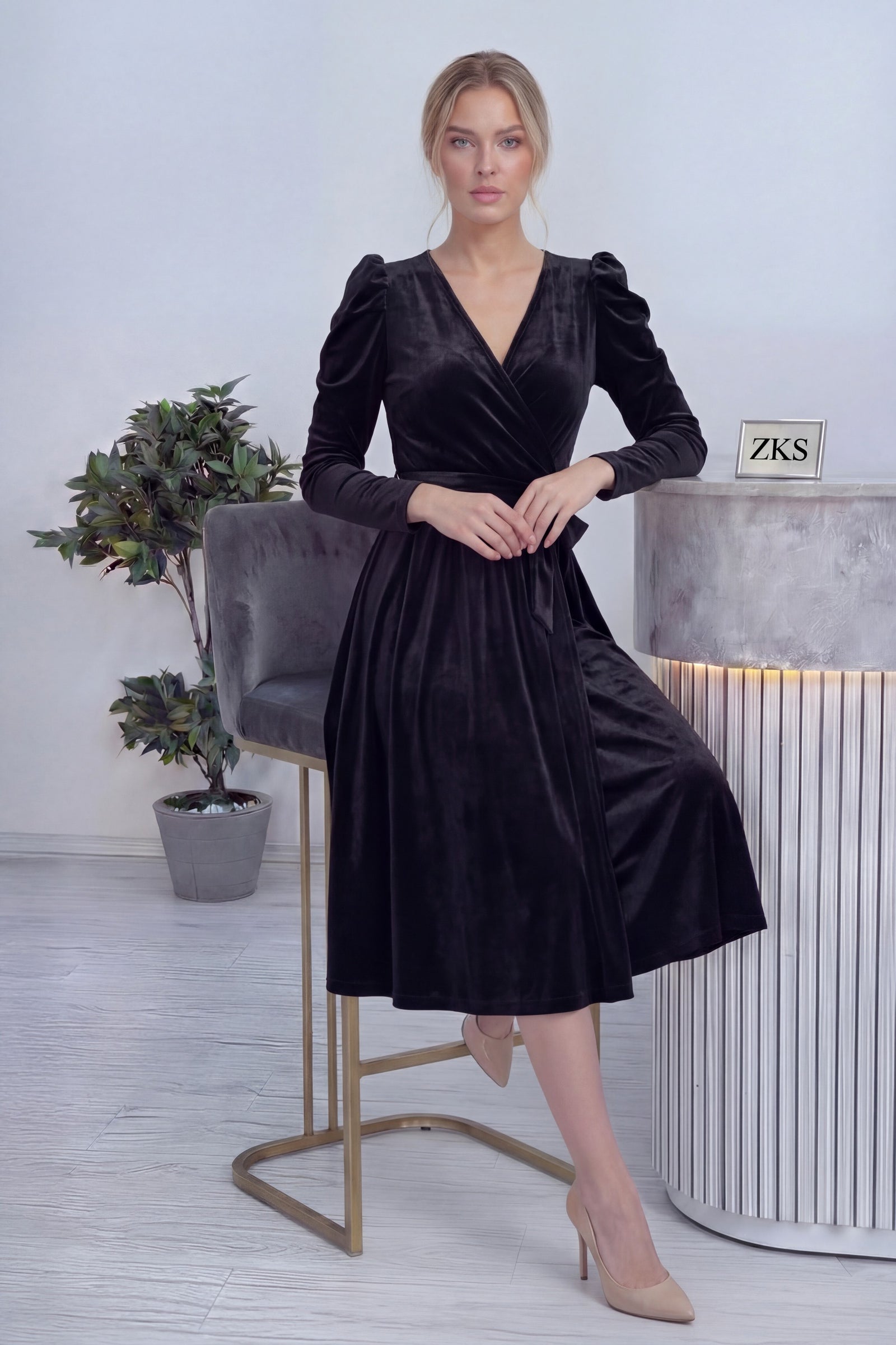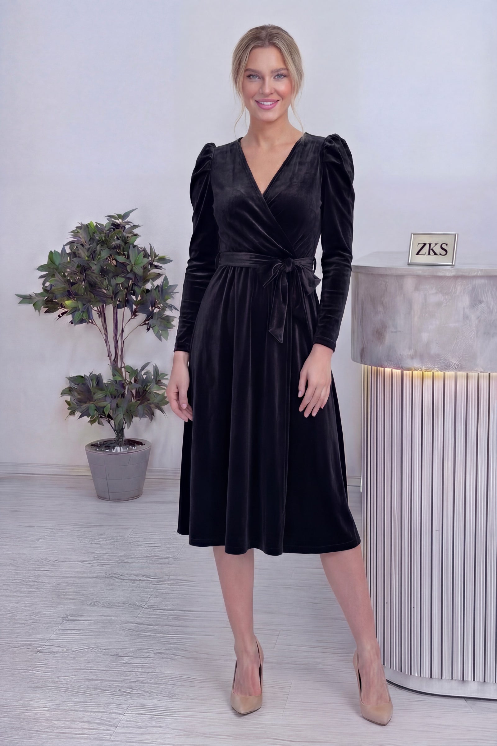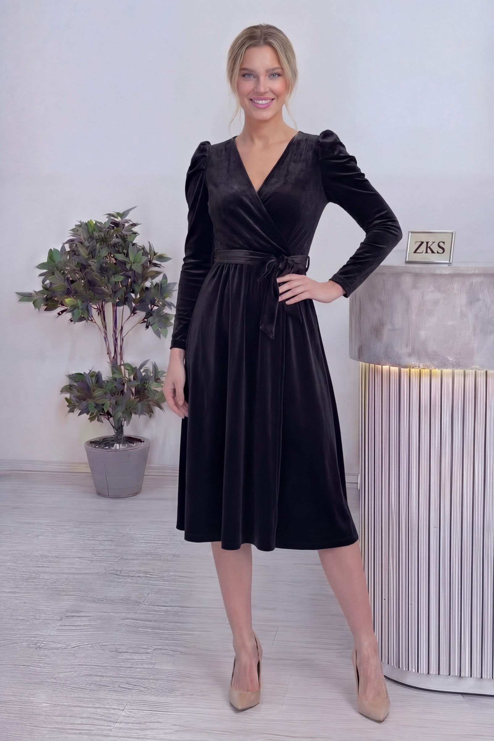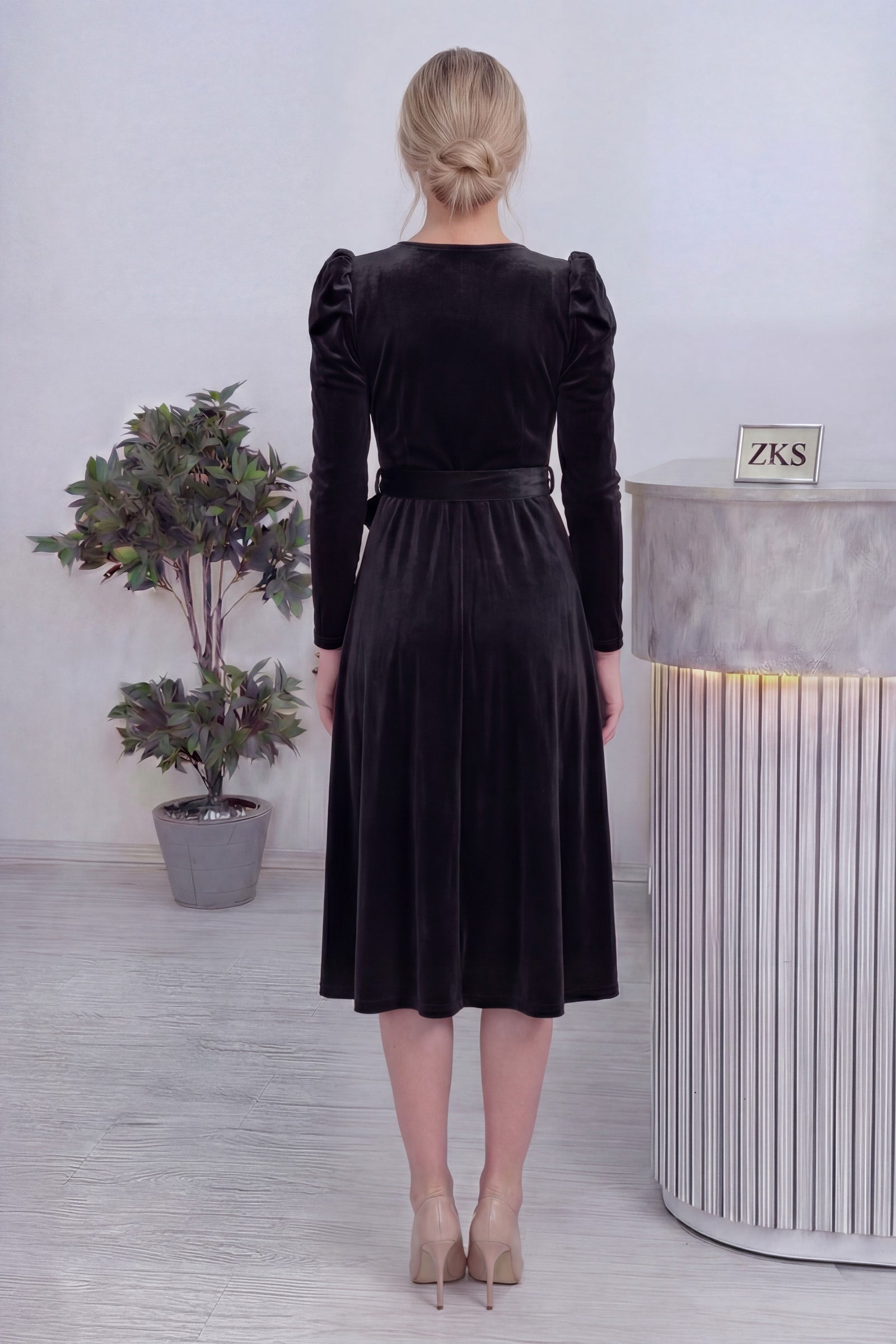 Siyah Kadın Karpuz Kol Kruvaze Kadife Kuşaklı Büyük Beden Elbise