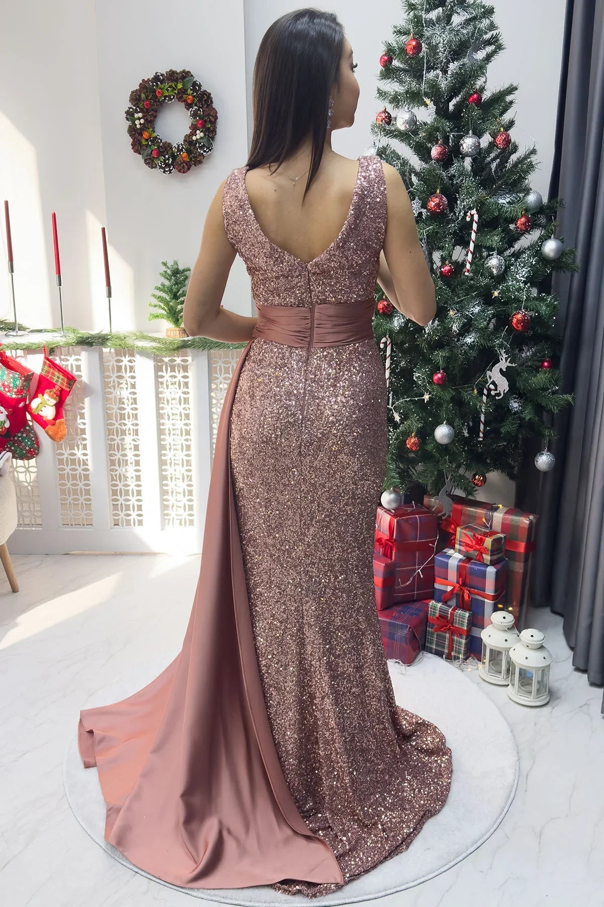 Pudra Pul Payet Kuyruklu Bel Saten Drapeli Büyük Beden Abiye Elbise