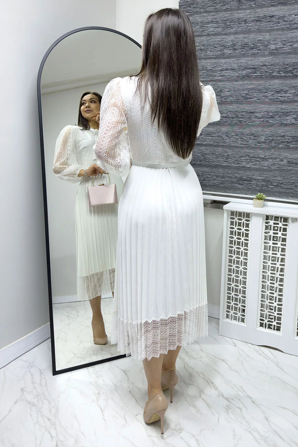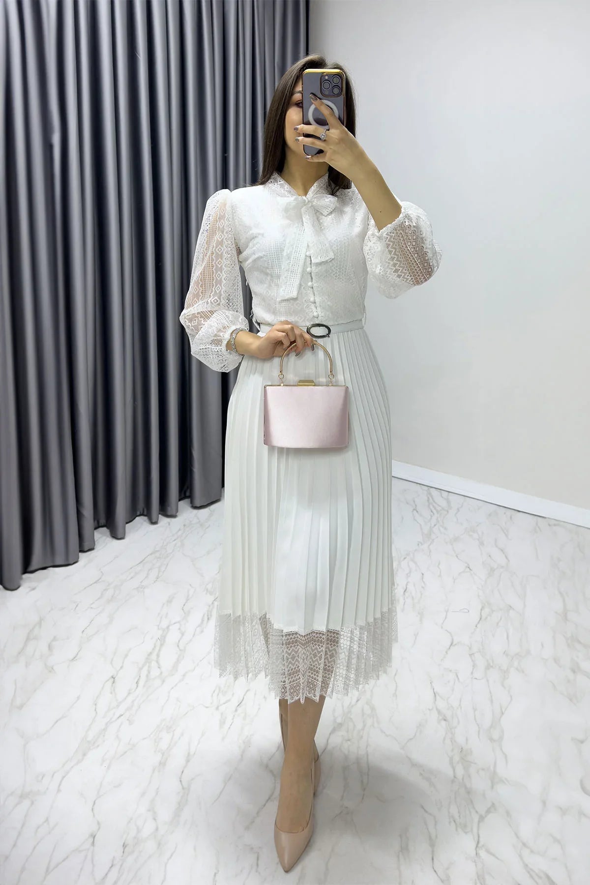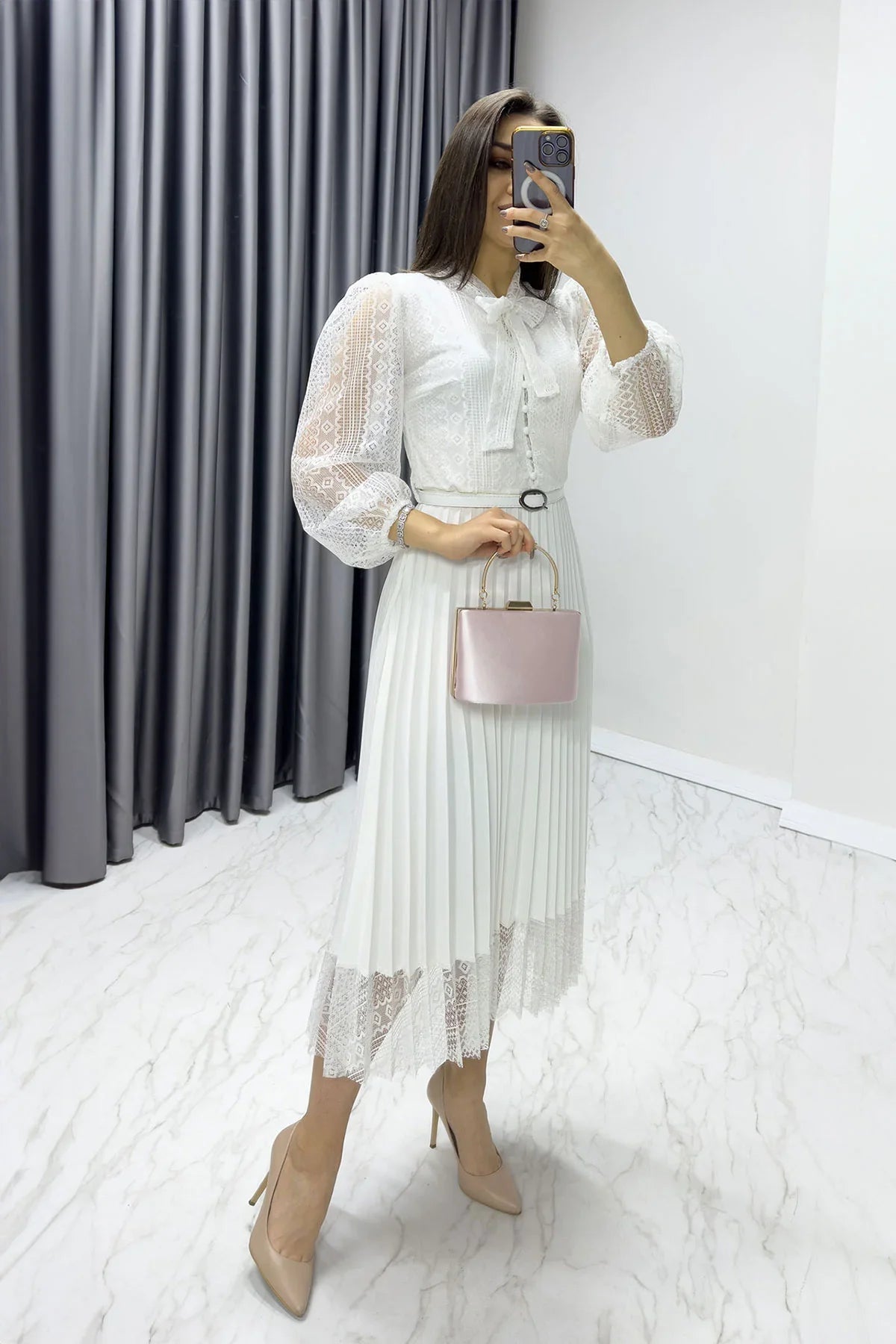 Beyaz Boyundan Bağlamalı Fransız Güpür Piliseli Abiye Elbise