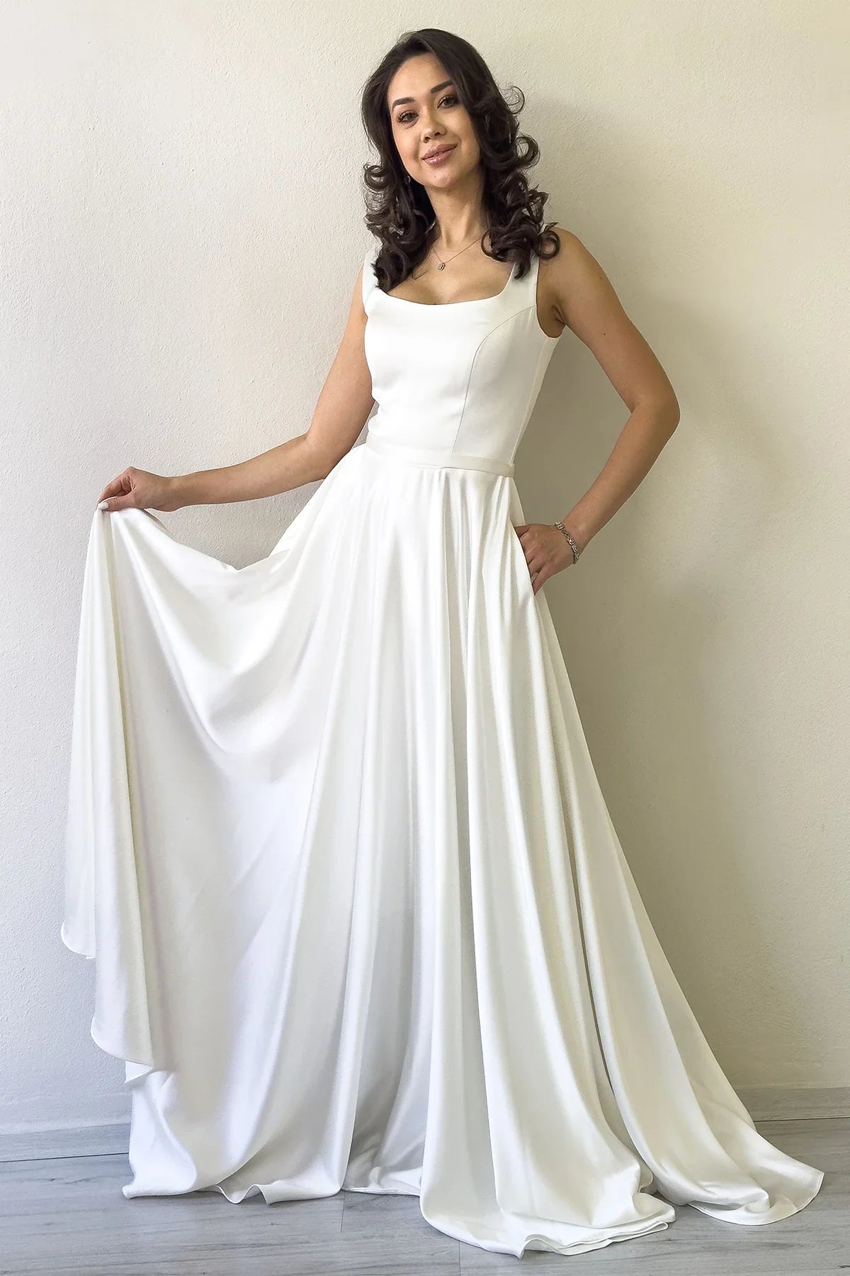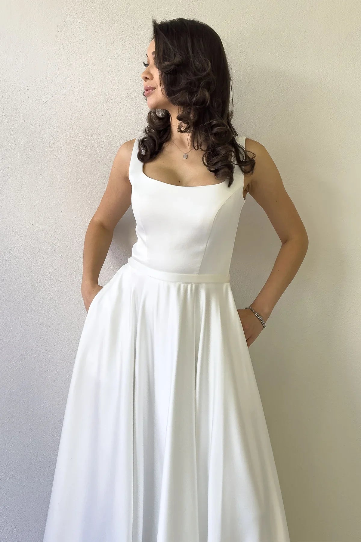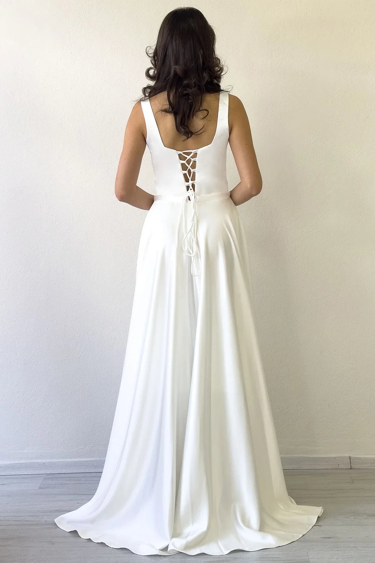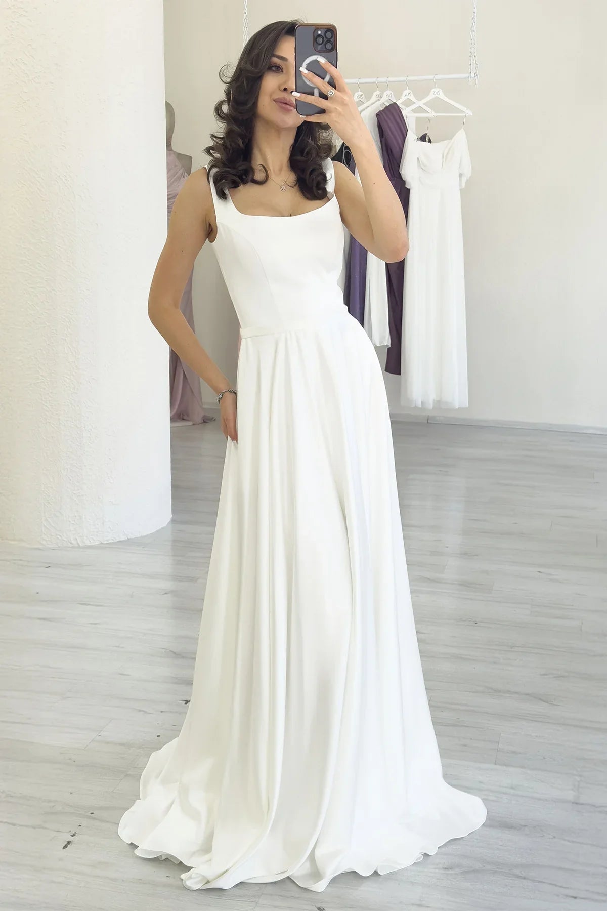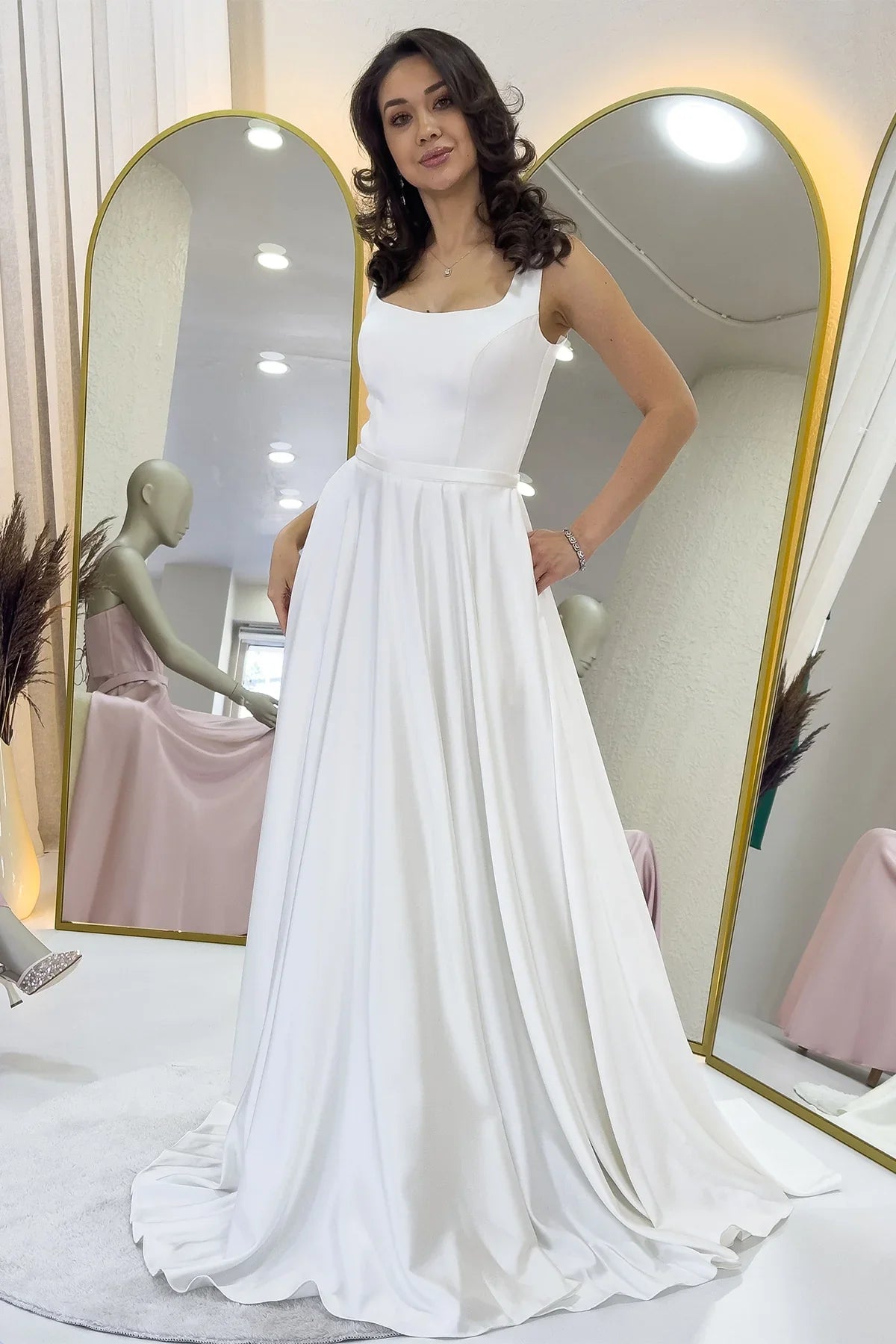Beyaz Kare Yaka Sırt Bağlamalı Askılı Saten Abiye Elbise