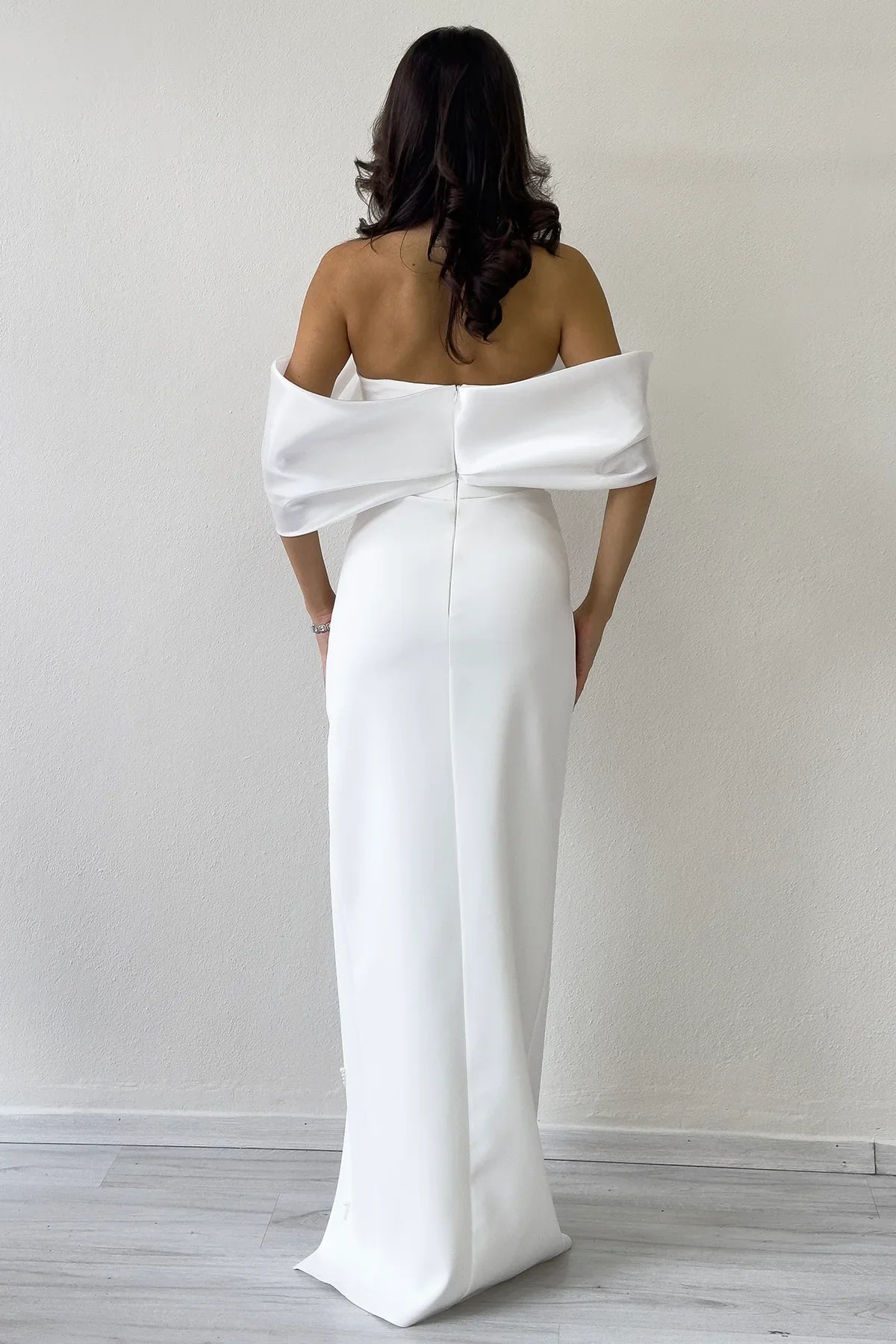 Beyaz Kayık Yaka Boncuk Detay Yırtmaçlı Nikah Abiye Elbise